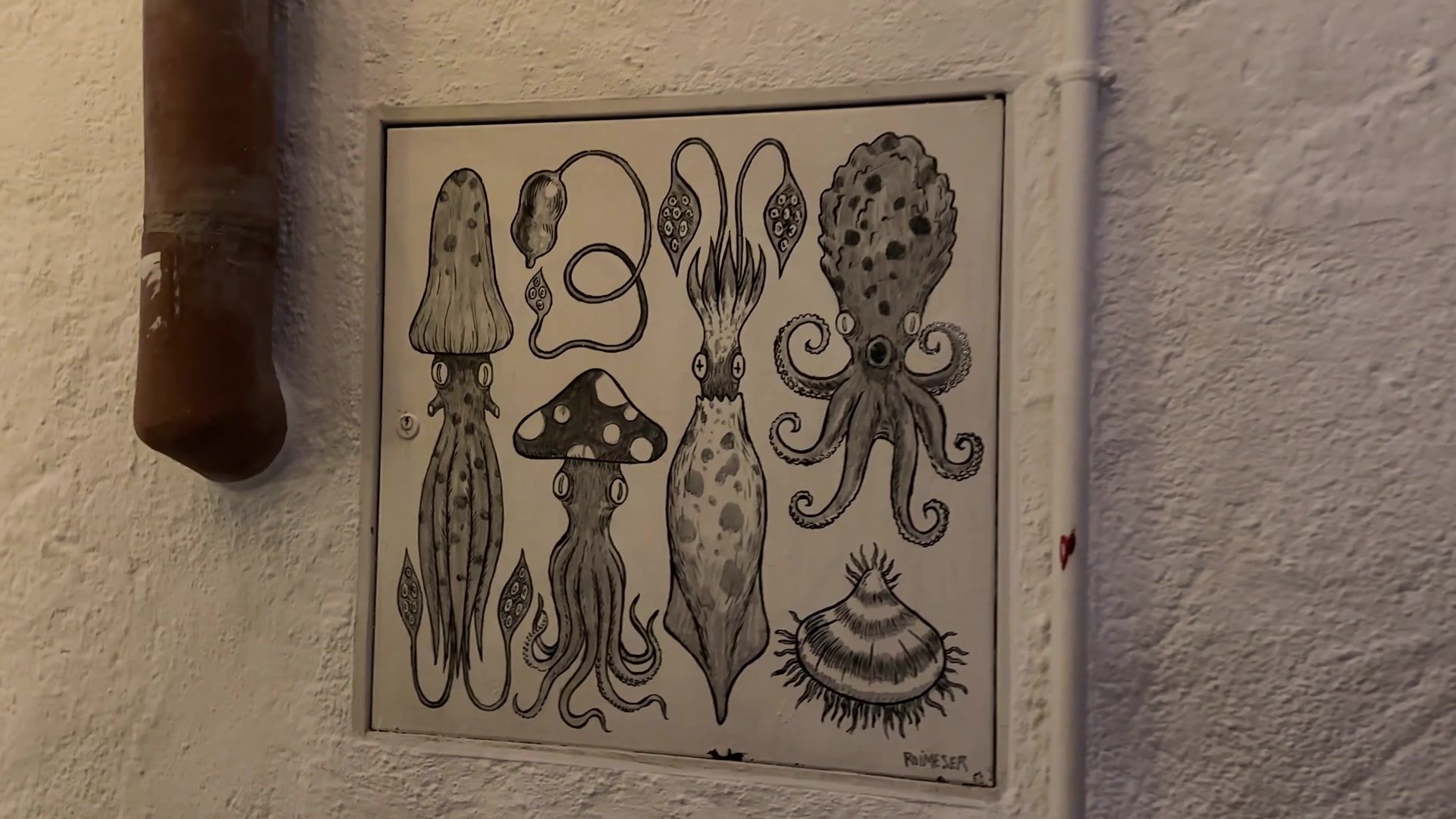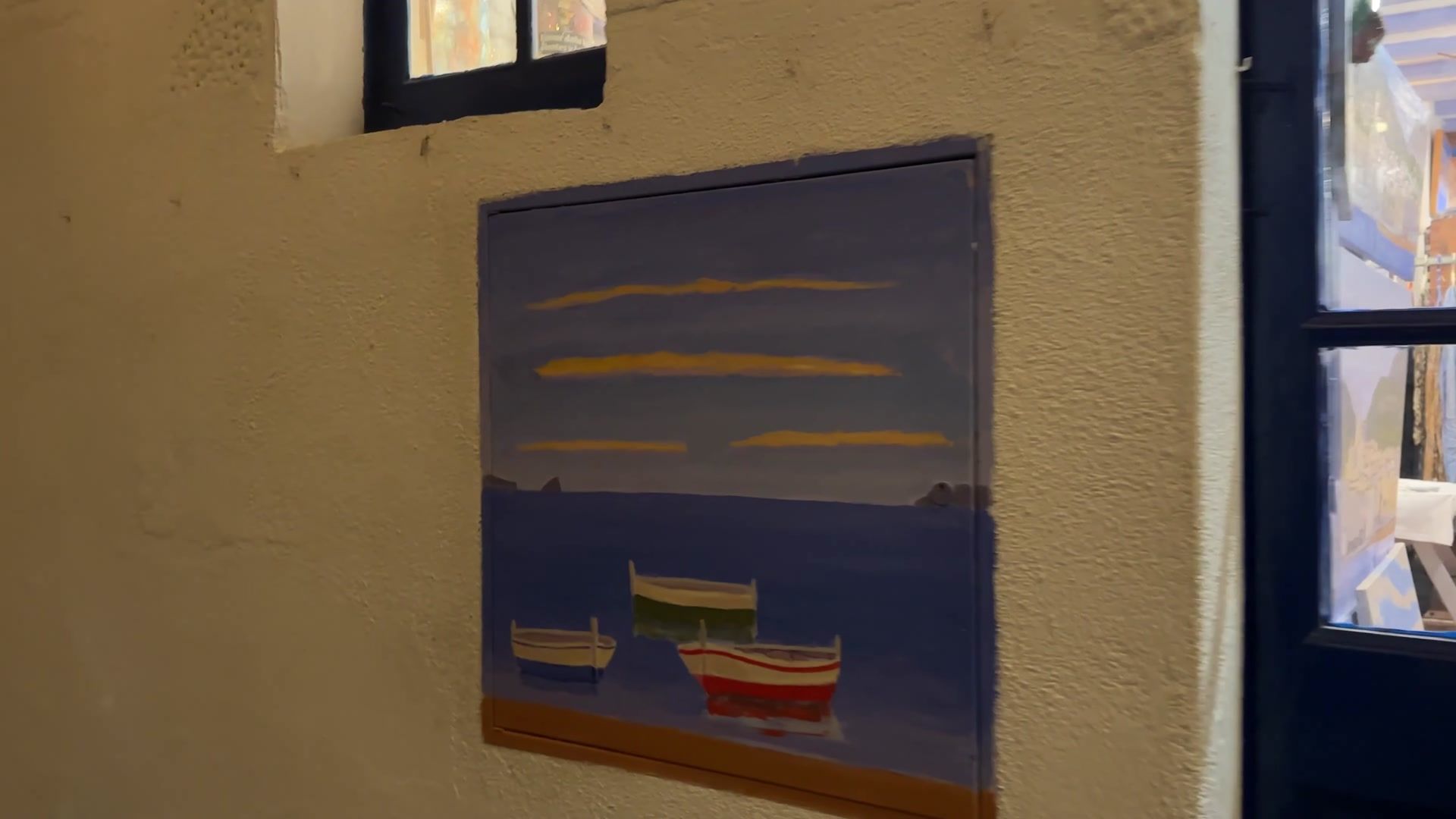 You had to be careful while walking because the road wasn't very smooth. Cars couldn't pass through the narrow streets, but they were beautiful. While wandering the streets, we had made our way down to the sea and walked along the promenade. We entered another street beautifully lit by street lamps. Everywhere was filled with pleasant details. An electrical box was decorated with a painting. We saw an interesting restaurant. Inside there were pictures and photographs. For those who wanted to sit outside, there was an open terrace.