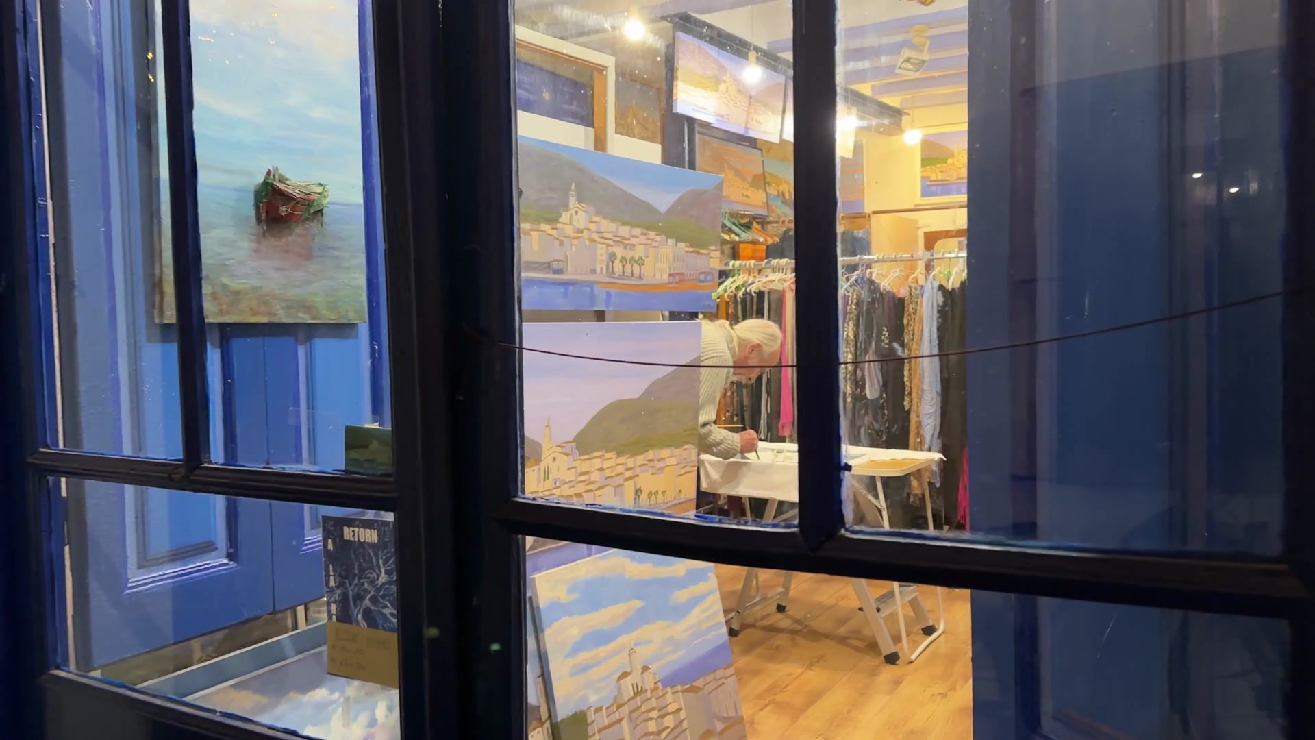 We saw a shop and decided to go down. There was a beautiful painting on an electrical or plumbing box. It was very funny and cute. The shop had lovely displays we could look at.