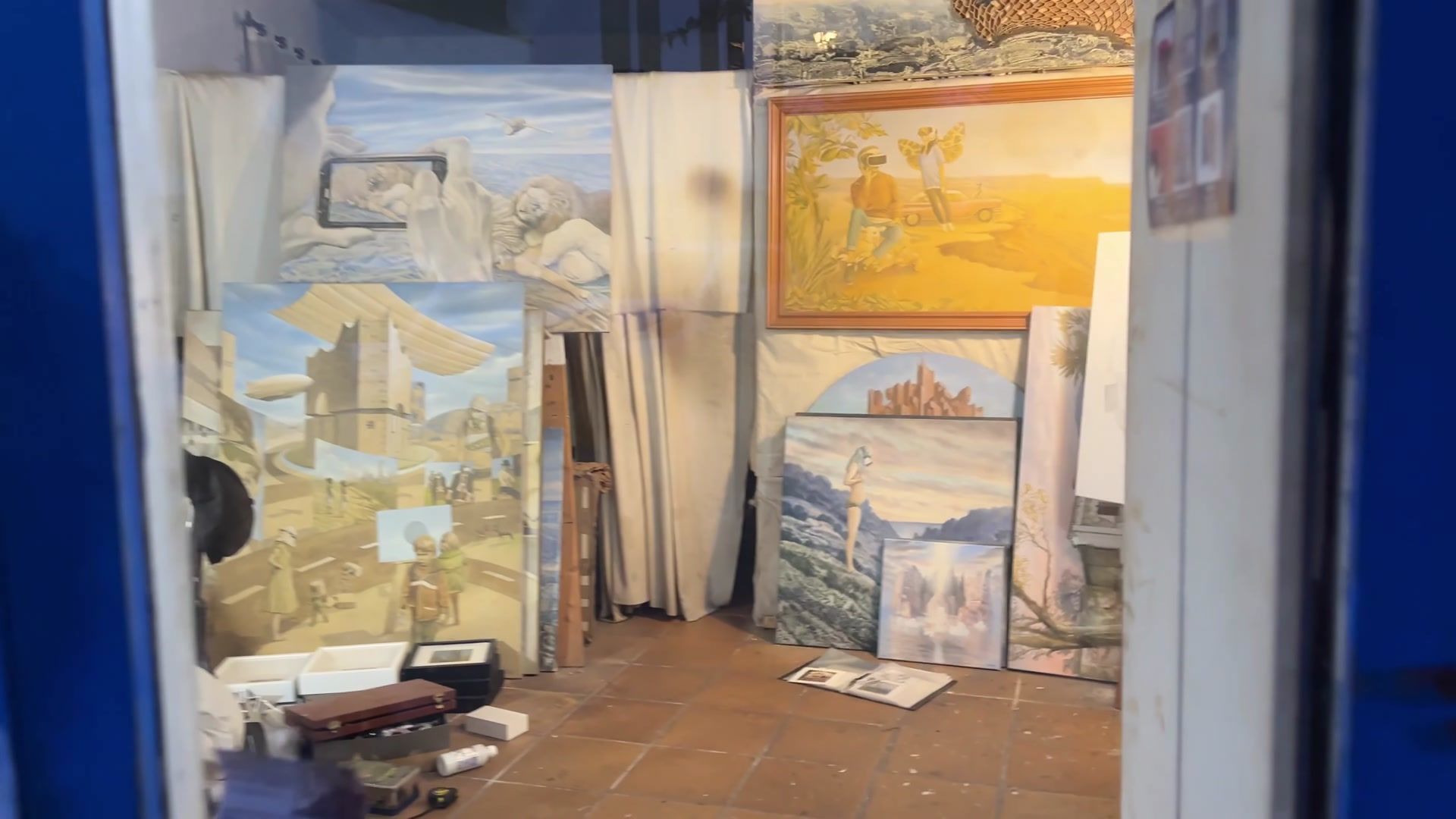 Next to it was another workshop. Inside, an artist was working on a painting. We watched them for a while. Music was playing in the artist's studio. The city was full of interesting things. For example, the ground was quite unusual, with pictures hanging everywhere. It was very enjoyable to look into the workshops through the windows. Everywhere was filled with nice details. The overall atmosphere was very good. In another workshop a girl was painting. These kinds of places looked very charming. Everywhere was decorated with lights for Christmas.
