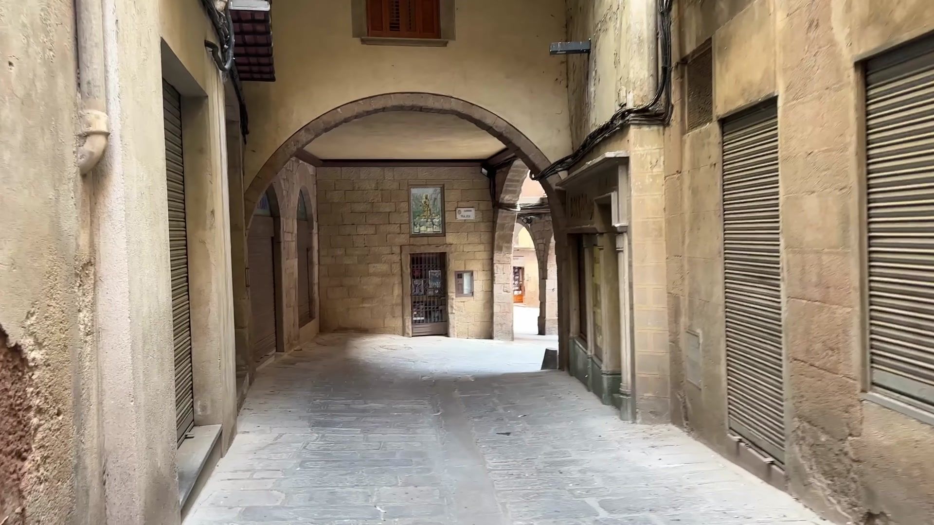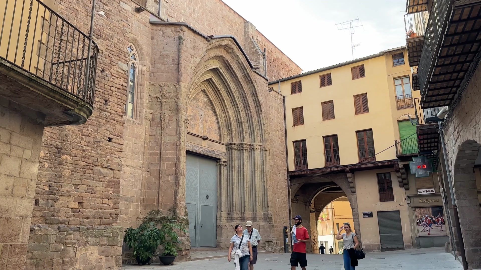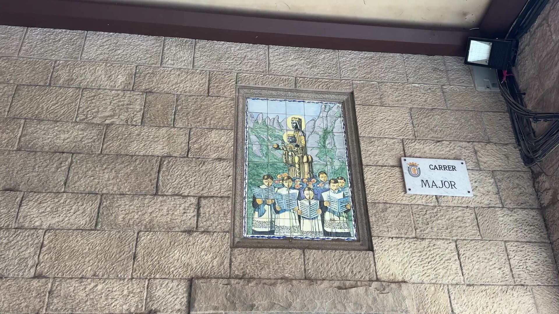 While wandering through the town we came across an art gallery. There was a painting hanging directly on the street. We went inside and examined the works. On the wall we found a plaque decorated with mosaics, which clearly depicted a boys choir singing and a mountain landscape. Then we headed towards the Church of Sant Miquel, a church dating back to the 10th century.