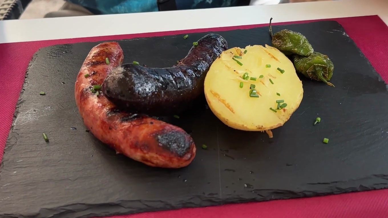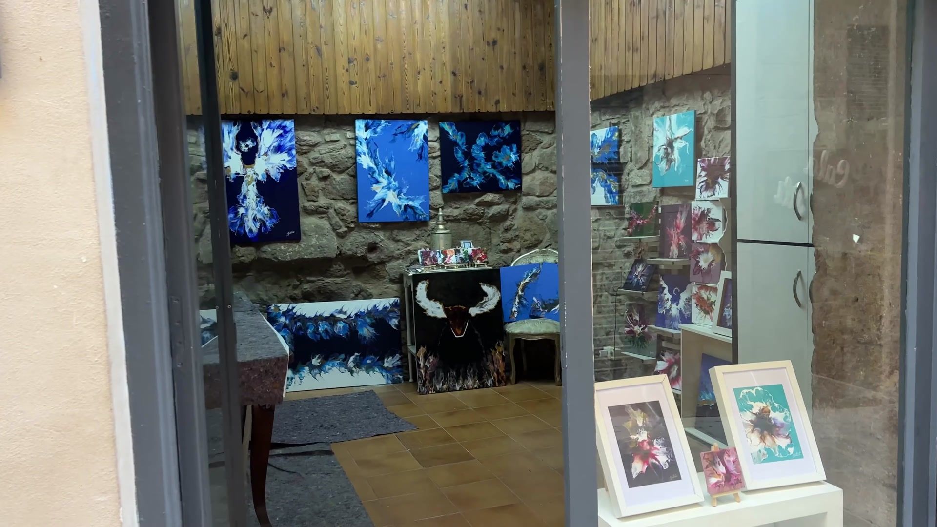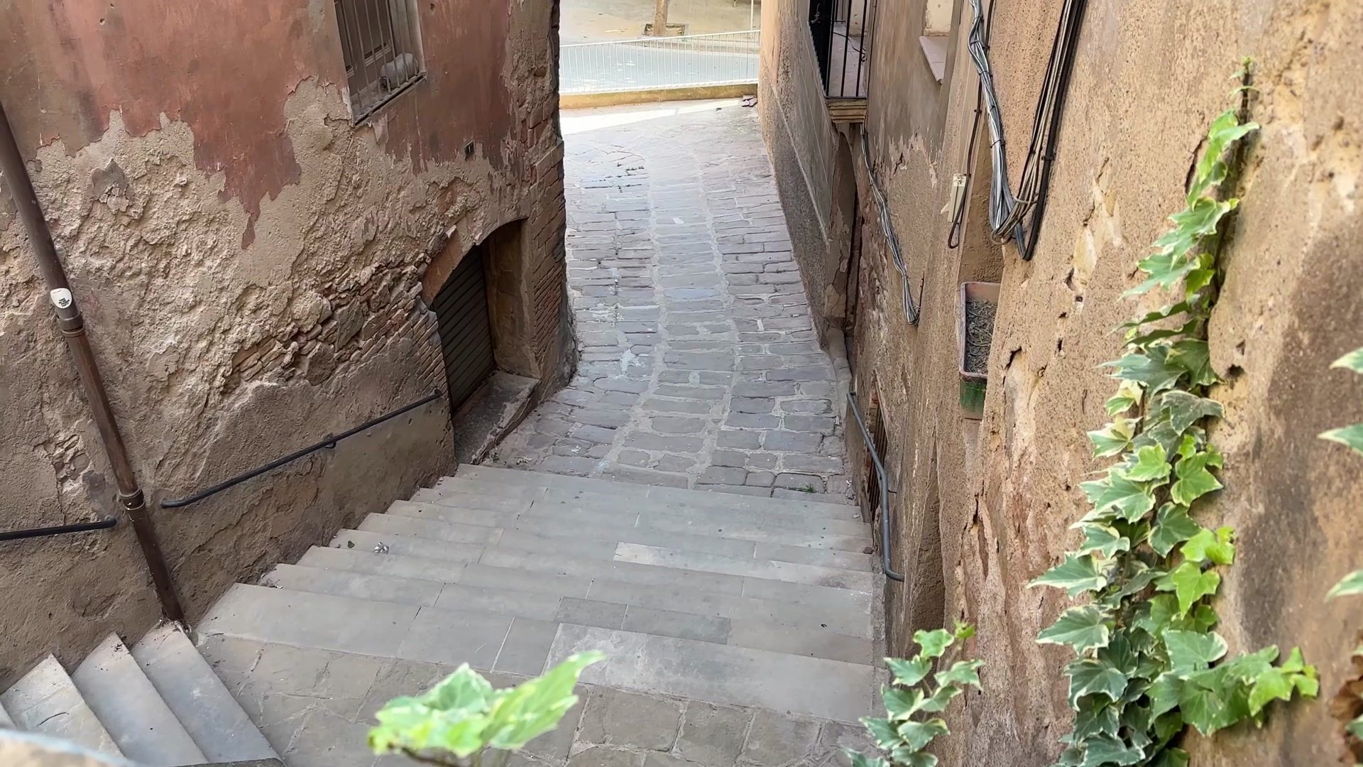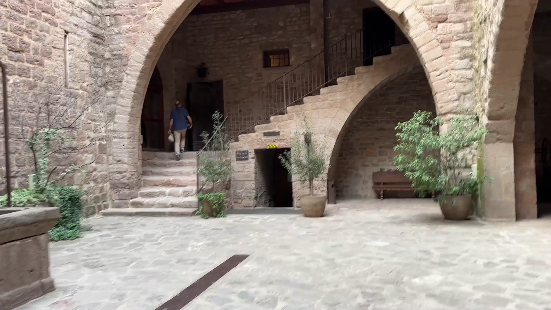 While wandering through the town we came across an art gallery. There was a painting hanging directly on the street. We went inside and examined the works. On the wall we found a plaque decorated with mosaics, which clearly depicted a boys choir singing and a mountain landscape. Then we headed towards the Church of Sant Miquel, a church dating back to the 10th century.