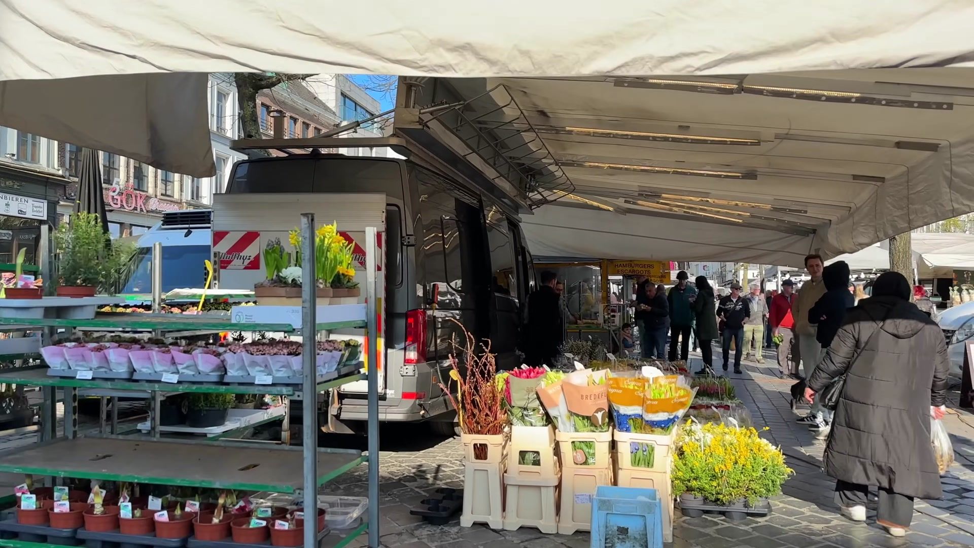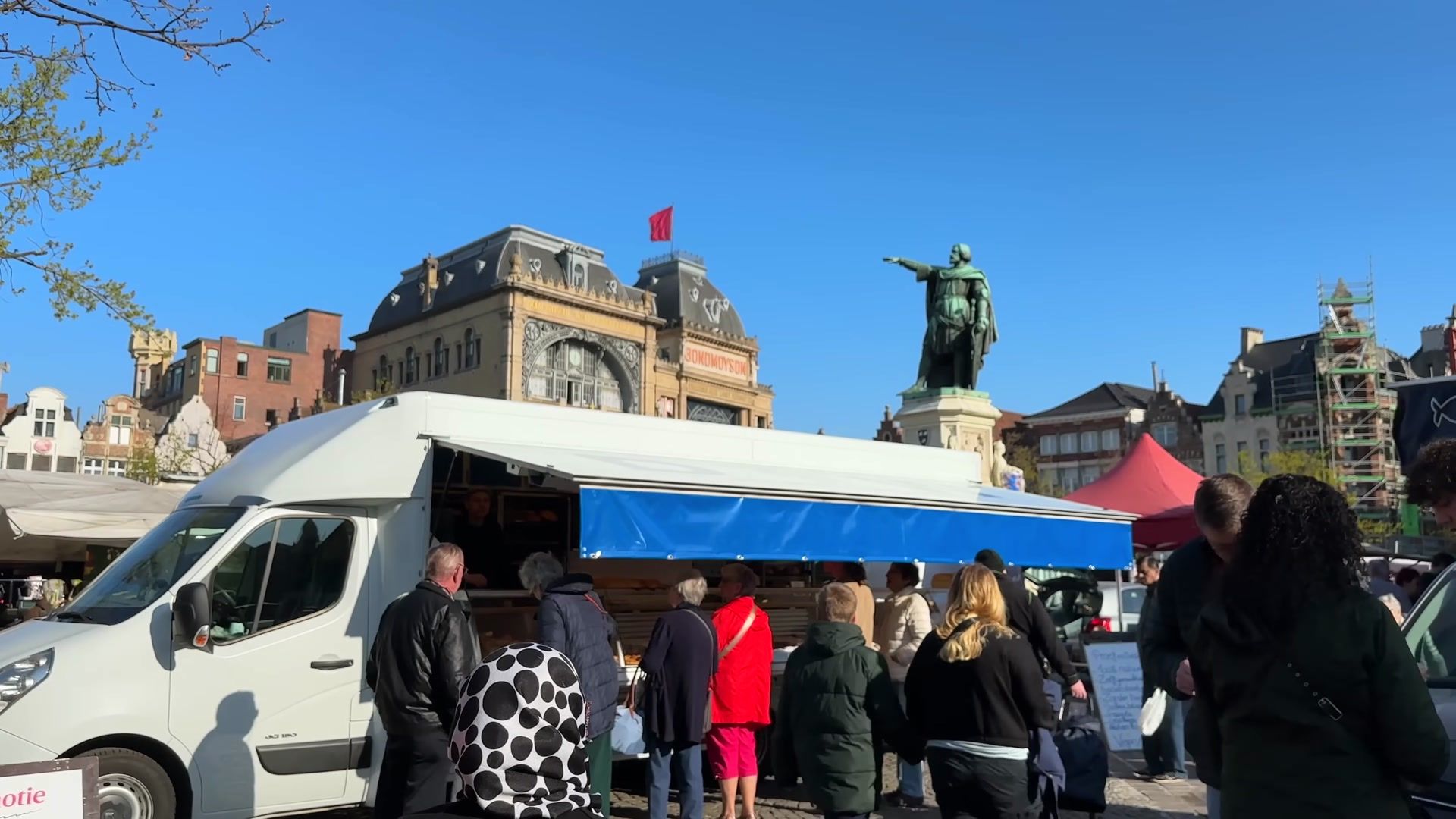 Pastries and different baked goods are also sold here. Of course, Belgium is famous for its sweets, especially its waffles. They also sell fish and seafood here. The crowd was quite large and it seemed like they were all locals because tourists had not yet arrived. It was around nine in the morning. They even sell coffee here. Then we walked toward the square. I do not know how it is on weekdays but on Fridays it is always like this. Because the Friday market has always been held here since ancient times. This tradition is still alive and embraced by the locals.