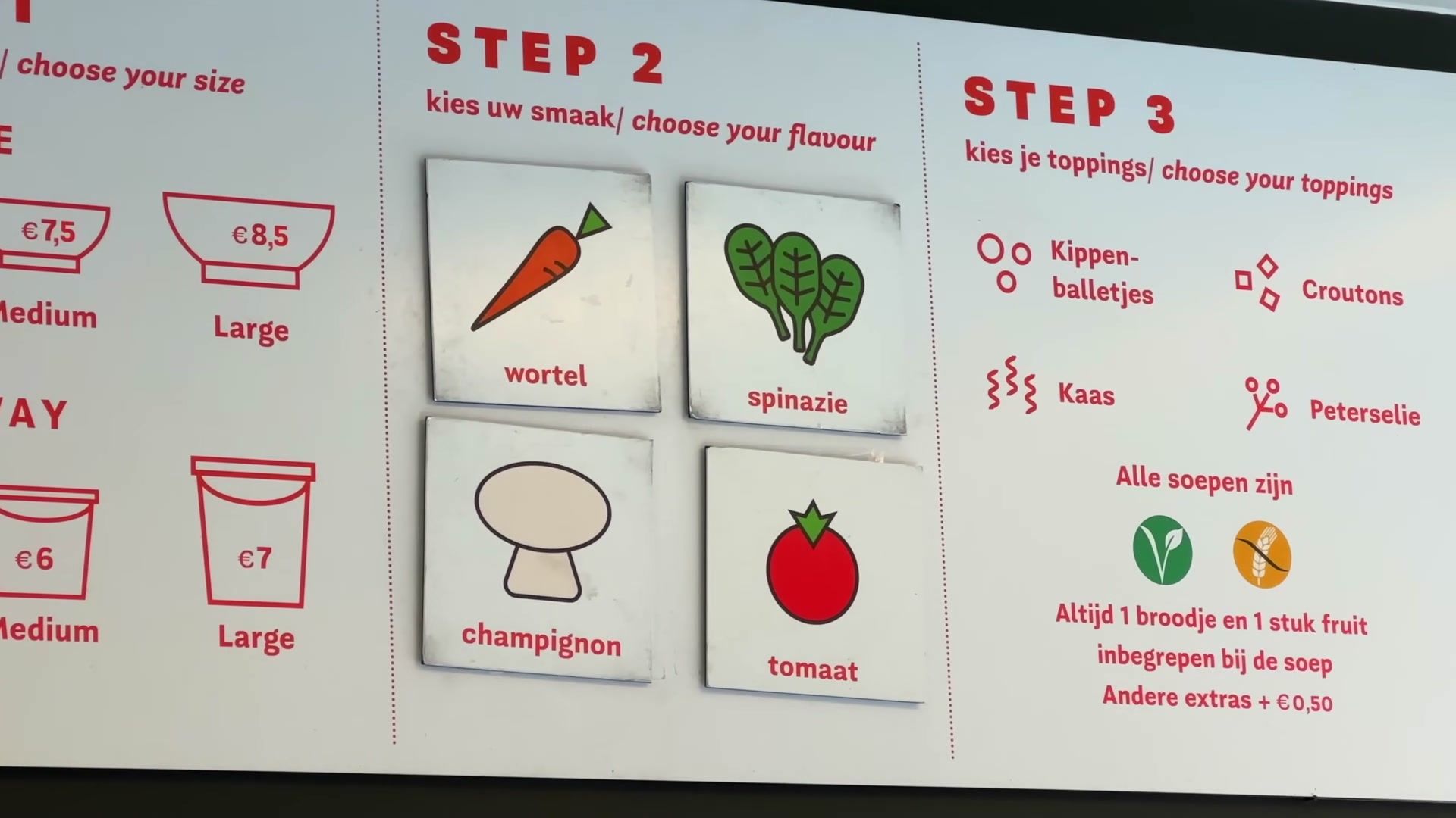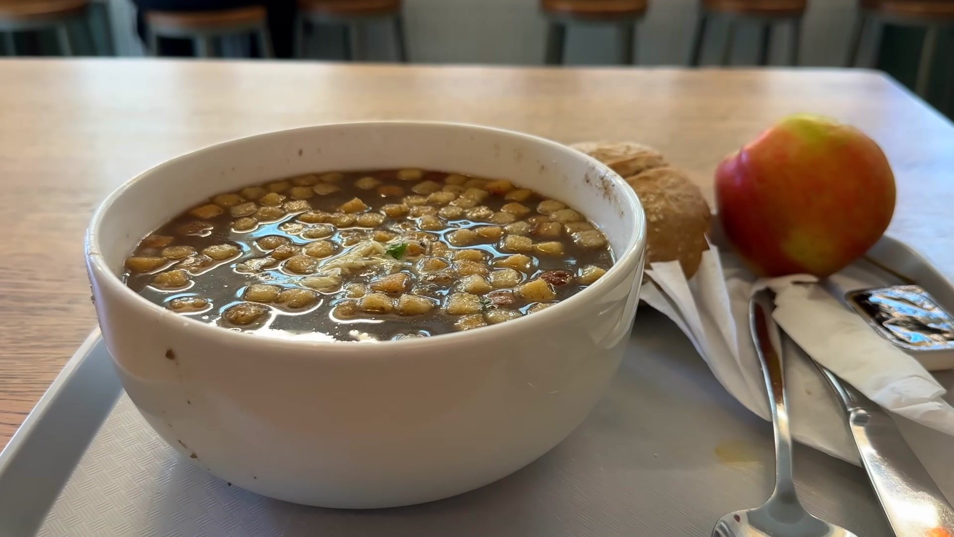You cannot come to Ghent without trying beer, fries, fast food and a sweet waffle on top. It may sound terrible, but if you eat in moderation, it is fine. The place I visited had four kinds of soup, carrot, tomato, mushroom and spinach. I ordered seventy-five centiliters, a giant bowl. You can also get two smaller portions if you want. The price is six, eight, or ten euros. Very cheap for Belgium. The menu includes an apple, butter and bread. Really filling.