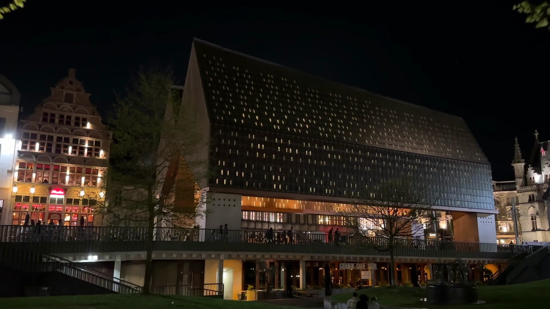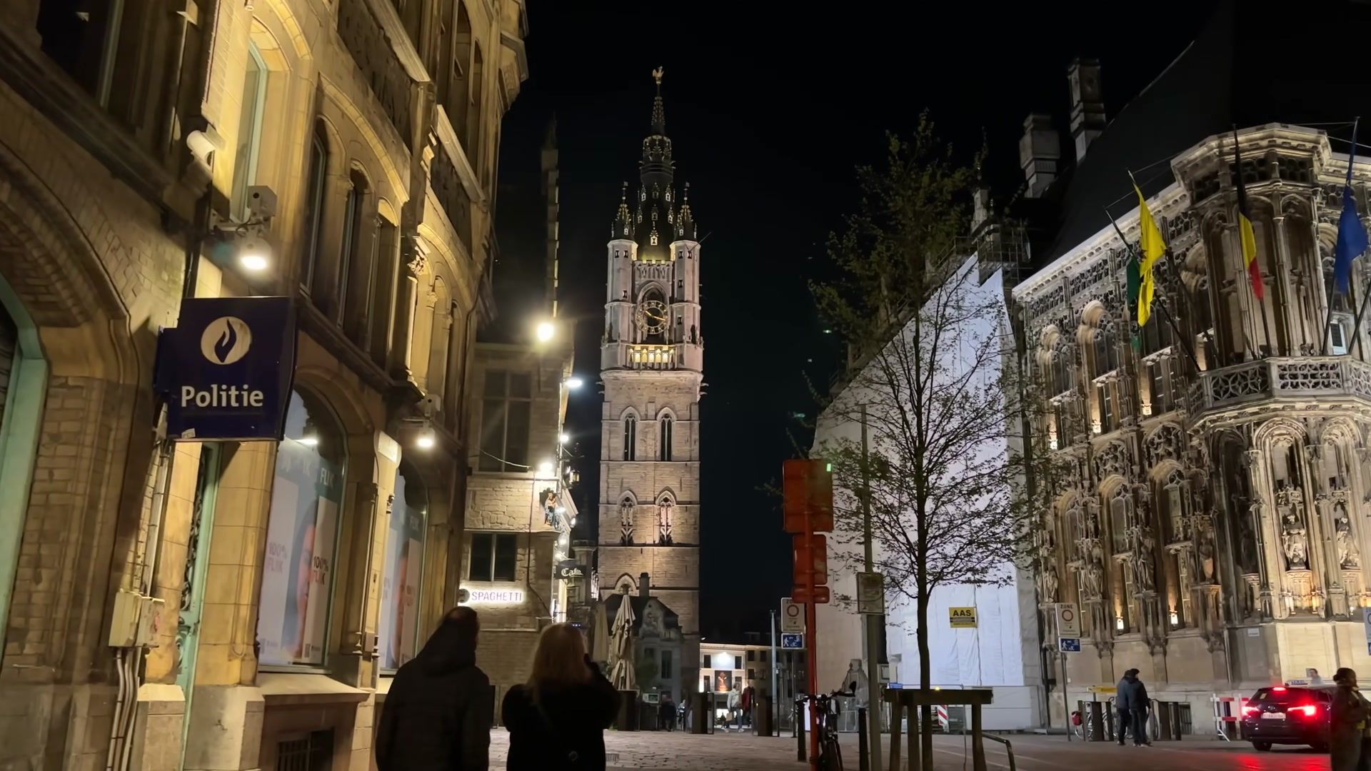 I did not like the Stadshal much during the day, but at night with the lighting, it looks really impressive. When you walk inside, the reflections of the light create a very nice effect. At least it is meaningful as a place to shelter from the rain because it rains often here. From the Stadshal, you can see the most important places in the city. In front of you is Saint Nicholas Church, to the right the Belfry, behind it the cathedral and on the left the city hall. So in a way, it makes sense.