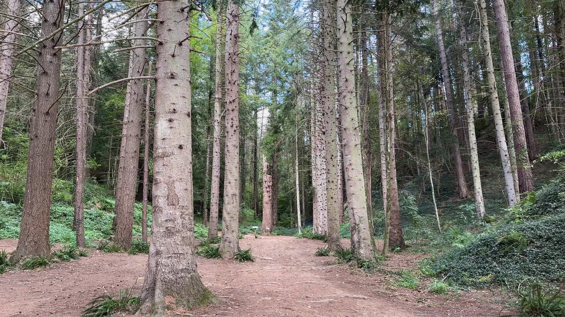 There were very few people in the park, with only three cars, including ours. At the entrance there is a welcome sign. You can walk here with dogs, but there's a sign indicating that they must be on a leash. It turns out that small pine trees are being grown here and they might even be for sale. We walked around to find out the entrance fee, which was 5 euros. They gave us a map and two candies, which were included in the fee. We started walking in the park. It’s open on weekends until 5 pm and until 2 pm on Saturdays. While walking through the forest, we didn't see anyone except a few people.
