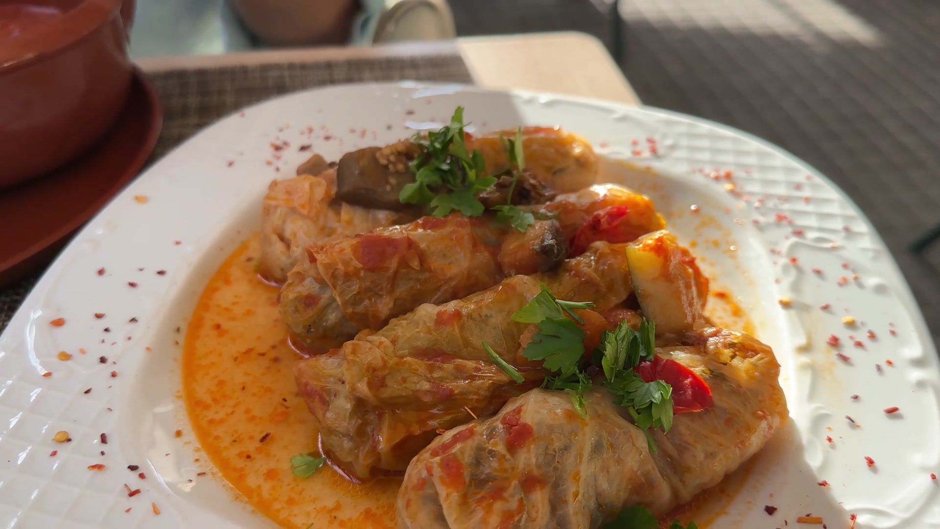 We placed our orders: I had borscht and stuffed cabbage rolls, while my friend opted for pelmeni and khinkali. We also ordered drinks. I asked for kvass and it was really nice, made in Ukraine. My friend had a fizzy drink. We toasted to each other and celebrated. The borscht was incredibly delicious and I was very satisfied with it. The kvass was great too, but I couldn’t finish the cabbage rolls because they were a bit too herby and tasted somewhat bland. Still I had two of them and we took the leftovers with us. Overall it was a lovely meal.