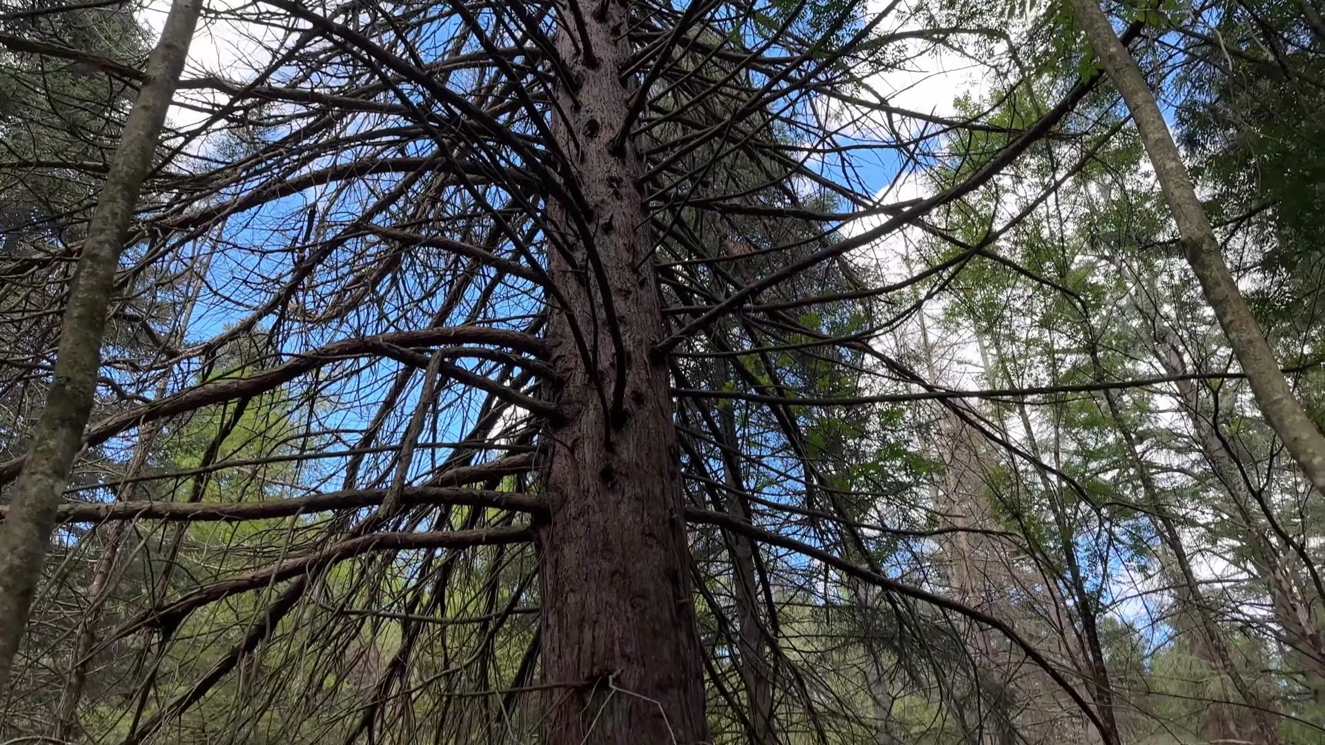 This giant sequoia really looks impressive. It reaches a height of 33 meters, with a diameter of 176 centimeters. This tree was planted in 1911. Its trunk is so large that it's impossible to hug it. But when I approached and heard the sound from within, it felt like there was a hollow inside. The texture was very soft, like a carpet. It's really big and interesting. Walking around it, I felt like a little person in a land of giants. Walking through the forest, we almost lost ourselves in it. I really liked this sequoia.