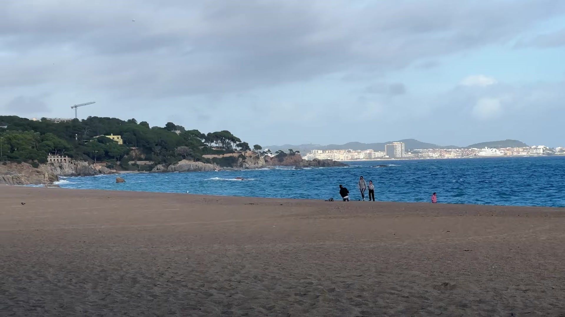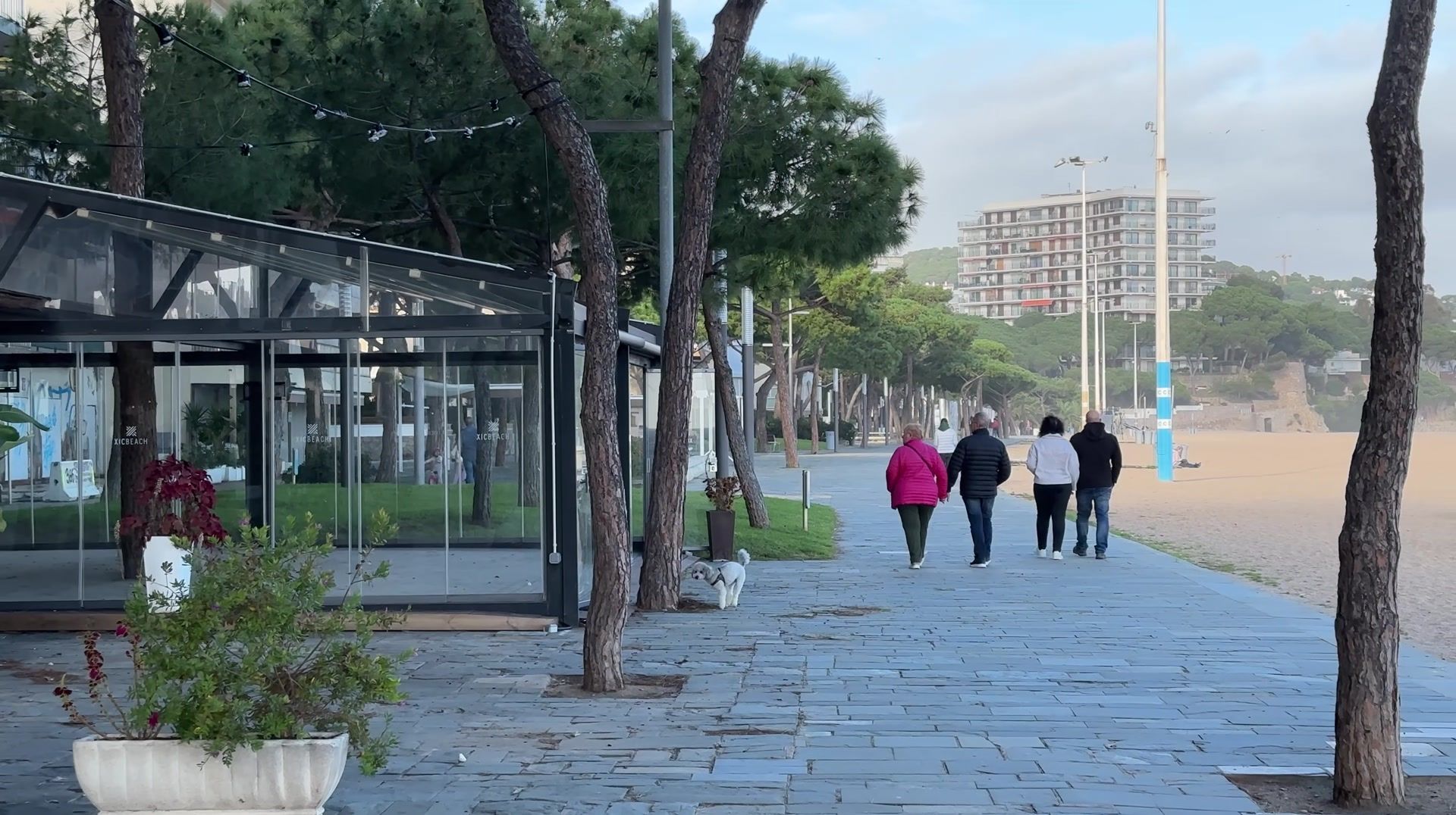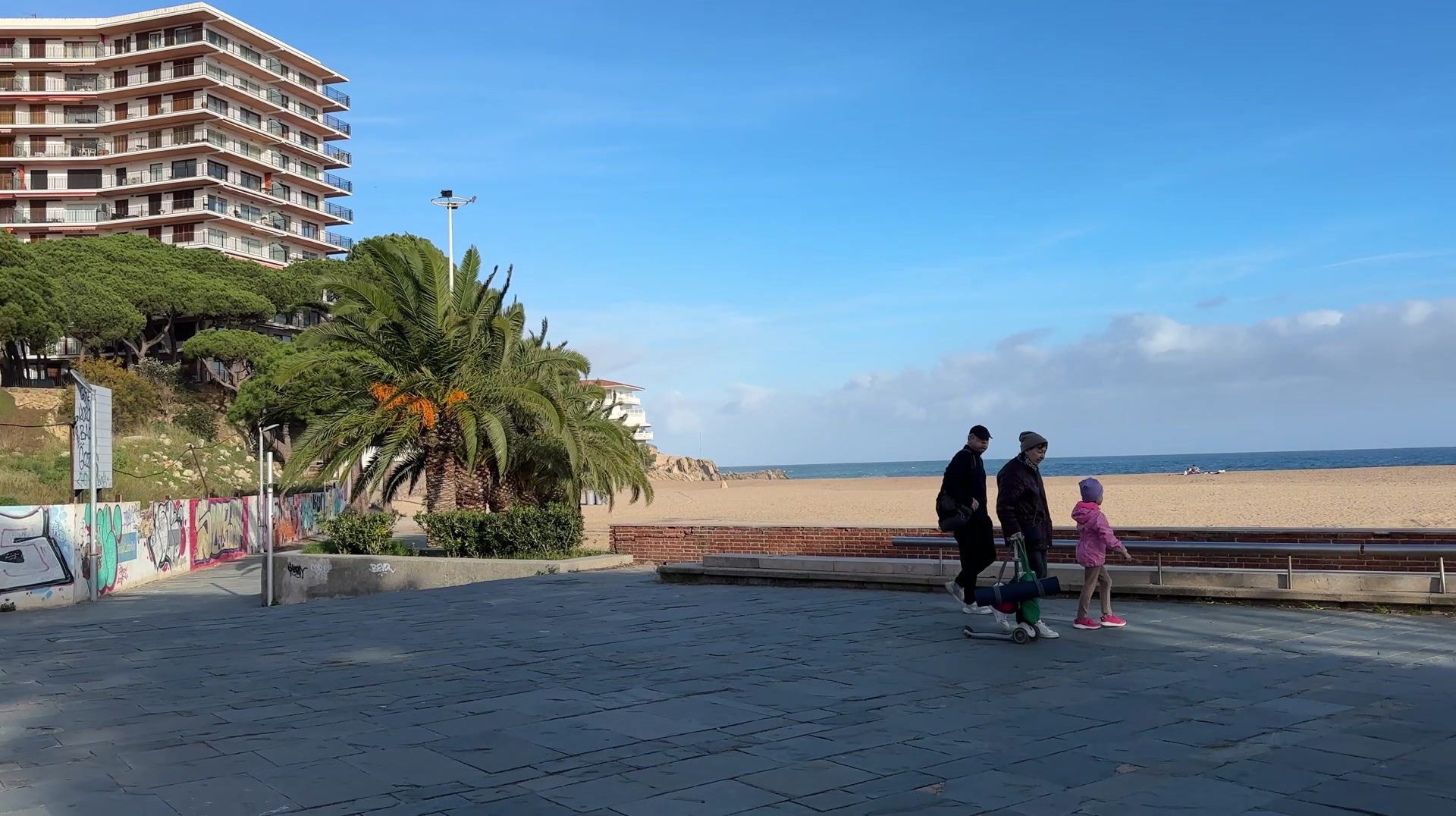 We walked towards the seaside, where there are beautiful palm trees. However, nearby there is an unfinished new building by the sea. Such views can be seen often in Costa Brava. In winter the windows are closed because there are no tourists. This area is made up of holiday apartments and right now it's the off-season. There are very few people around. In summer this place is really crowded with a completely different atmosphere. We had considered coming here in summer but couldn't make it. Winter here is wonderful, with a wide sandy beach that can easily accommodate a large number of tourists. There's no problem finding a spot on the beach. A few people were walking and we also went for a walk. This is a tourist area with only tourists walking around. Almost everything is closed: shops, cafes and restaurants. This makes me think that living here in winter might be really difficult because everything is shut.