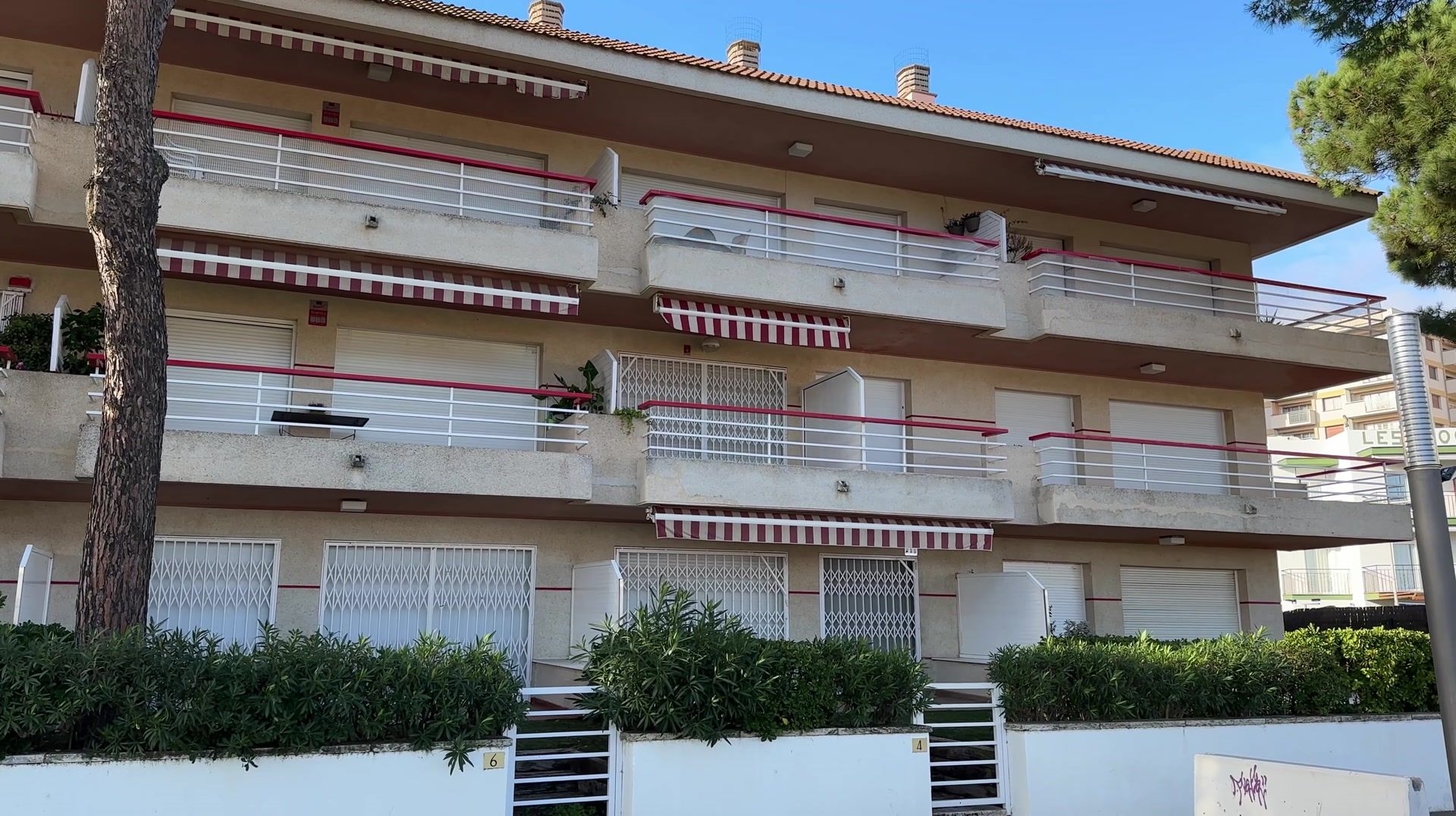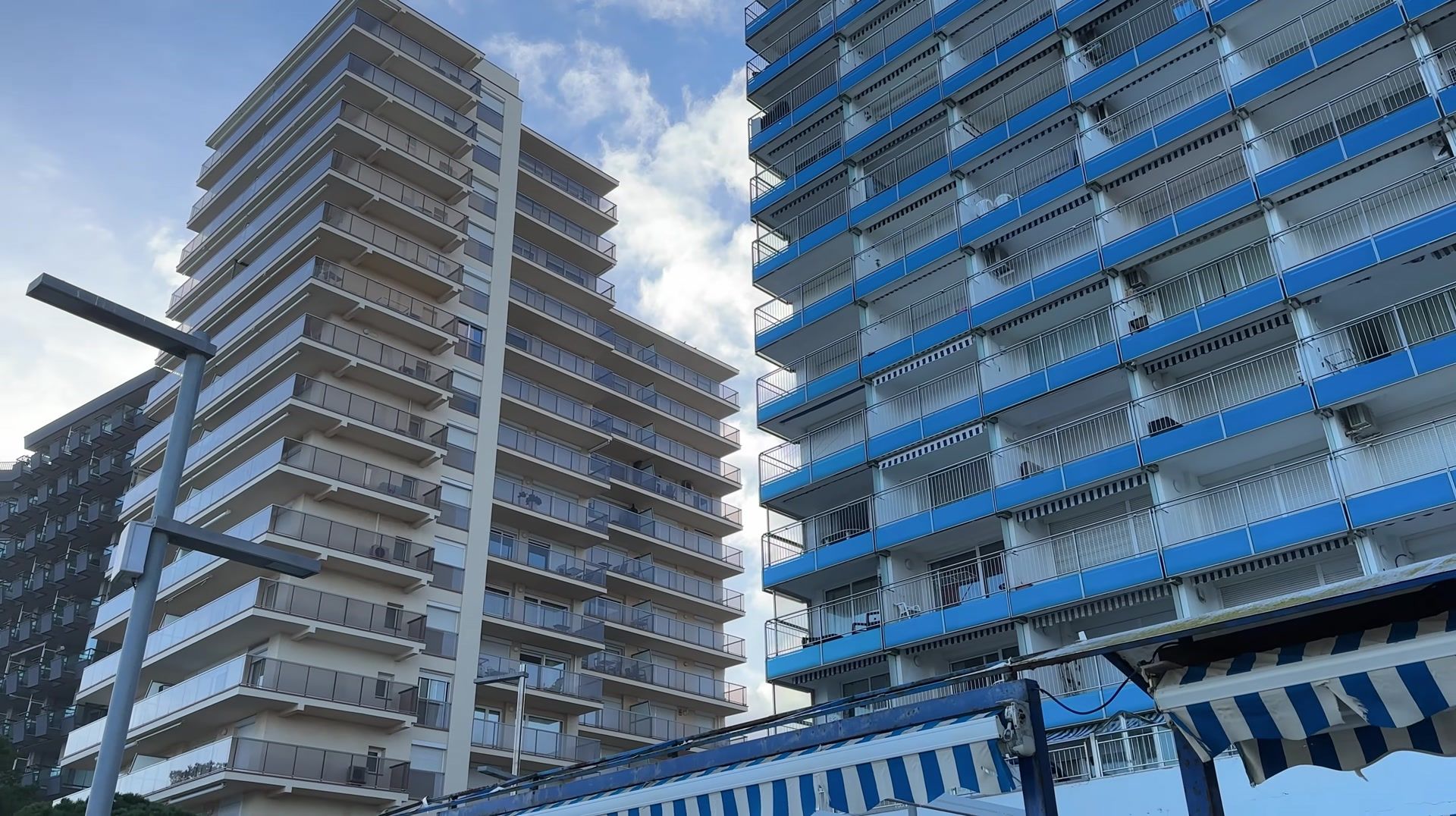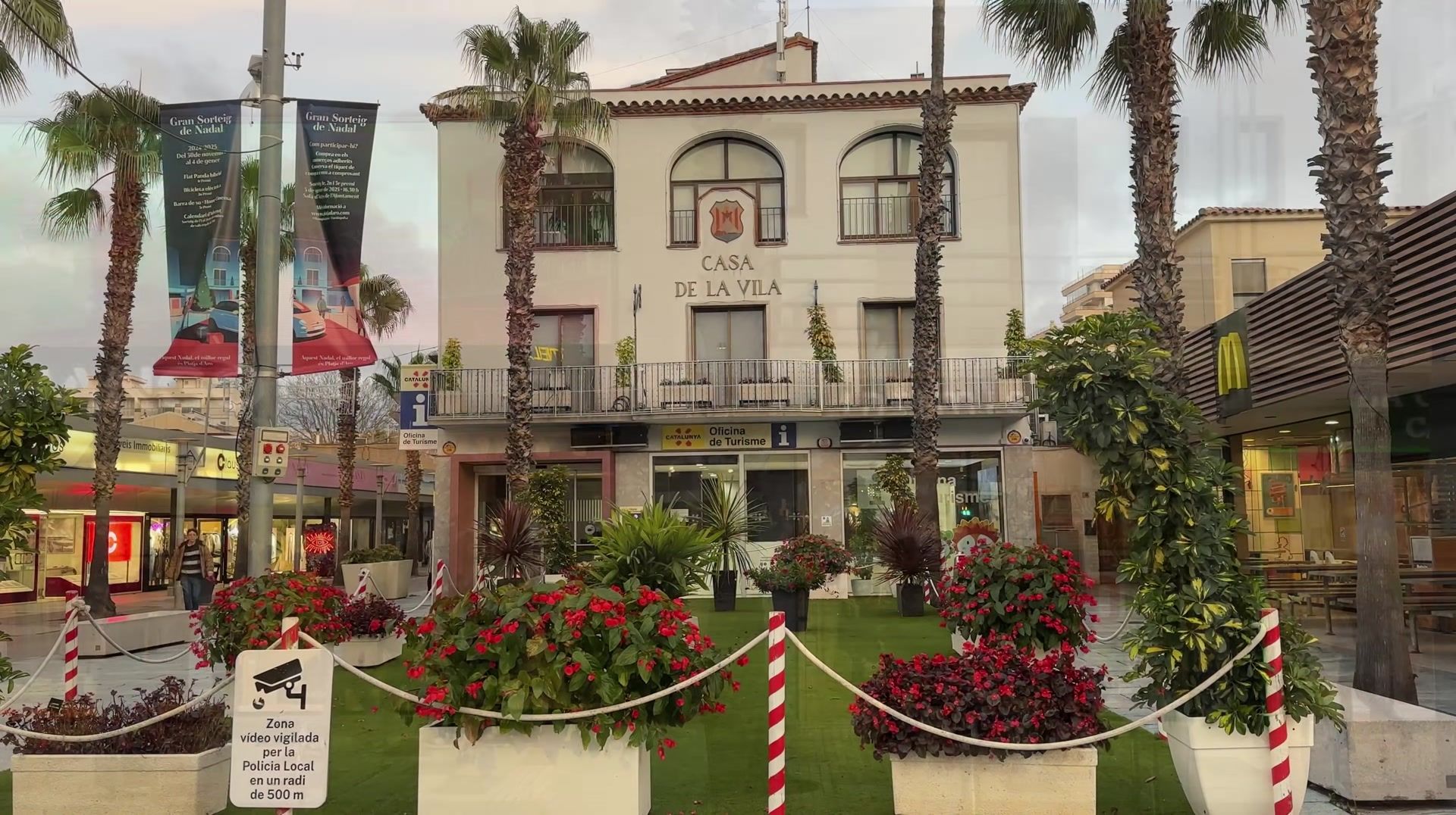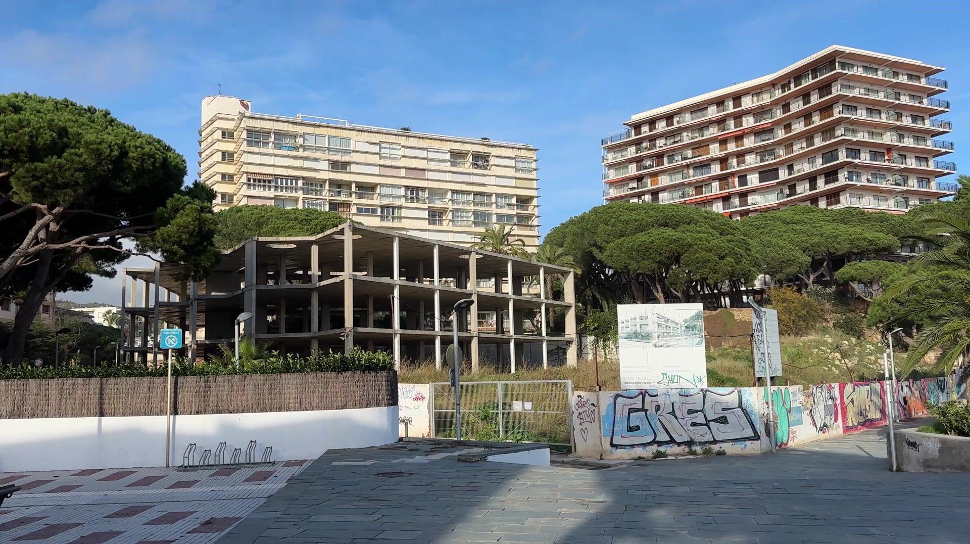 We walked towards the seaside, where there are beautiful palm trees. However, nearby there is an unfinished new building by the sea. Such views can be seen often in Costa Brava. In winter the windows are closed because there are no tourists. This area is made up of holiday apartments and right now it's the off-season. There are very few people around. In summer this place is really crowded with a completely different atmosphere. We had considered coming here in summer but couldn't make it. Winter here is wonderful, with a wide sandy beach that can easily accommodate a large number of tourists. There's no problem finding a spot on the beach. A few people were walking and we also went for a walk. This is a tourist area with only tourists walking around. Almost everything is closed: shops, cafes and restaurants. This makes me think that living here in winter might be really difficult because everything is shut.