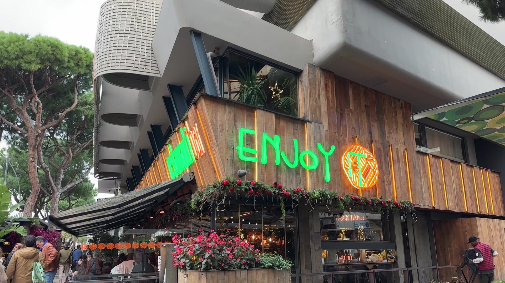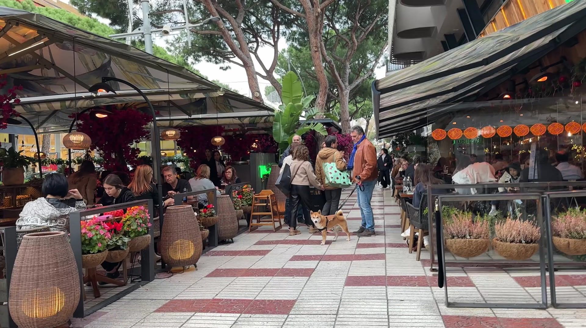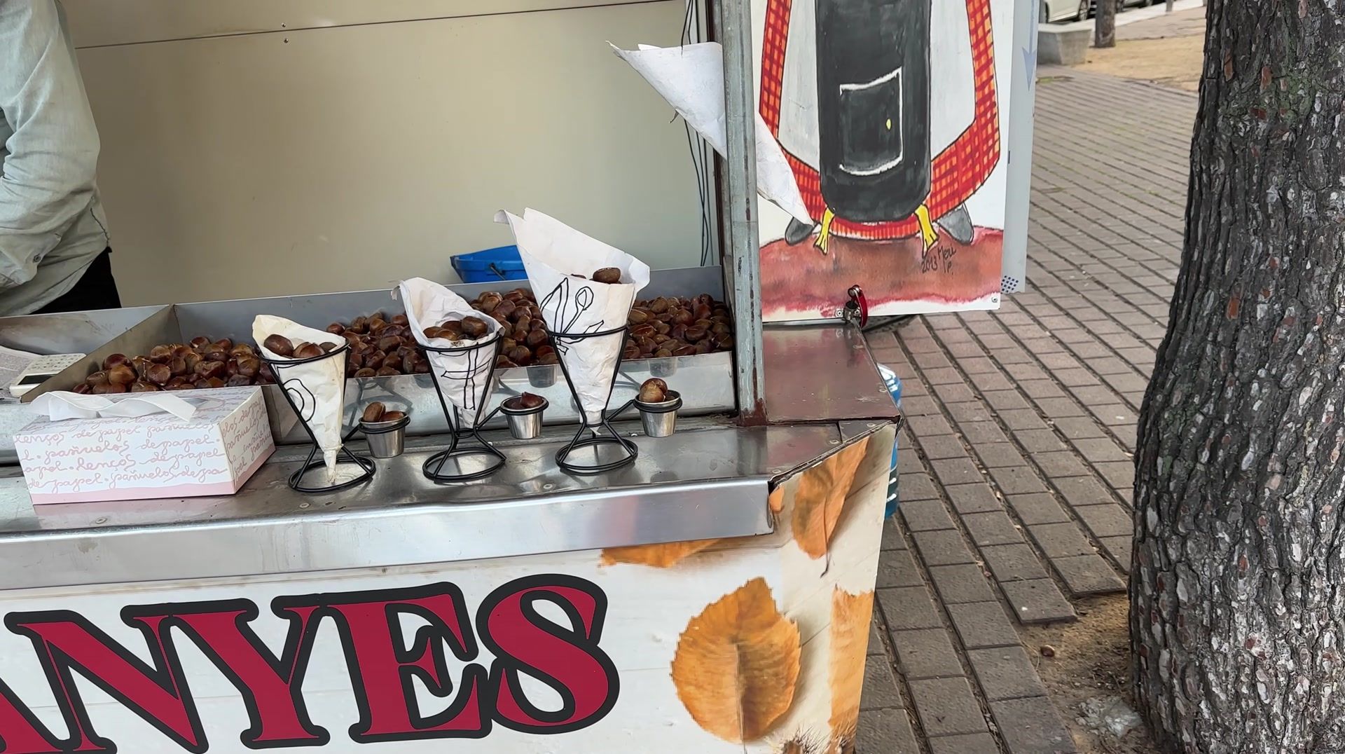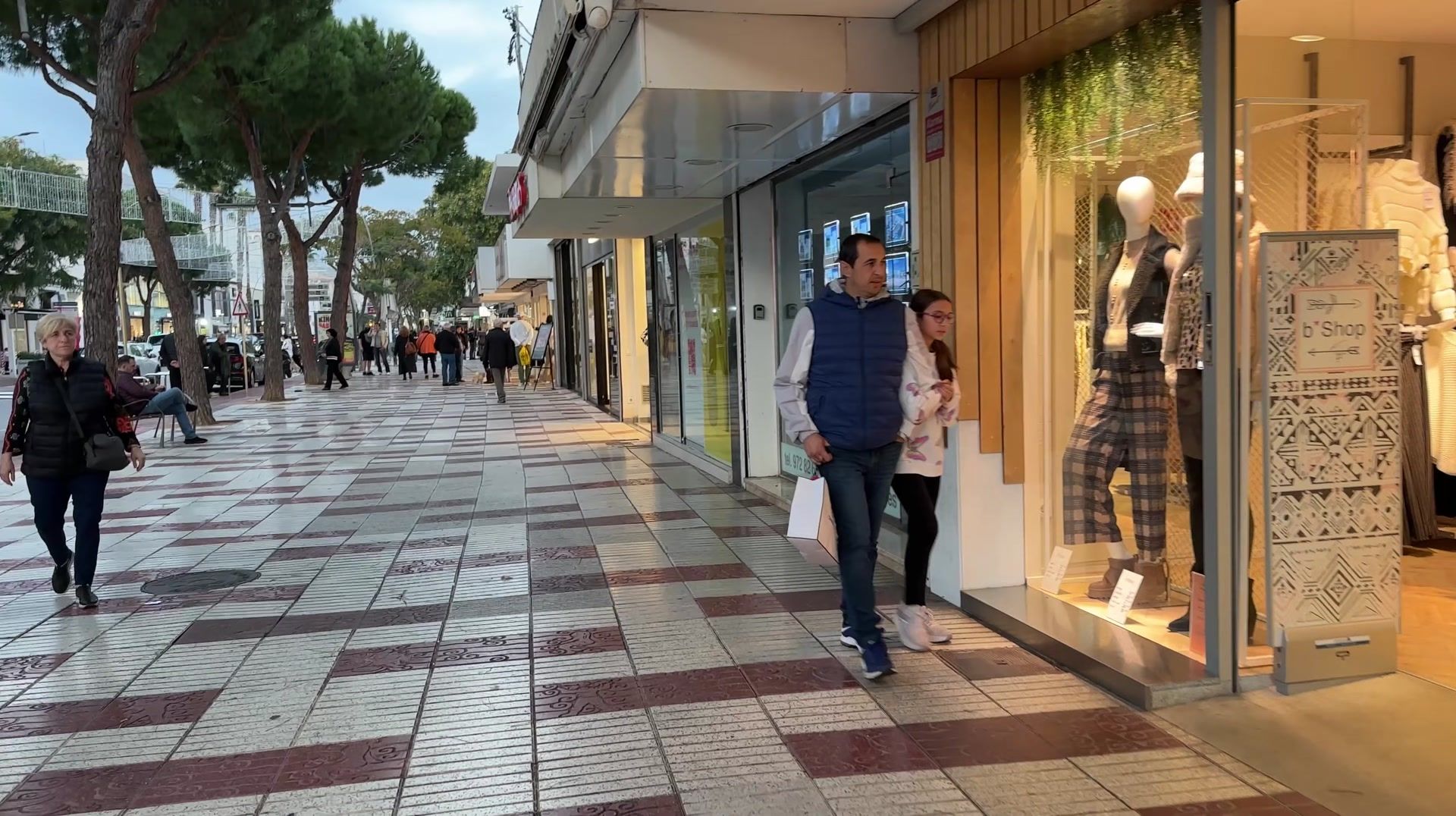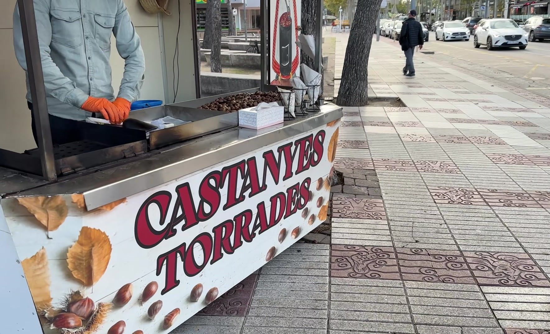 The area is very calm during the off-season. There is no visible movement, but there is still life with a few cars parked. We saw a large parking lot that was completely full and we passed through a lot of streets while looking for parking. On the second beach line everything is also closed, except for one restaurant and across from it, there's a place called Ibiza Lounge, but there are no tourists. Still a few bars are open and there are a few customers. The Manhattan Disco Bar doesn't seem to be opening, but some other places are still open. Also a few shops are open, like a perfume shop. Chestnuts are also being sold here, with prices ranging from 5, 7, to 12 Euros. However, the chestnut season is almost over and these are the last days to eat them.