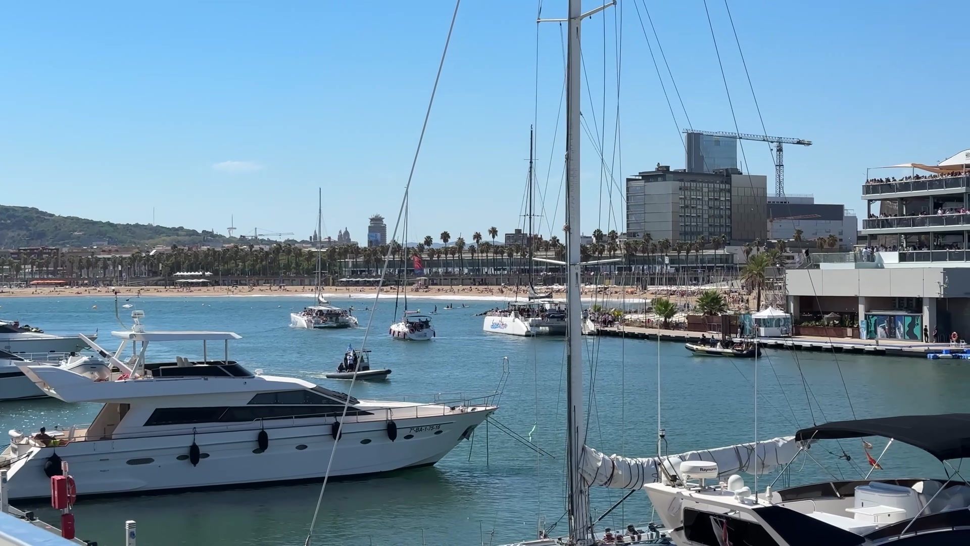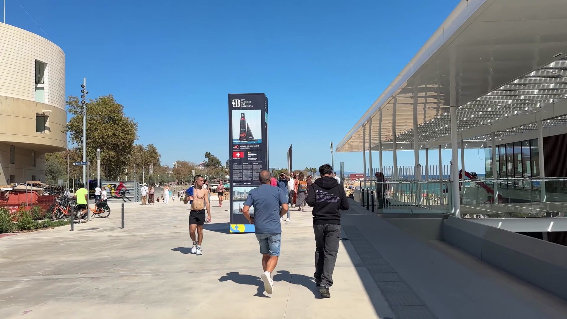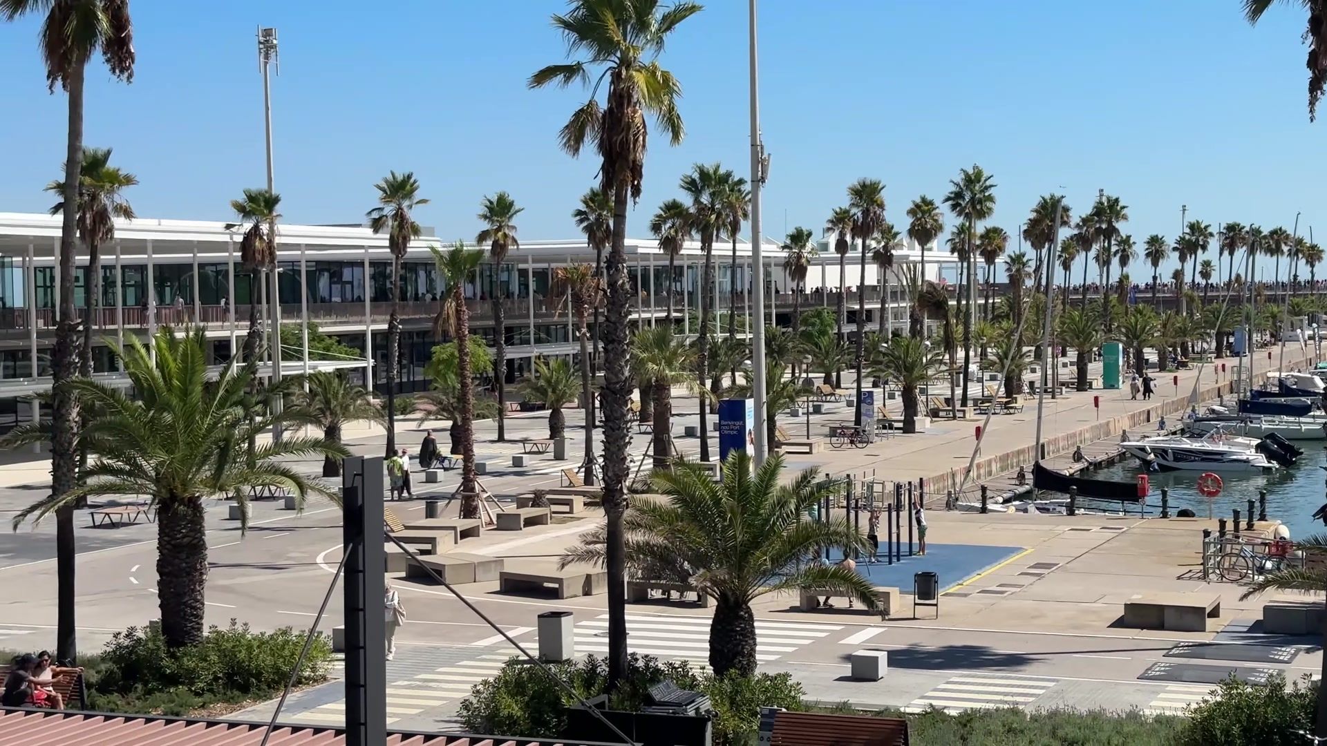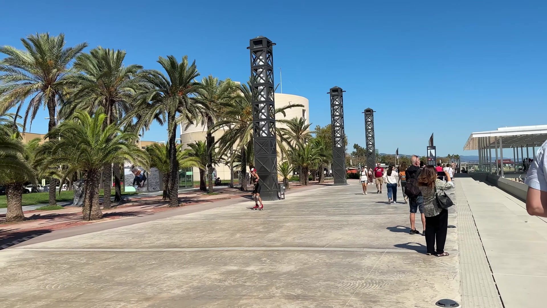 This is a fantastic space for walkers, touristsand cyclists. There’s a large promenade aboveand it’s crowded right now, almost no empty spots. People were watching the regattaand we joined them. Palm trees have always been here, giving it a lush vibe, but now it’s even more organized and clean. New restaurants have opened below, currently only two or three, but more are expected to come over time. We watched the American regatta taking place in Barcelona. Downstairs, there are plenty of benches and spaces to sit or lie down. It’s a great relaxation spot. In the distance, you could see the sails of the regatta boats. Some construction is still ongoing, but that’s normal as it wasn’t finished before the regatta. What mattered was that the area had opened and was ready for use. These little details will be improved over time.