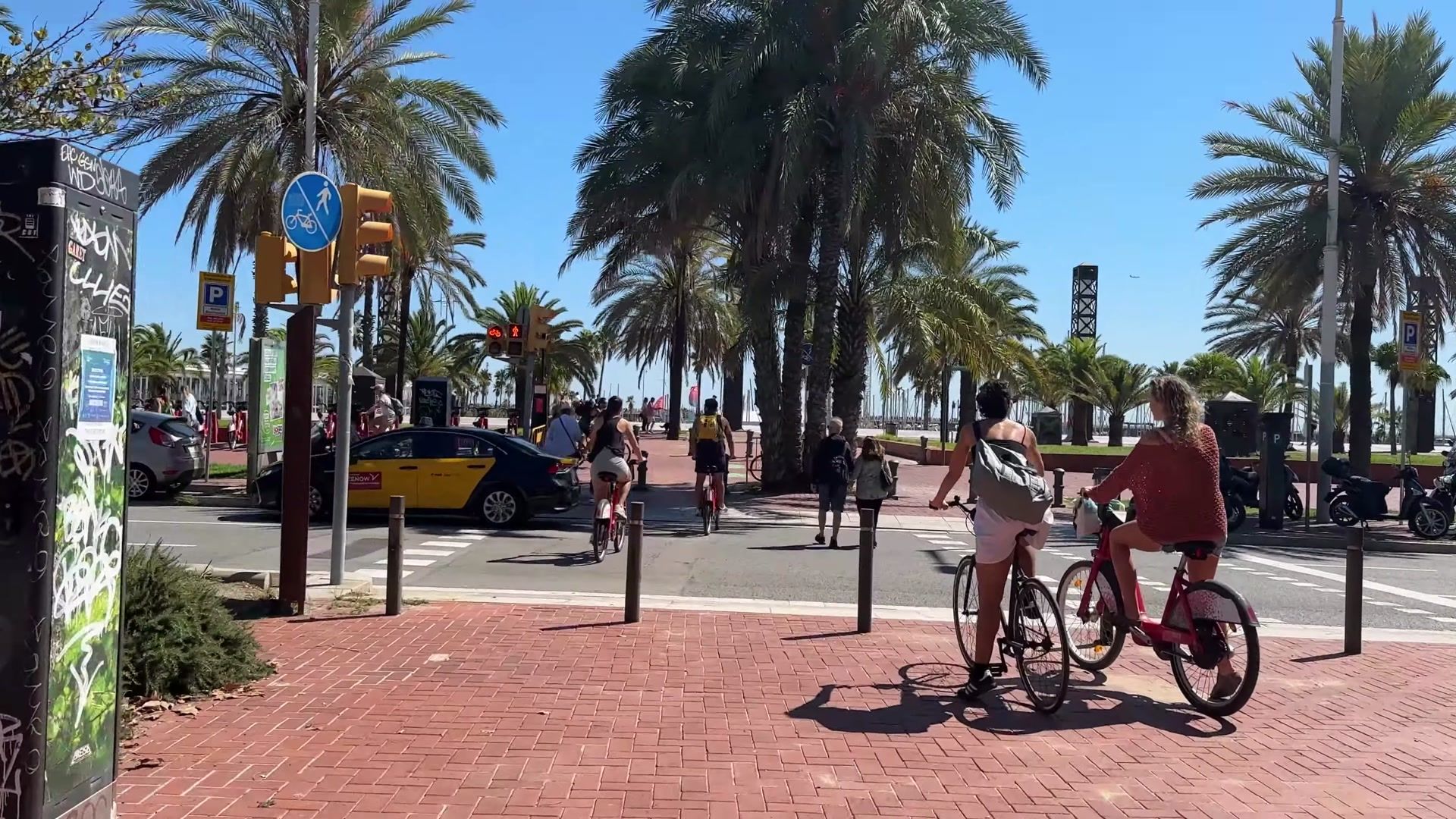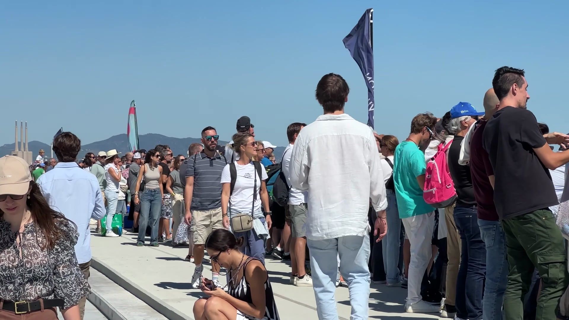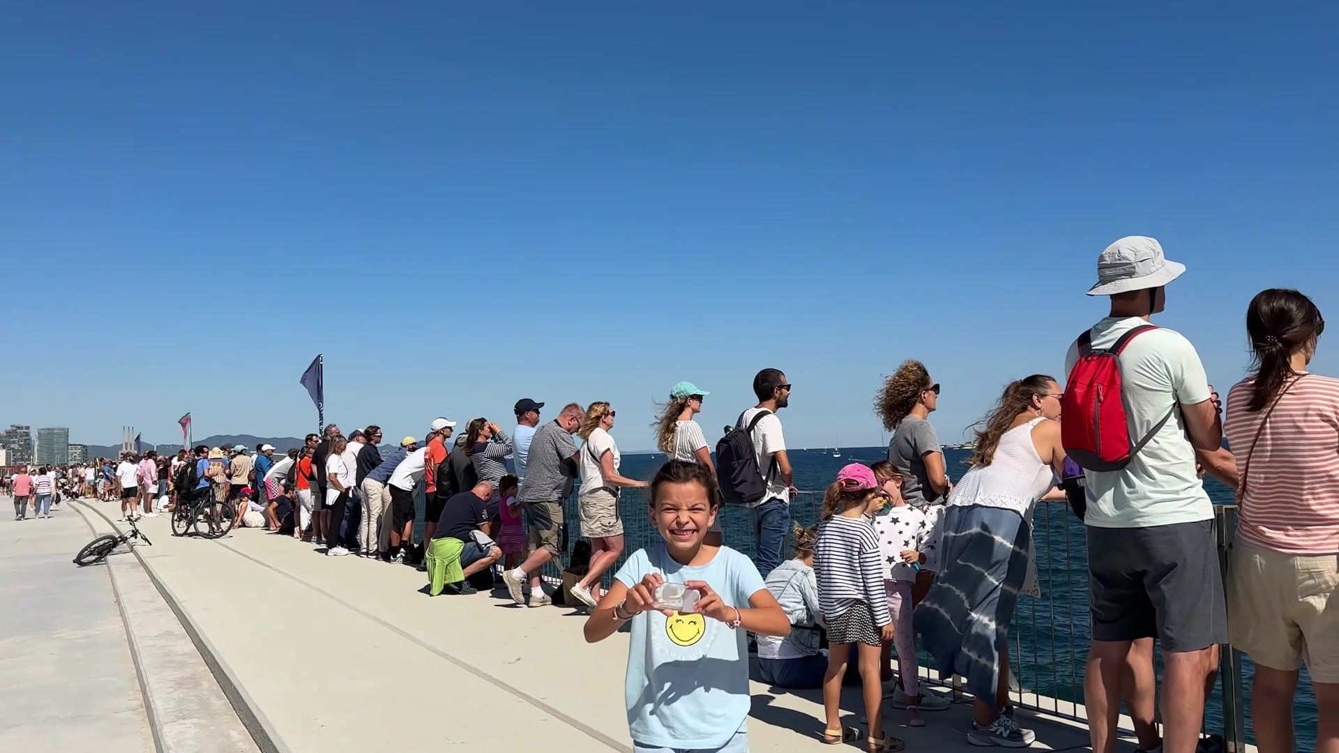 This is a fantastic space for walkers, touristsand cyclists. There’s a large promenade aboveand it’s crowded right now, almost no empty spots. People were watching the regattaand we joined them. Palm trees have always been here, giving it a lush vibe, but now it’s even more organized and clean. New restaurants have opened below, currently only two or three, but more are expected to come over time. We watched the American regatta taking place in Barcelona. Downstairs, there are plenty of benches and spaces to sit or lie down. It’s a great relaxation spot. In the distance, you could see the sails of the regatta boats. Some construction is still ongoing, but that’s normal as it wasn’t finished before the regatta. What mattered was that the area had opened and was ready for use. These little details will be improved over time.