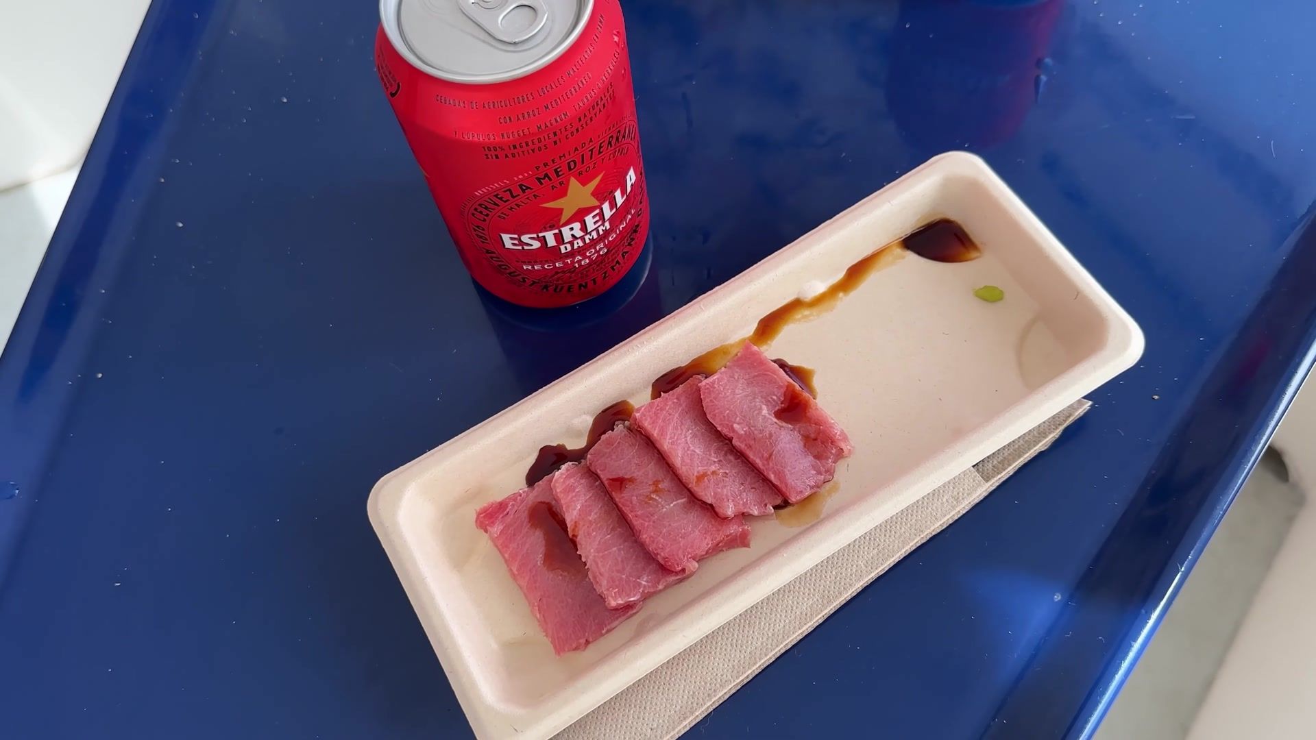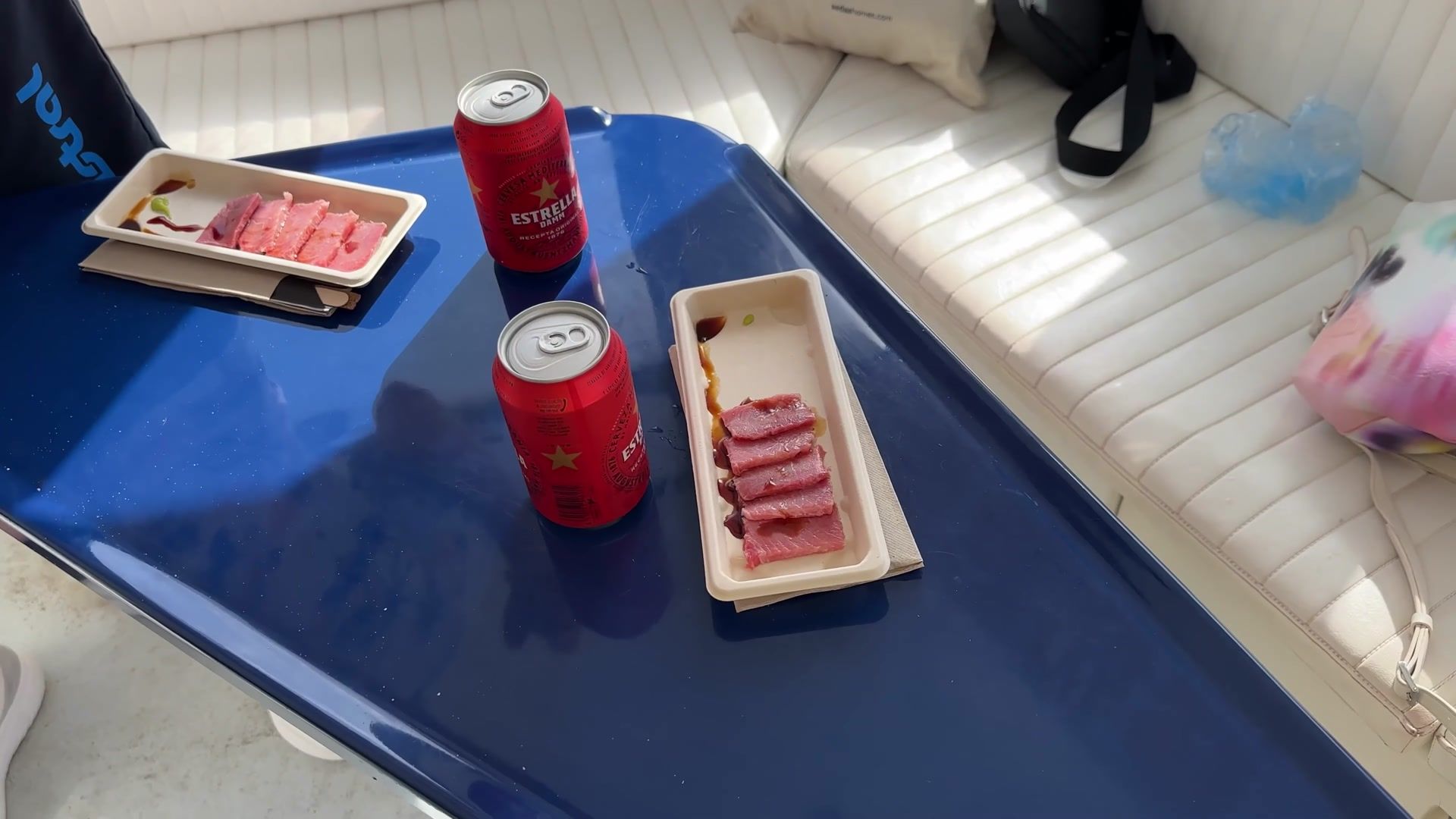 We arrived at the swimming area, where we swim in farms where giant tuna are kept. We approached the area with the tuna. This is not just a regular tour, it’s a tasting tour. We went to the bar and got our tasting set. There were beer, cava or soft drinks available. You can choose a drink along with the fresh raw tuna tasting. Options like beer, cava, or water are available.