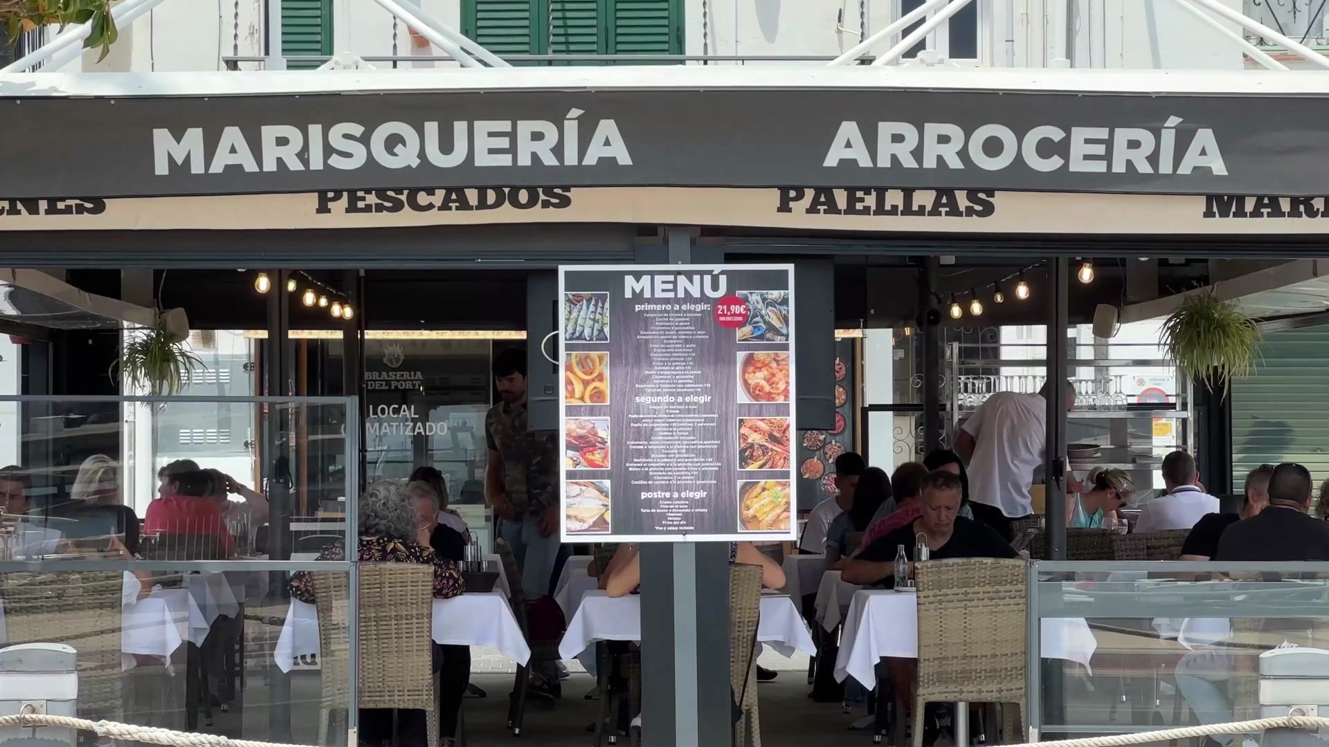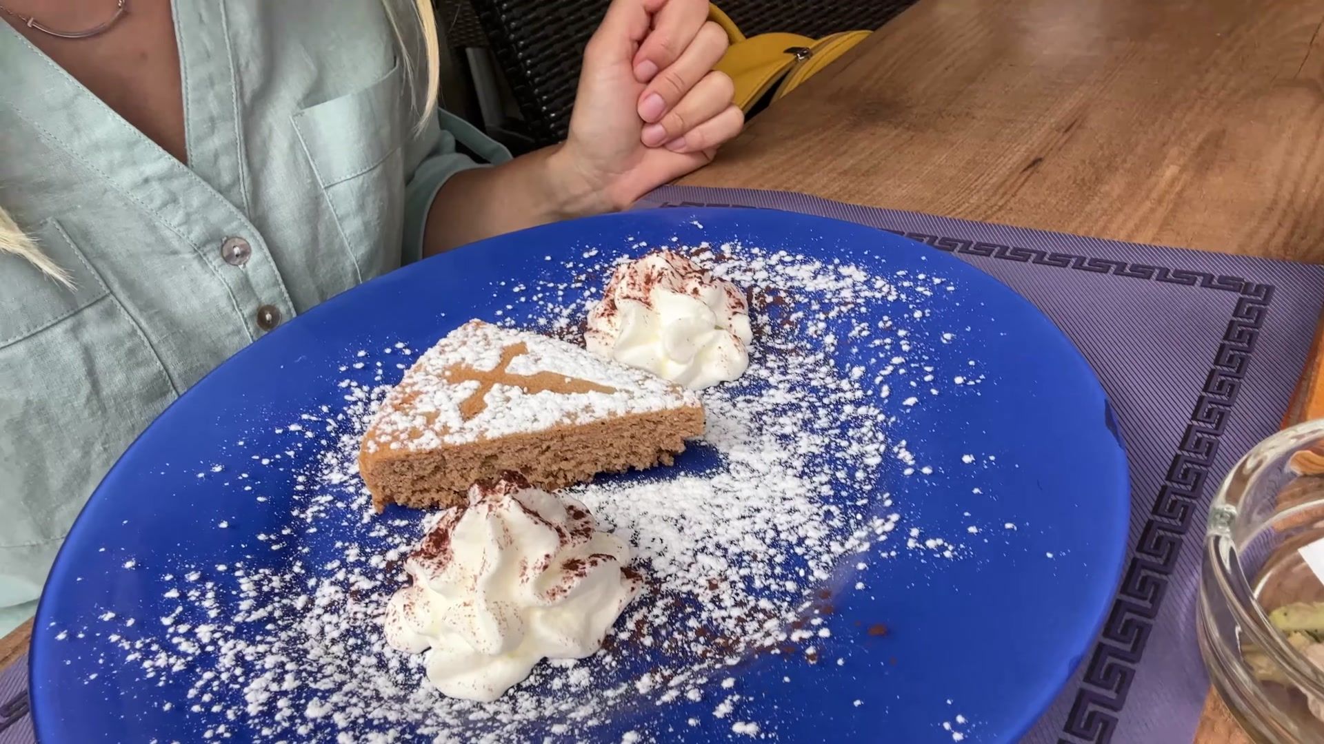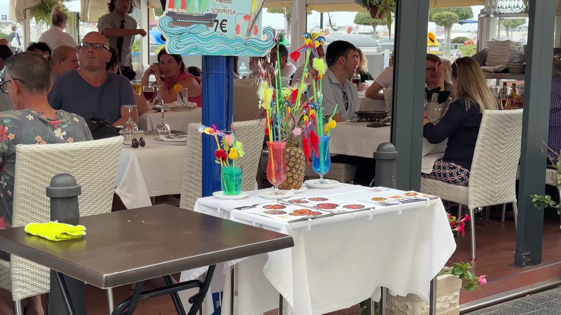 We sat down at a restaurant and ordered our meals. We had salad and mussels and took advantage of the day’s menu. It's nice to relax in Cambrils because there are fewer people here. Salou is more popular among tourists and you can visit there for PortAventura, but you can stay in Cambrils. One of the dessert options on the day’s menu was Santiago cake, decorated in the shape of a cross.