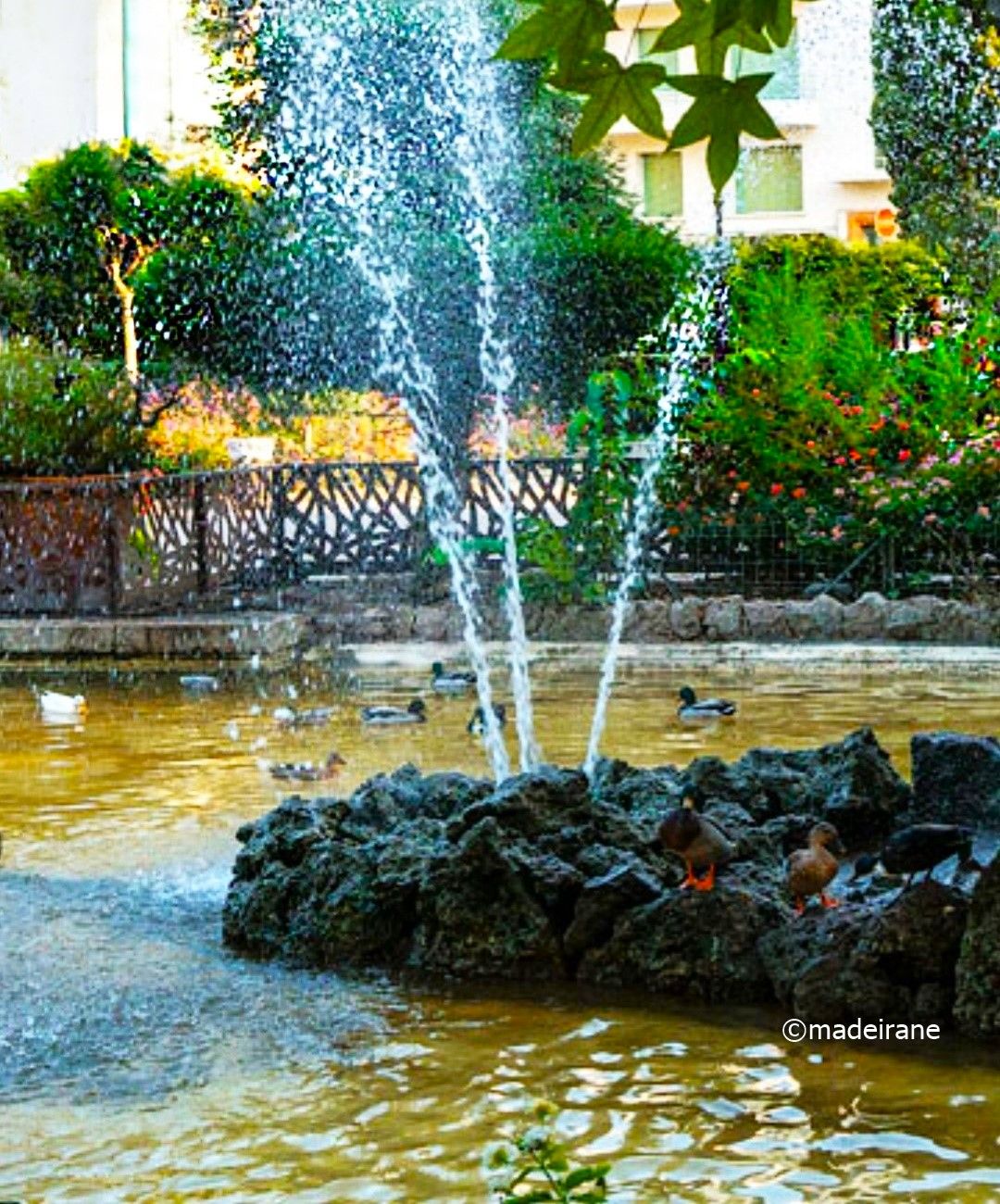 Central square of Cassis. Behind the square is a small urban garden with ducks and a fountain in the center of the pond.
