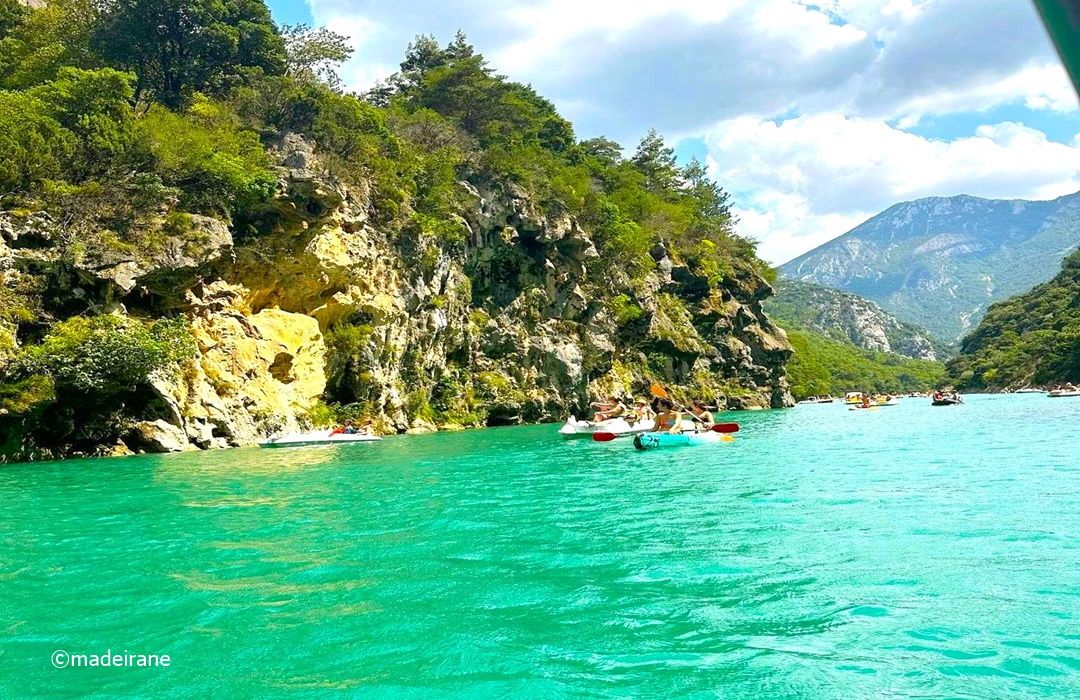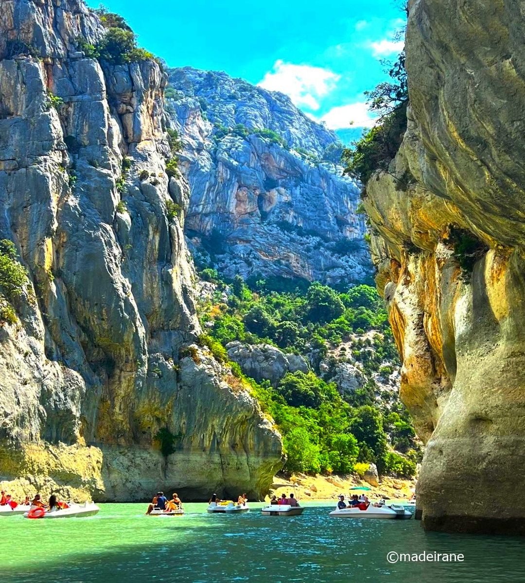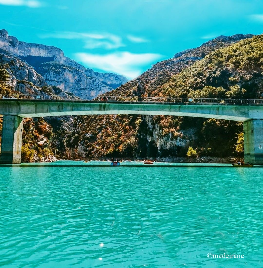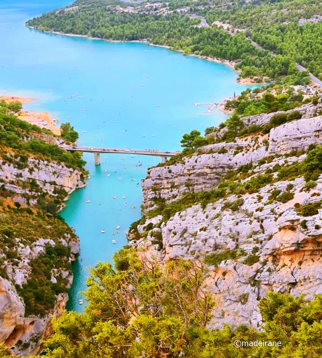 The view from the bridge is very beautiful. On the right is the entrance to the Verdon Gorge, and on the left is Lake Sainte-Croix. Tourist boats, kayaks, canoes, and kayaks sail in large numbers into the Verdon Gorge. From above, it looks very nice. The color of the water in the lake and near the gorge is stunningly beautiful, emerald green.