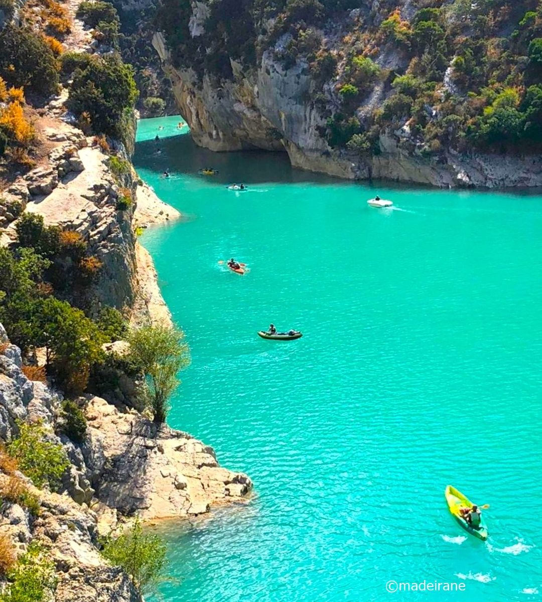 Now a few words about the Verdon Gorge. The Verdon River flows from the Alpine foothills and for several millenia, it was carving a channel in the canyon. The width of the canyon in some places is 1500 meters and the depth is up to 700 meters. The Verdon River forms 5 artificial lakes. One of them, as I already mentioned, is Sainte-Croix. Verdon is translated from the word green. The Verdon Gorge is the deepest gorge in France. Thousands of nature and simply beautiful views lovers flock here.