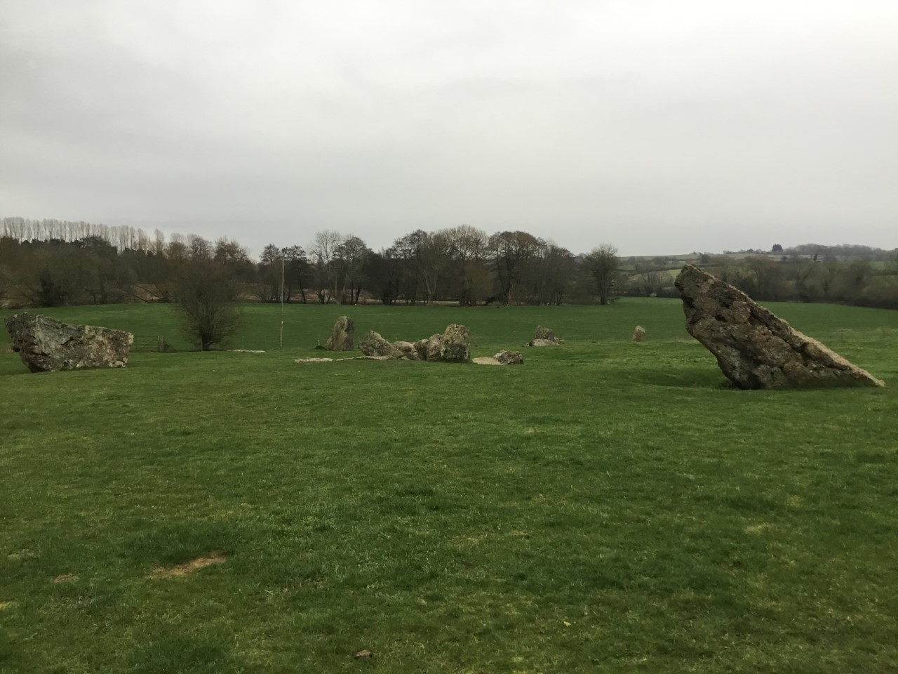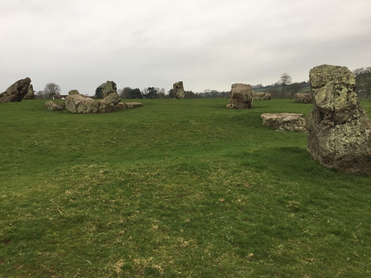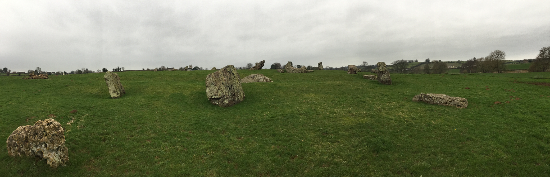 Unlike places like Avebury, or Stonehenge there is no visible henge (raised earthen work) surrounding the stones. The area the various circles cover is huge though. When it was all standing it would have been much larger than Avebury which is the largest stone circle complex in the UK, and like Avebury a village sits inside of it.