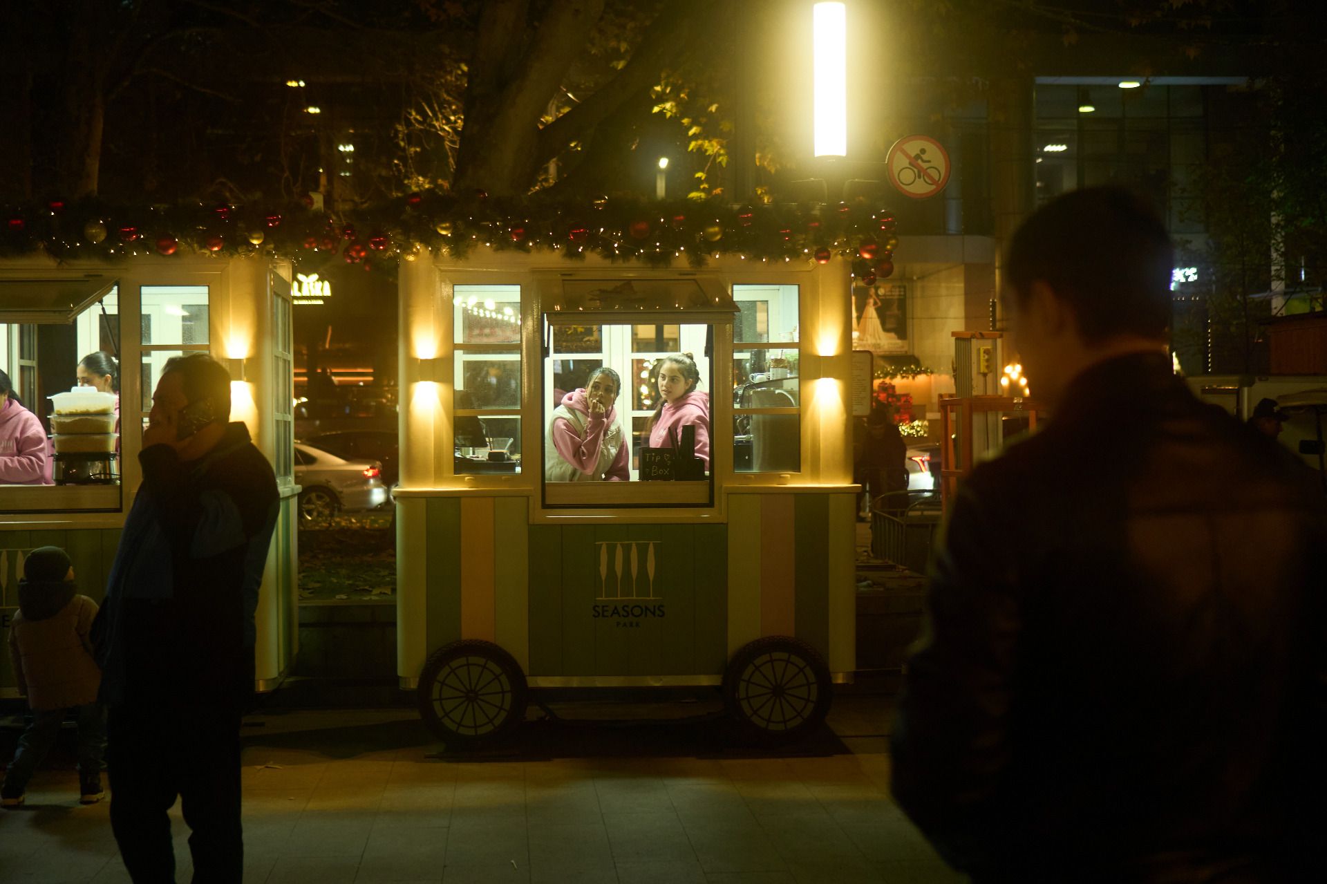 Within the middle of the park was a Christmas tree made of lights. Thought other markets either have no attempts at trees or instead have actual ones being put up. Walking around this area was really difficult due to how many people were around. Though this was the smallest problem of all compared to something else lingering around the city as of late: air pollution. This market was the first time in a week I had been outside. A thick smog that coats the city throughout. Within minutes I could feel my lungs hurting. The feeling of dense, nasty air in the back of the throat. Despite wanting to stick around at the market, which itself was mixed with the the smells of smoking and little bonfires made to keep people warm as they drink and eat, it wasn't a space of comfort. Some wore masks, some didn't as if they didn't notice the quality of air.