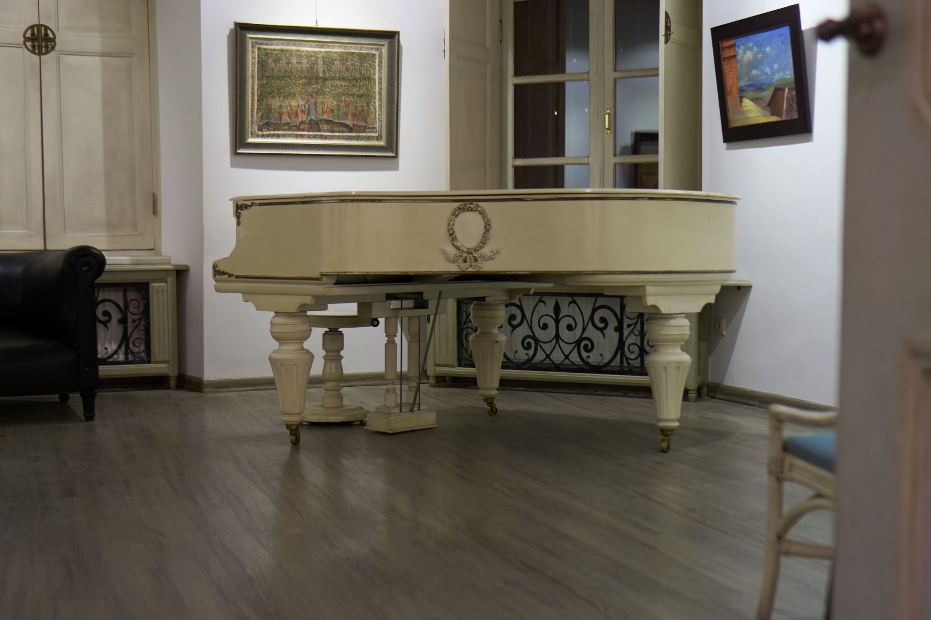 For an art gallery, our interest initially started with the building itself, we actually ignored the art for the most part of our visit, just in awe at how beautiful the building was. Initially owned by three old Armenian women who he claimed weren't that friendly, the building was then sold to the current owner, his friend, for something around the price of $150,000. I'd say that's a steal. Incredibly beautiful and spacious rooms, riddled with former architectural designs of different eras: pre-Soviet, Soviet, and from other cultures around the world. It held a balcony that overlooked the river, which would've been far more beautiful in the past when the roads of Tbilisi weren't such a loud nightmare. And a courtyard in the back featuring incredibly old chests, a seating area, and a lot of cats. It's a shared courtyard that those in the other buildings and floors still owned and lived in. An old piano stood in the largest room. Want to play it? Go ahead. Do whatever you want. He didn't mind, and trusted you'd take care of it by even just leaving the room after granting permission. We asked about events in the building, and he stated that many artists come and go for various talks, music events, and art related happenings. We took his little business card with immediate interest in returning for future events. We talked with the man, named Sergey, for a while. From the art, the building, his own life, and the current situation in the city.