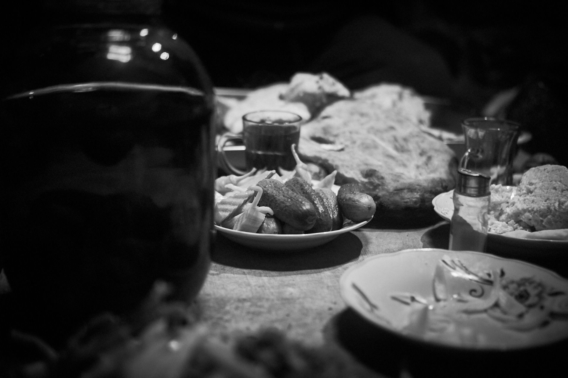 I had never met these people before, but it was interesting how quick they were to welcome us in. The immediate encouragement of eating the potatoes that came from the hole in the ground, hot to the touch, soft in texture. The room felt a little chilly at times, but the food kept us warm. Alongside the homemade vodka that naturally found its way into our shot glasses. A couple of those and the cold no longer exists. The food tasting a little more vibrant with the addition of some alcohol. Though this was also accompanied by some glasses of cherry kompot, which the others used to wash down the strength of the vodka after each toast. I wanted to get up and move around the room a little more, but with about five of us there, and food constantly being put in my direction, I didn't get much freedom to move. The light was also a little too dim for the required shutter speed of capturing the movements in the space without any blur.