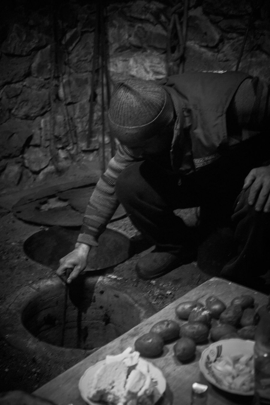 A small hole sits in the room, this is something Armenians would use to roast and bake things. The hole going deep into the ground, with a stone wall. Fire at the bottom that would push the heat upward. I'm not sure entirely what the purpose of this was in the past, perhaps it was a good method of keeping food warm in the harsh winters. I was urged to sit down on a wooden plank that had some clothing placed over it to make it a little more comfortable. A small orange light served as a key light to the faces of the room's inhabitants, while a hole in the top of the building served as a beautiful white highlight from above. The light in there was truly beautiful, such warm tones and generating a very comfortable atmosphere. Before I knew it, food had appeared. Plates of just about everything; pickled goods made at home, fresh Lavash that too was made from home, with a very nice thickness to it.