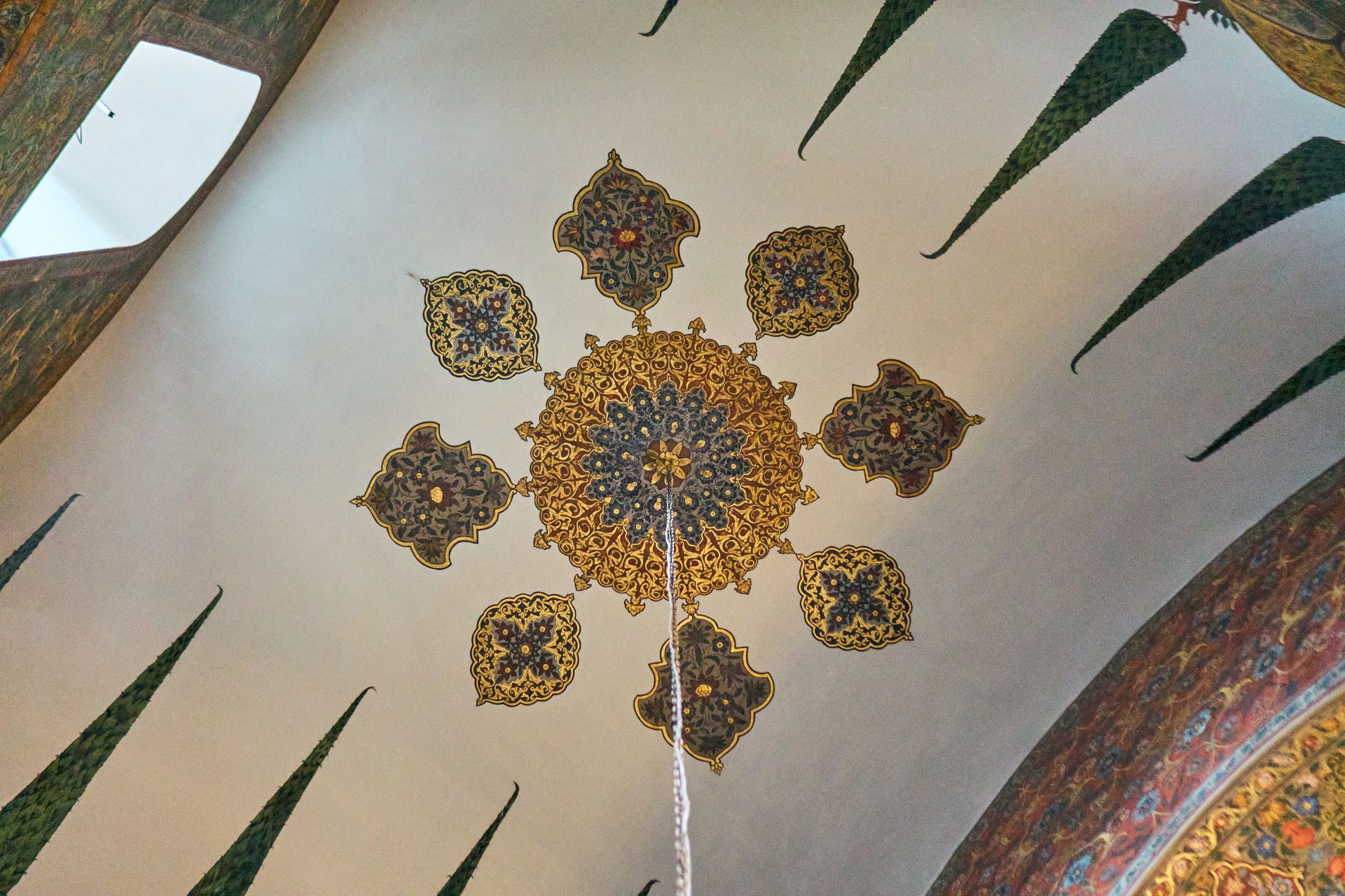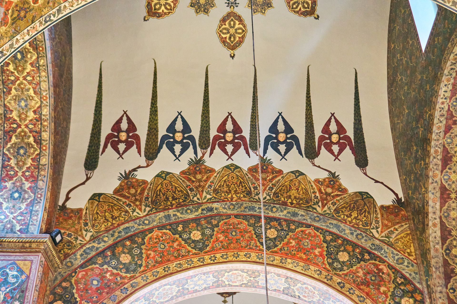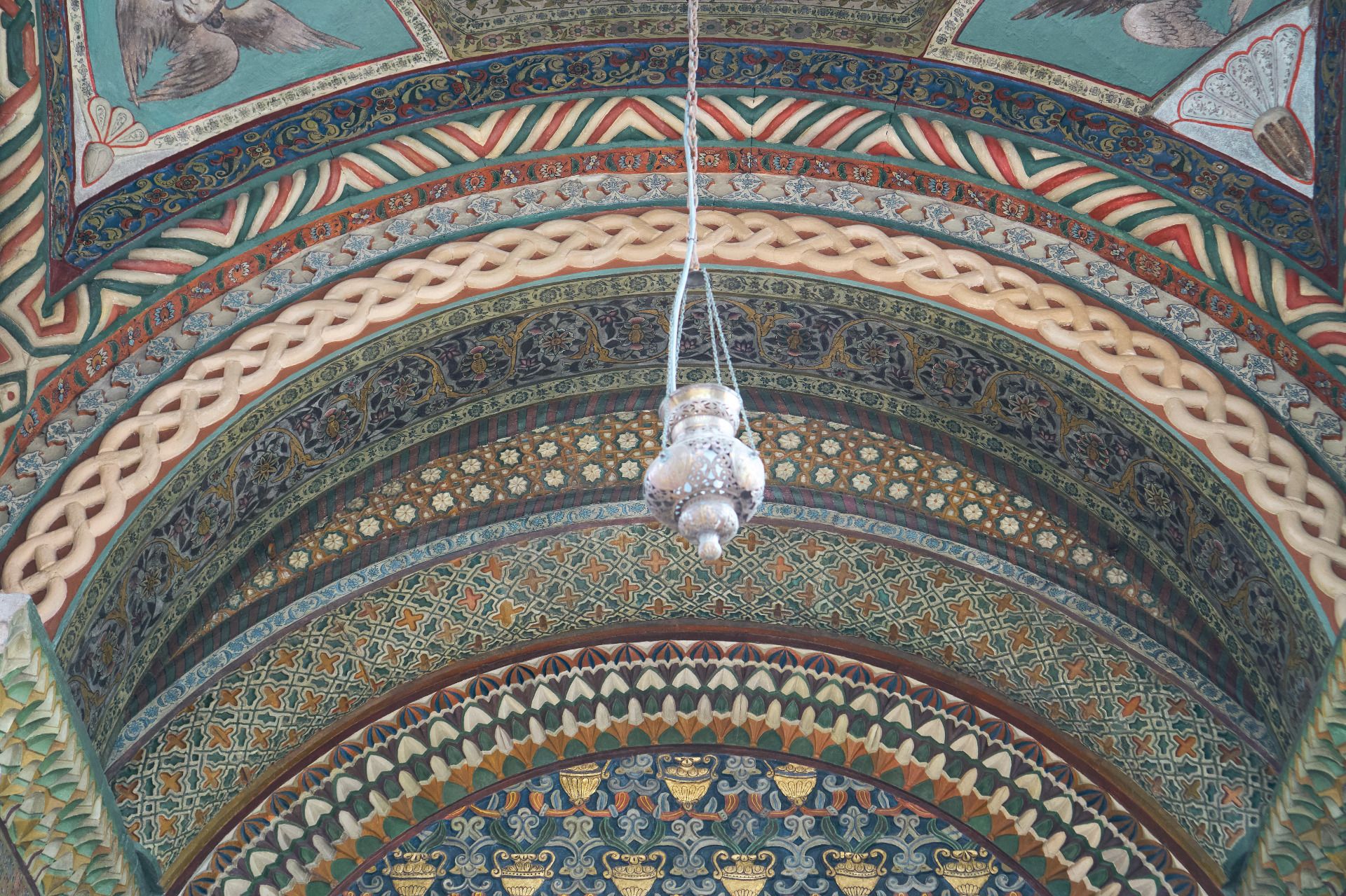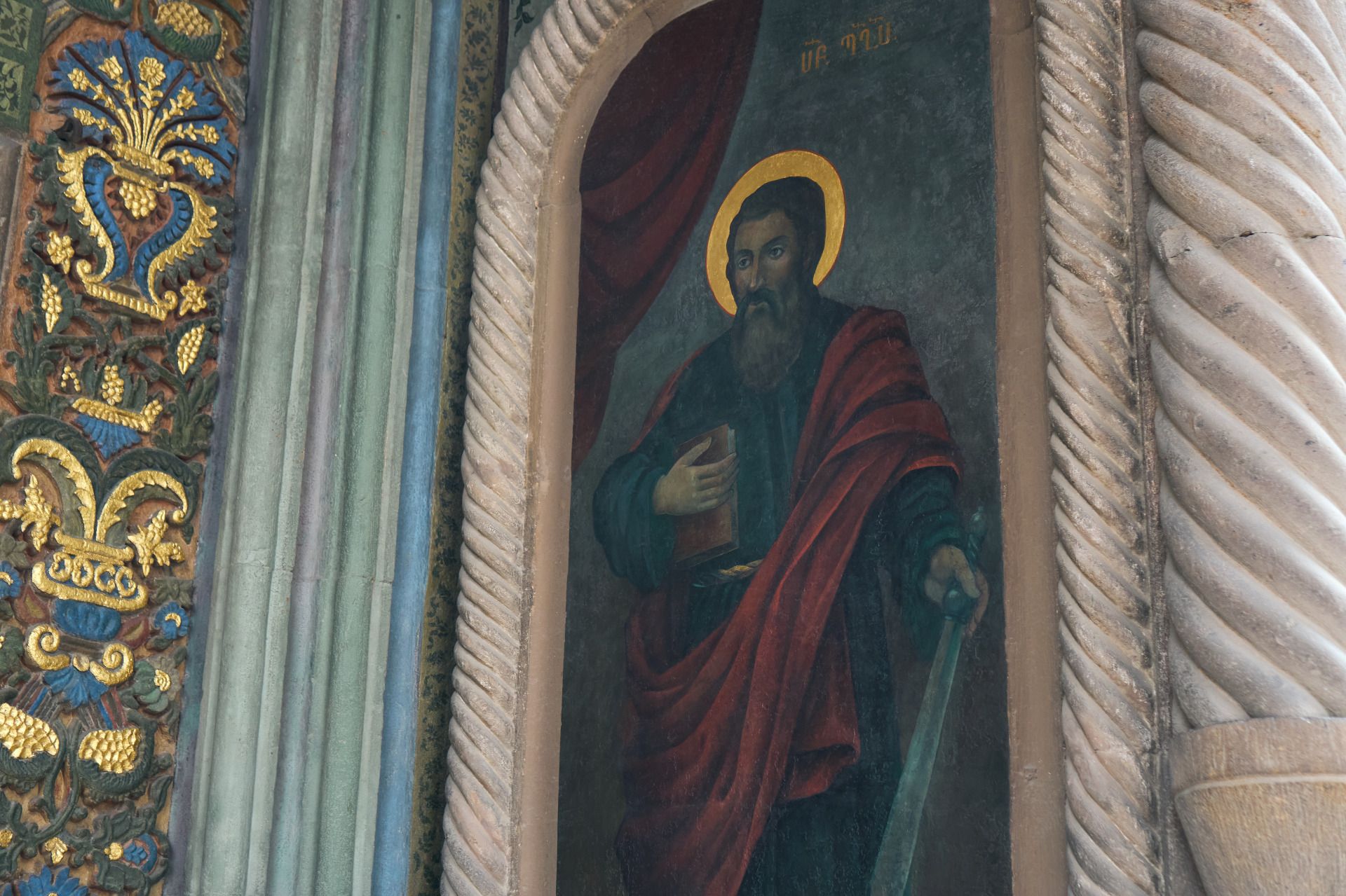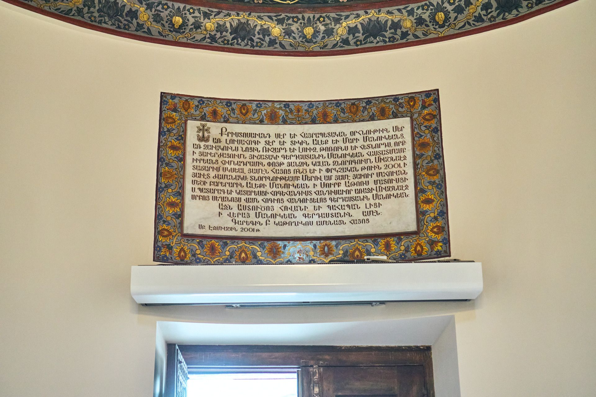 I visited the location back in February, not too long after it had reopened. I was incredibly surprised at the sheer beauty of the interior, one that had a deeply Armenian cultural connection in its visuals. The colours, the patterns, the religious themes found throughout. Though, to start some of this exploration into the interior, I want to highlight an interesting fact regarding the church now and its reconstruction: as part of the painting of the doorway, before entering the church itself, a painter had failed to notice a rogue scorpion up on the ceiling. Yes, this region sees scorpions during summer. This meant that the newly-reopened church now features a painted-over scorpion that can be seen if you look up before entering the church. If you ever find yourself here, be sure to be on the lookout for that first. If you can't find it, just ask someone to point it out, it's a pretty commonly known fact for the locals which take some joy in the unfortunate situation of the scorpion. I've cropped one image to zoom in so it becomes clearer, but I've also attached the regular image which also shows it. These were taken with an 85mm focal length lens, so even so it may take a sharp eye to notice in person.