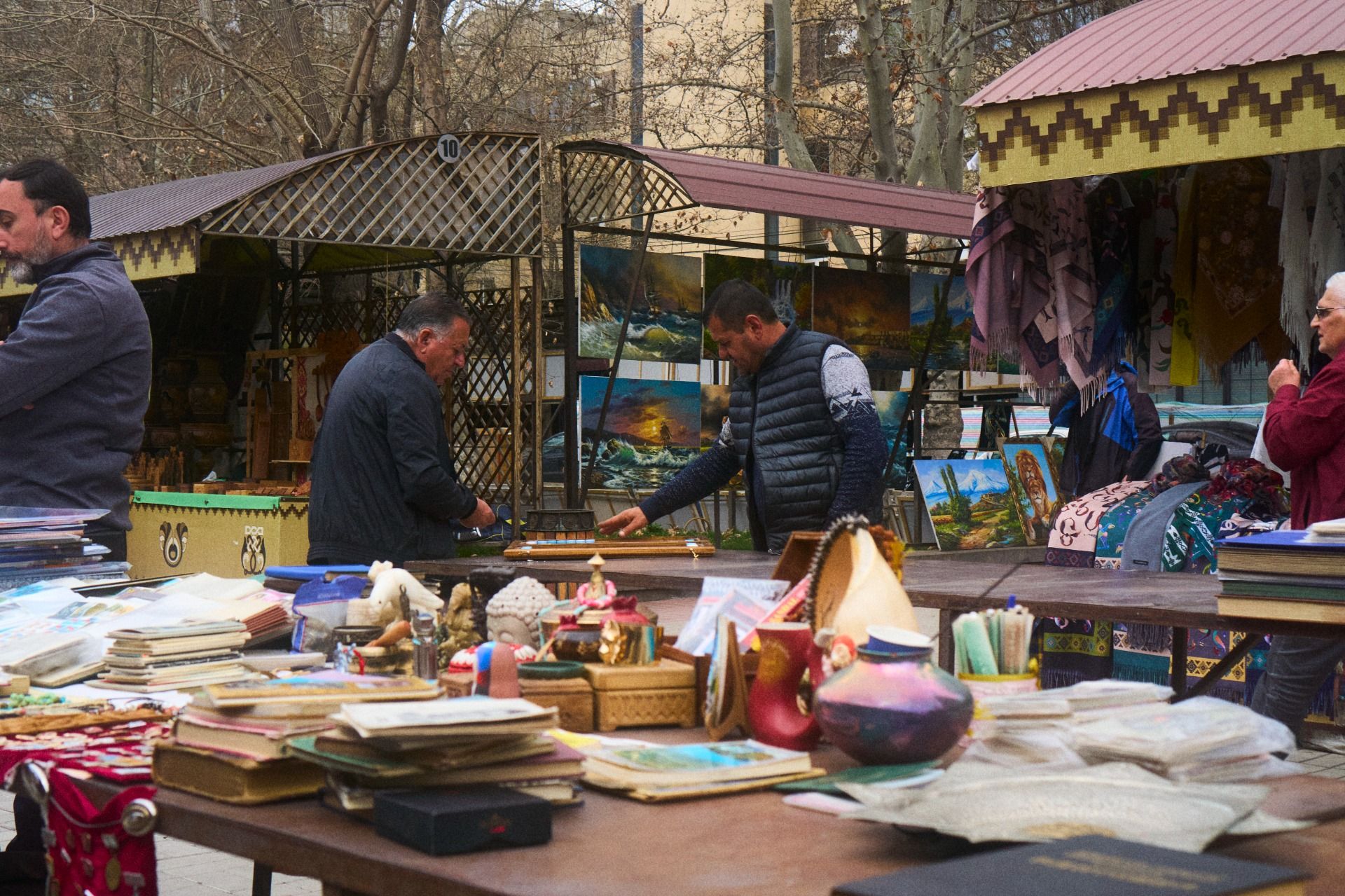 A lot of the general nonsense consists of the typical Armenian colours and patterns one may find on the carpets of this region. Others tend to be anything with some sort of connection to the pomegranate. Paintings on ugly little cups, places, and pretty much anything that would end up just sitting idle in a cupboard somewhere in the kitchen over the years, not really used or cared for by anyone. Fortunately it's just the entrance that holds this stuff for the most part, the rest opens up into various crafts, items of the past, rugs, and clothing. Some even displaying various entertainment options in the form of fancy chessboards or nardi -- a game I have grown addicted to here, as frustrating as the luck-based board game can be. To no surprise, you see old men playing this game everywhere, where it was once more popular around the Soviet apartment blocks where grandpas would meet outside and play. Sometimes you still see it, but much of that older population died off. Though, within this market, some of the workers behind the stalls passed the time with their cigarettes and a game of nardi against each other.