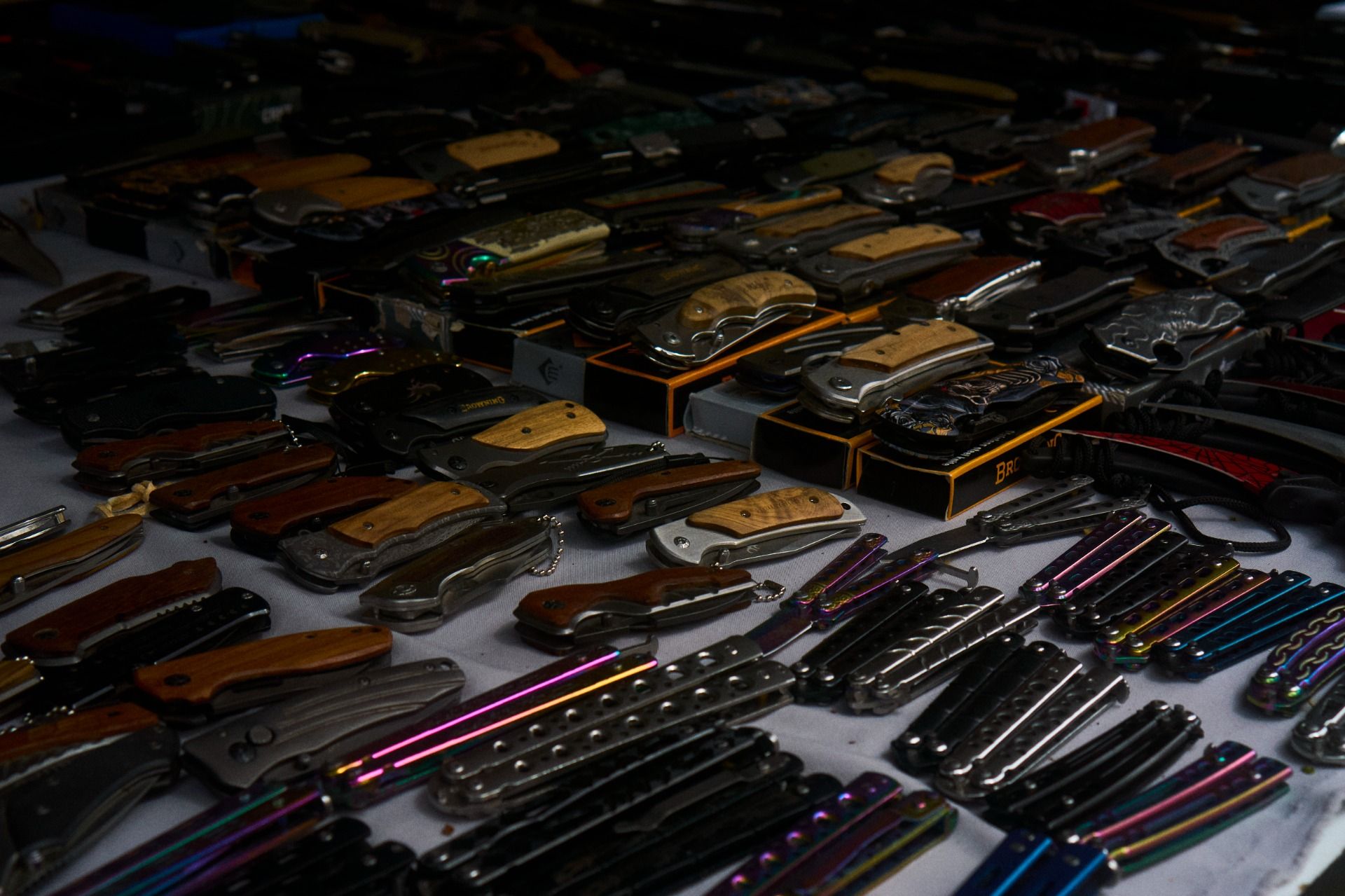 A continuation of the oddities here, one can find various tools. Some of these tools are a bit more questionable regarding their purpose. Fancy knives and daggers litter the space. Some are more focused around the colours and patterns, something a teenager would love to grab ahold of based on the infamous knife craze of Counter Strike games. I suspect that's the majority of the audience for this, the youthful. Where more the daggers are aimed at collectors, older people. A bit more culture added to those in their patterns, more for sitting on a shelf somewhere and appreciated from afar. I thought about it, and actually kind of liked the idea of having a fun knife, but I'm a stupidly immature man on the brink of thirty. The knives extended beyond the talon-shaped colourful ones, and into the realm of butterfly knives.