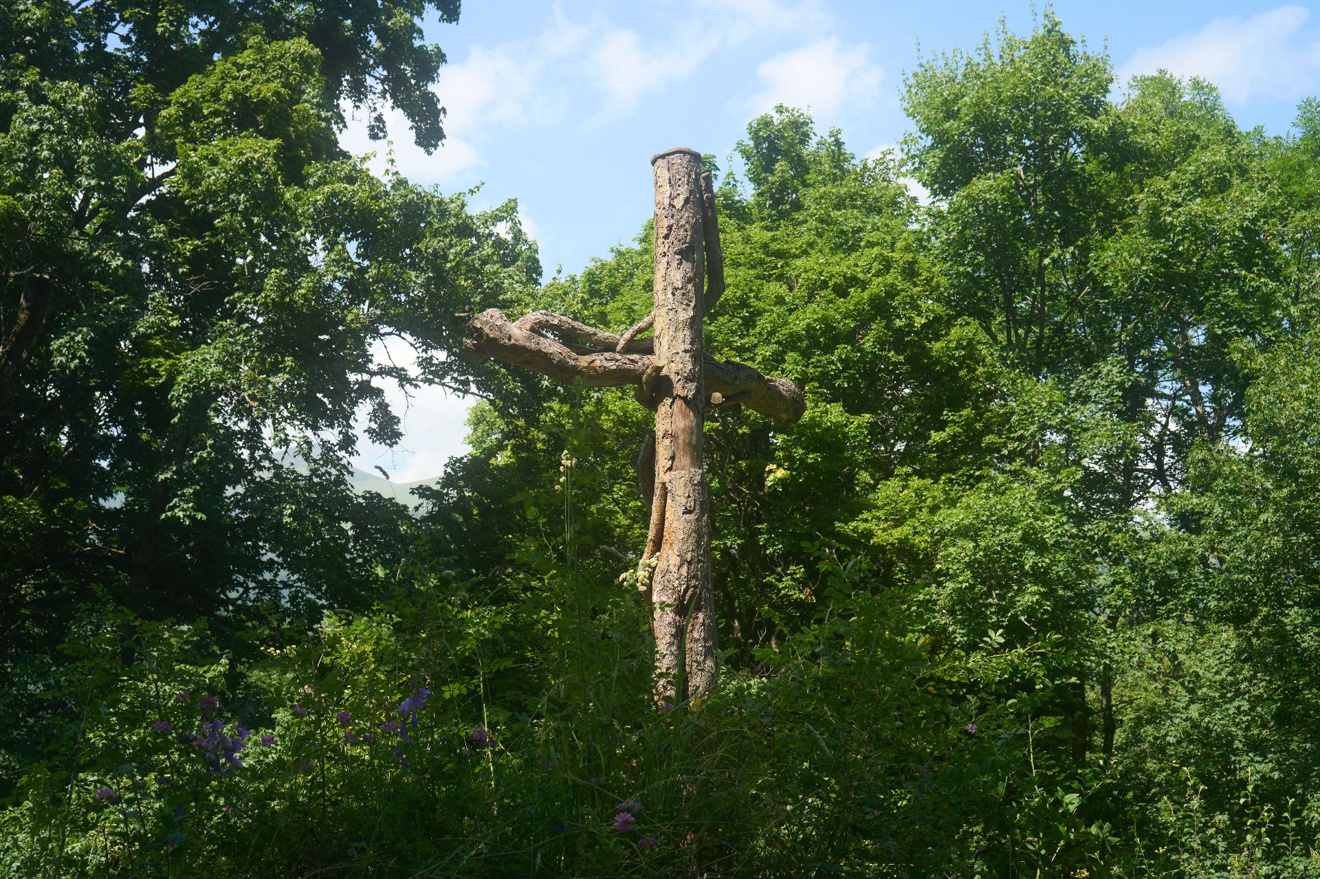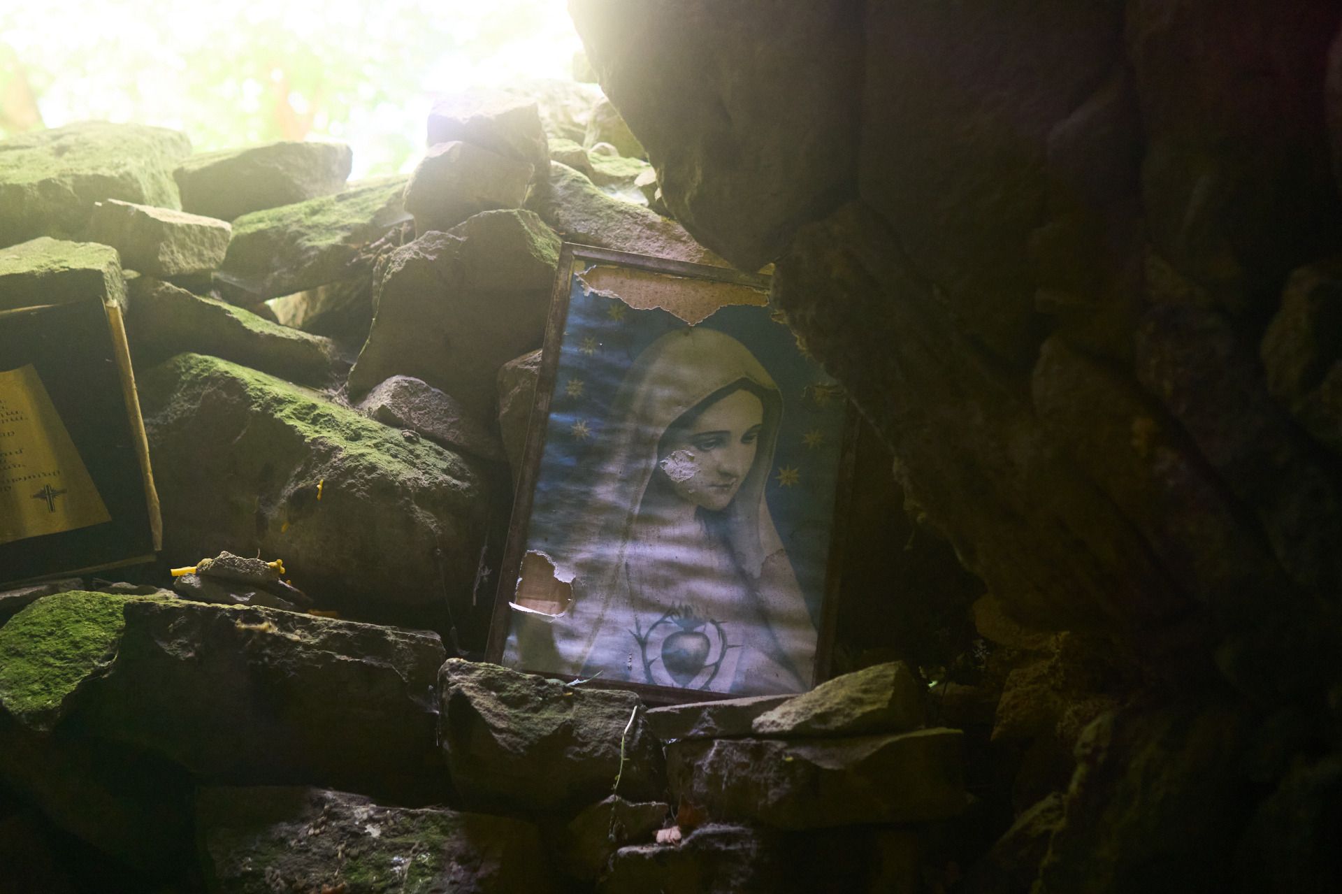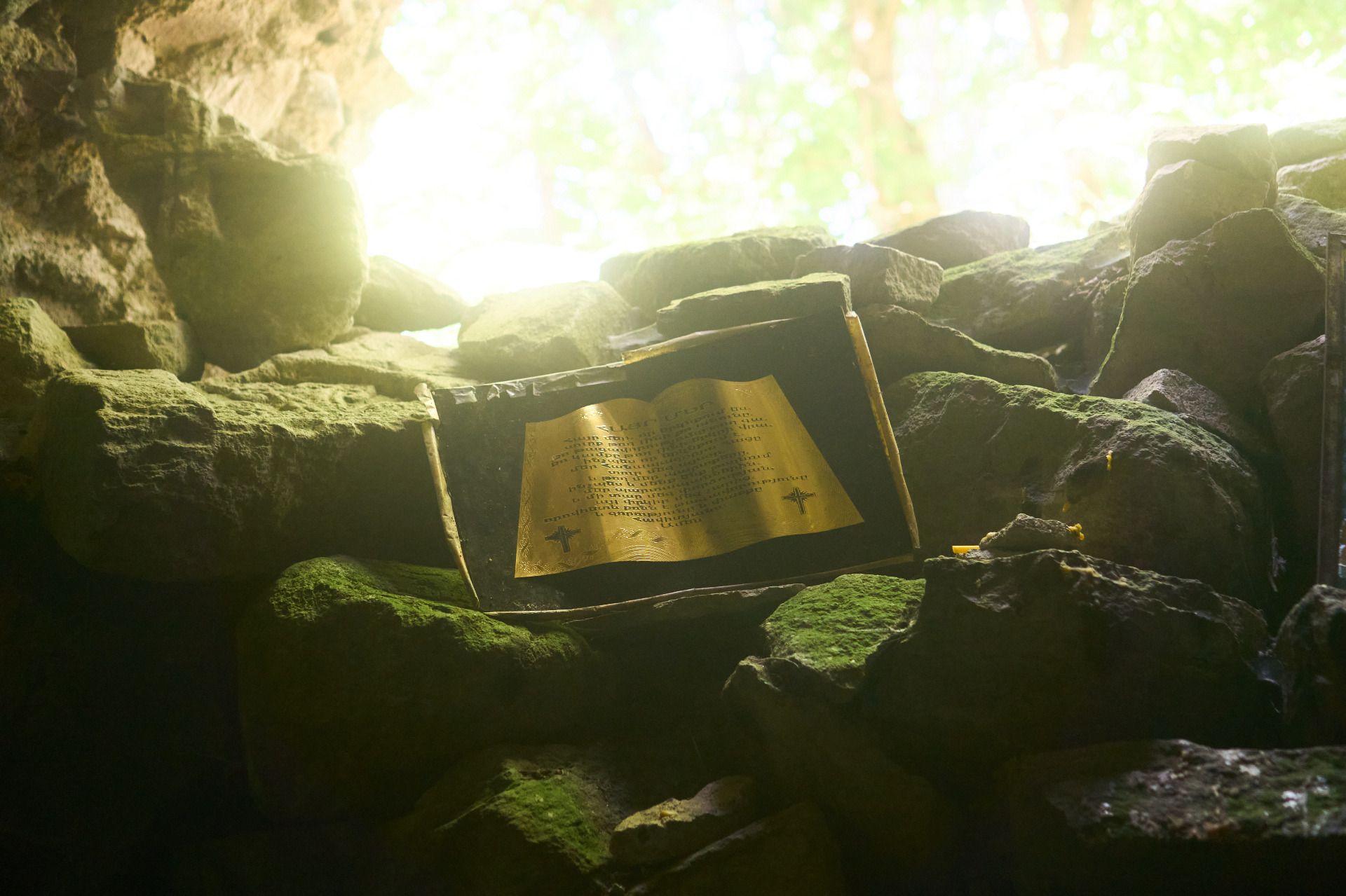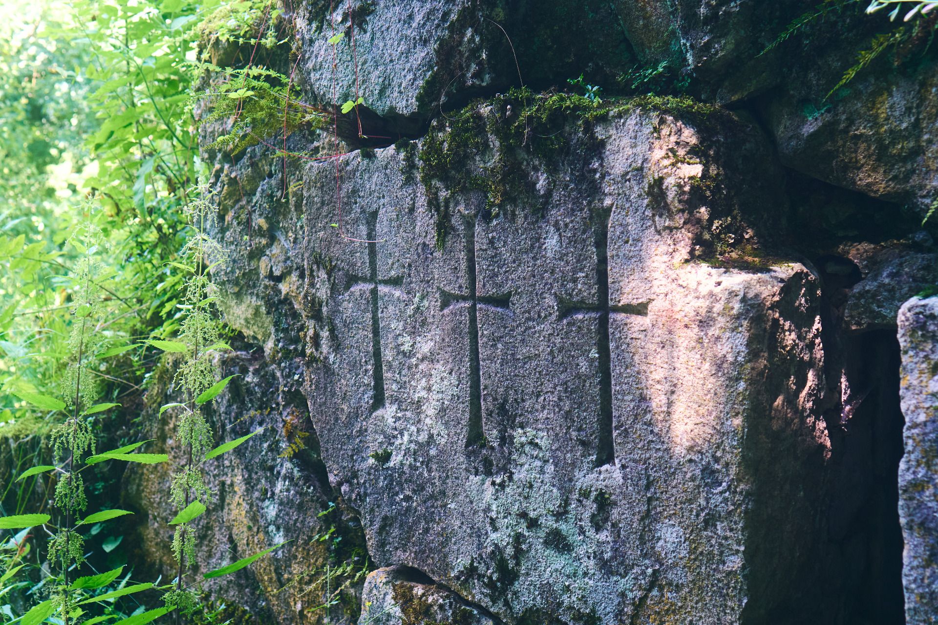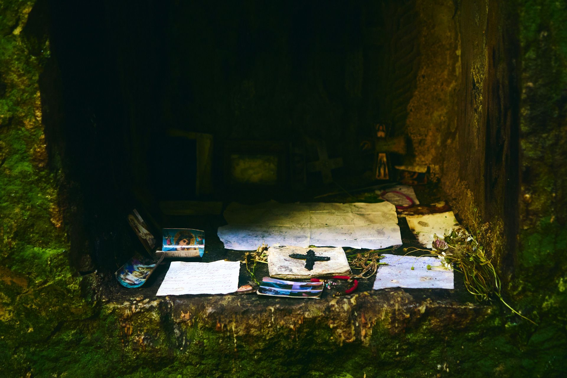 It was lovely to see that nature had been slowly reclaiming the church, rather than becoming victim to vandalism and other forms of neglect over the centuries. I didn't see anything that implied harm had been done to the church despite it sitting alone up there in the forest. And the forest itself was clean for the most part. There were no etchings into the walls, nothing that spoke of the many other travellers that had made their way down to the location throughout the years. Everything that spoke of decay came from time itself, where windows had slowly collapsed, the ground beneath the slabs full of roots from the trees surrounding. Even that rich green of moss upon of the stone itself. While there were still candles being sold to be lit inside, I was more surprised at the little papers and pictures of religious symbolism that remained. And noticing the little details within the church itself, even crosses that had been hiding within the walls that were only noticed after the wall had started to crumble.