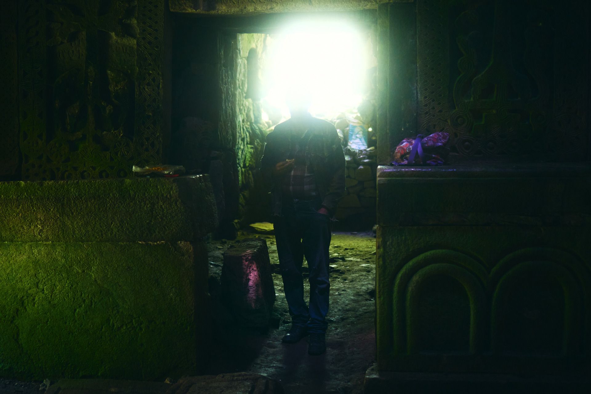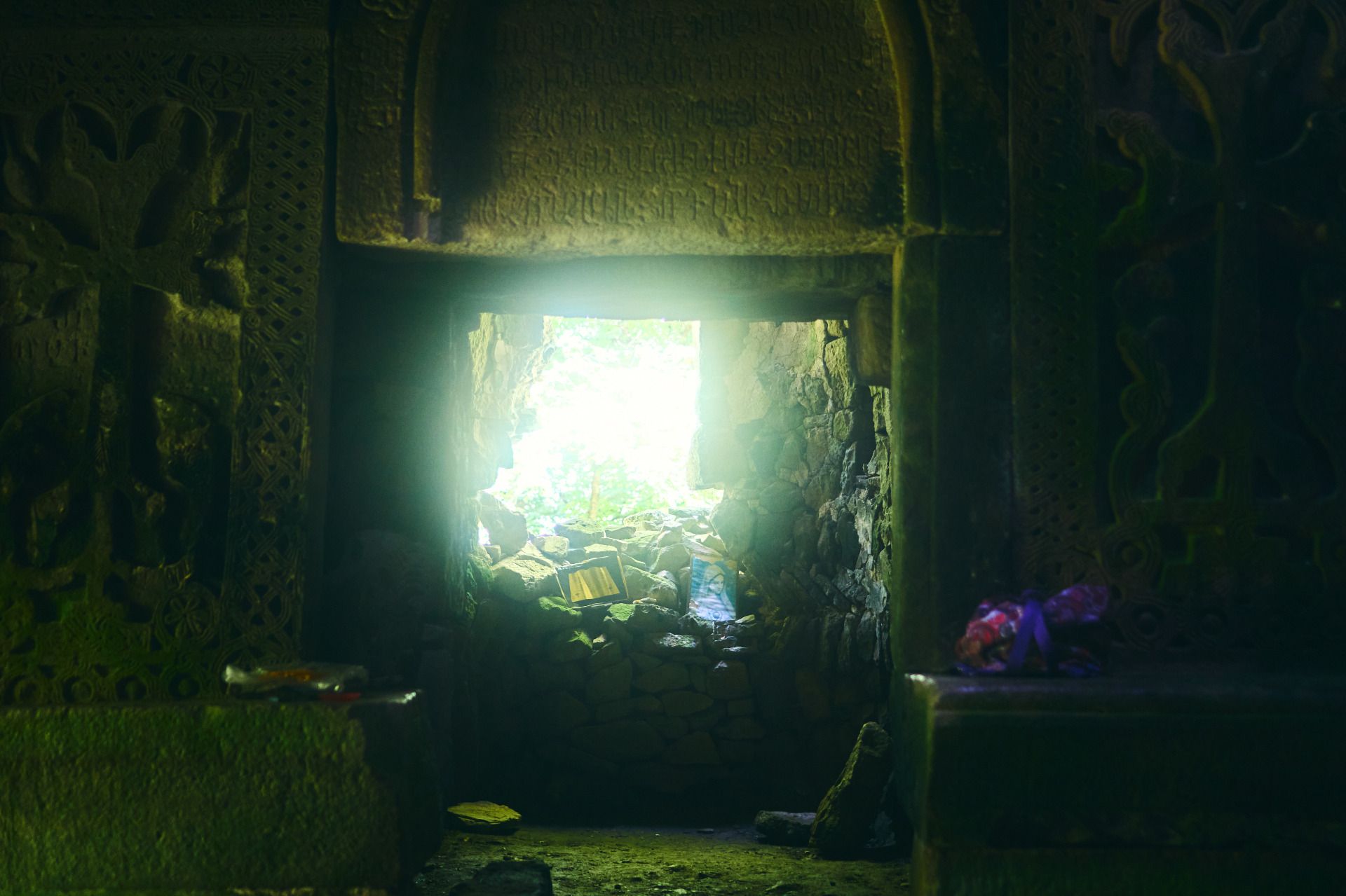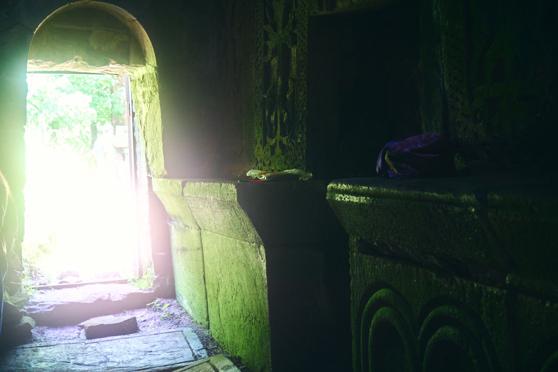About halfway up the trail a diverging path appeared, so we turned left. And a little more of a walk down we saw the ruins appear. A large group of children accompanied mostly by women sat outside, having a picnic. Suddenly in this remote area, we saw life beyond the forest's inhabitants. A perfect spot to sit and eat before I assume their descent back down. This old Monastery looking more like ruins, covered in moss and with bits of stone scattered around. A small entrance that required a little bit of a ducking of the head to enter. Upon doing so, I noticed a man standing more in the shade, where it was significantly cooler inside. This would turn out to be a local man that would hike up and down to spend his days here attempting to sell candles to the few people that would come, to which you could then light then inside. A common practice in Armenian churches to this day. Accompanied by either a little prayer or wish. For the low fee of 100 dram, we got two candles and figured it would be nice to light them in such an ancient place, keeping its tradition and spirit alive.