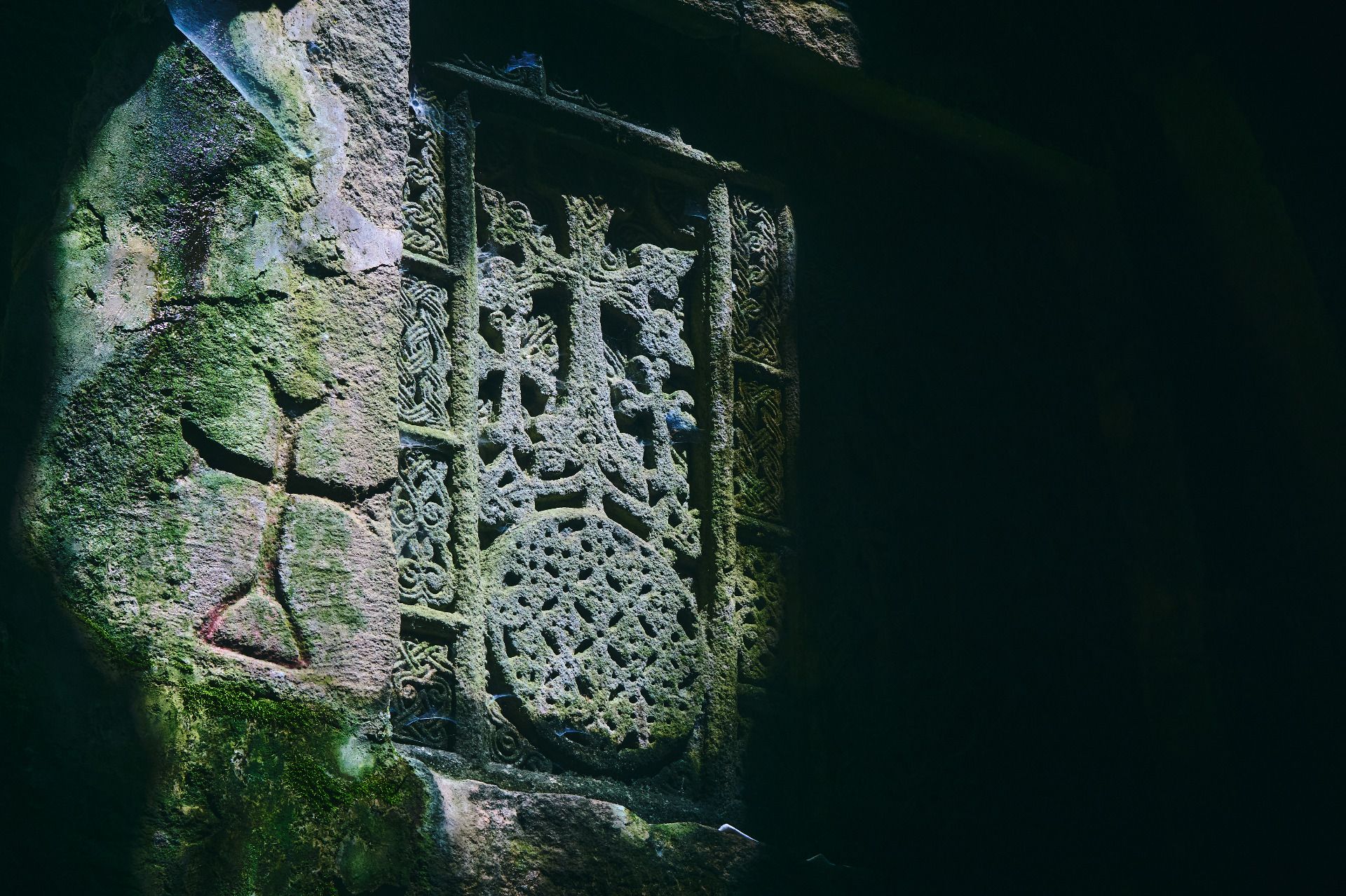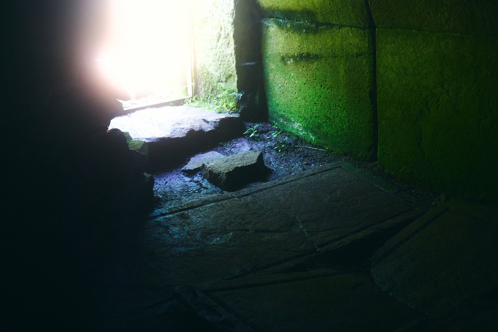It was a small place, one that certainly wouldn't have kept many inside at any moment. I loved the dampness inside, its rooftop covered in moss, with the landscape around leading to some seeping water inside on the walls. A slimy looking place, but perfect after such a long and unforgiving walk up to it. The floor now uneven, large slabs misplaced and pointing in different directions. It felt like a forgotten, magical place out of fantasy. The home of a druid. The type of place muttering forgotten languages would conjure up an ancient spirit. The light inside perfect, a strong glow from the forest making its entrance seem like the first light of a person's life. The little holes in the walls or from the hole in the ceiling above keeping you in that feeling of the natural world. Both the church and the forest now one. No longer separate entities.