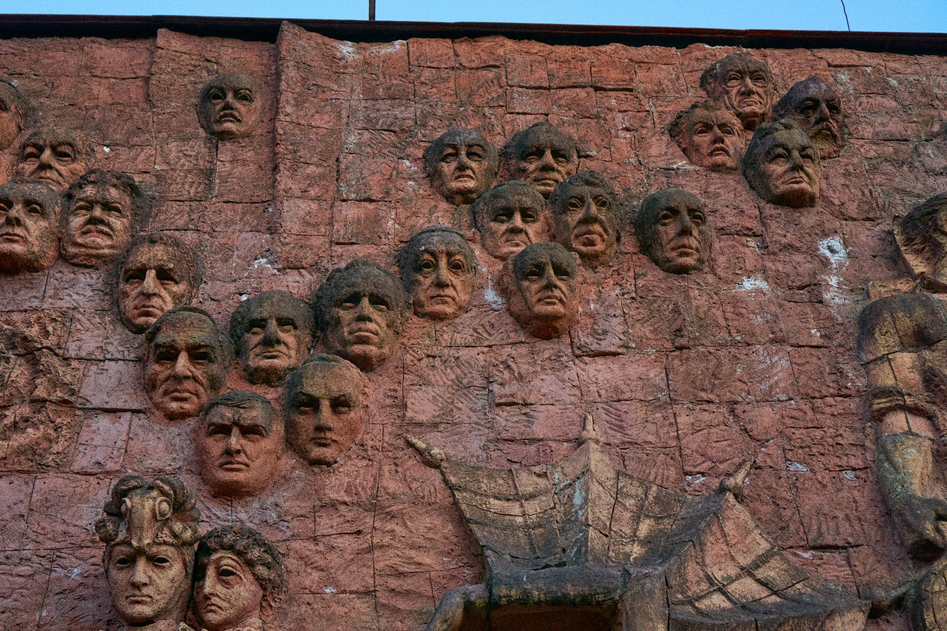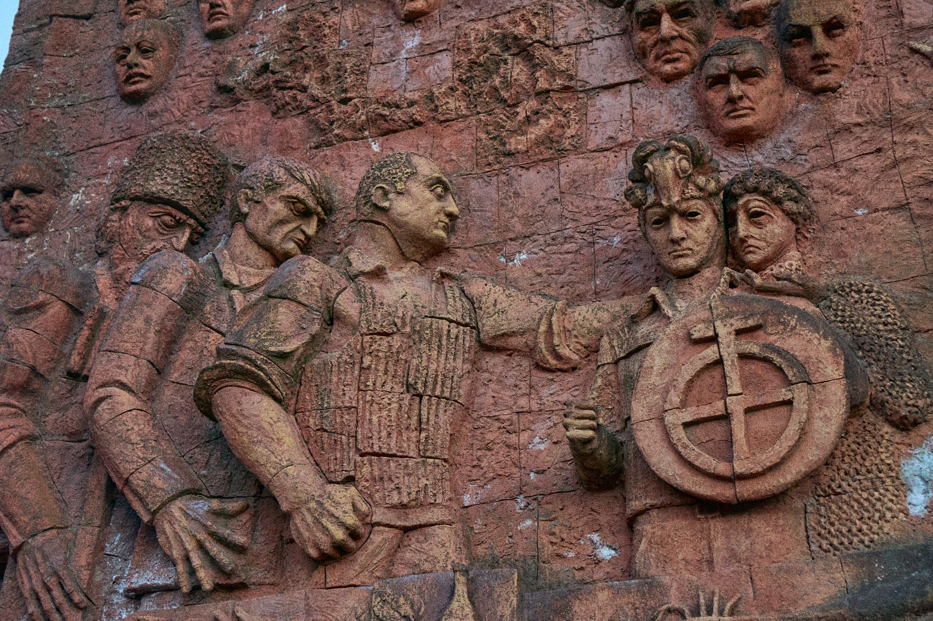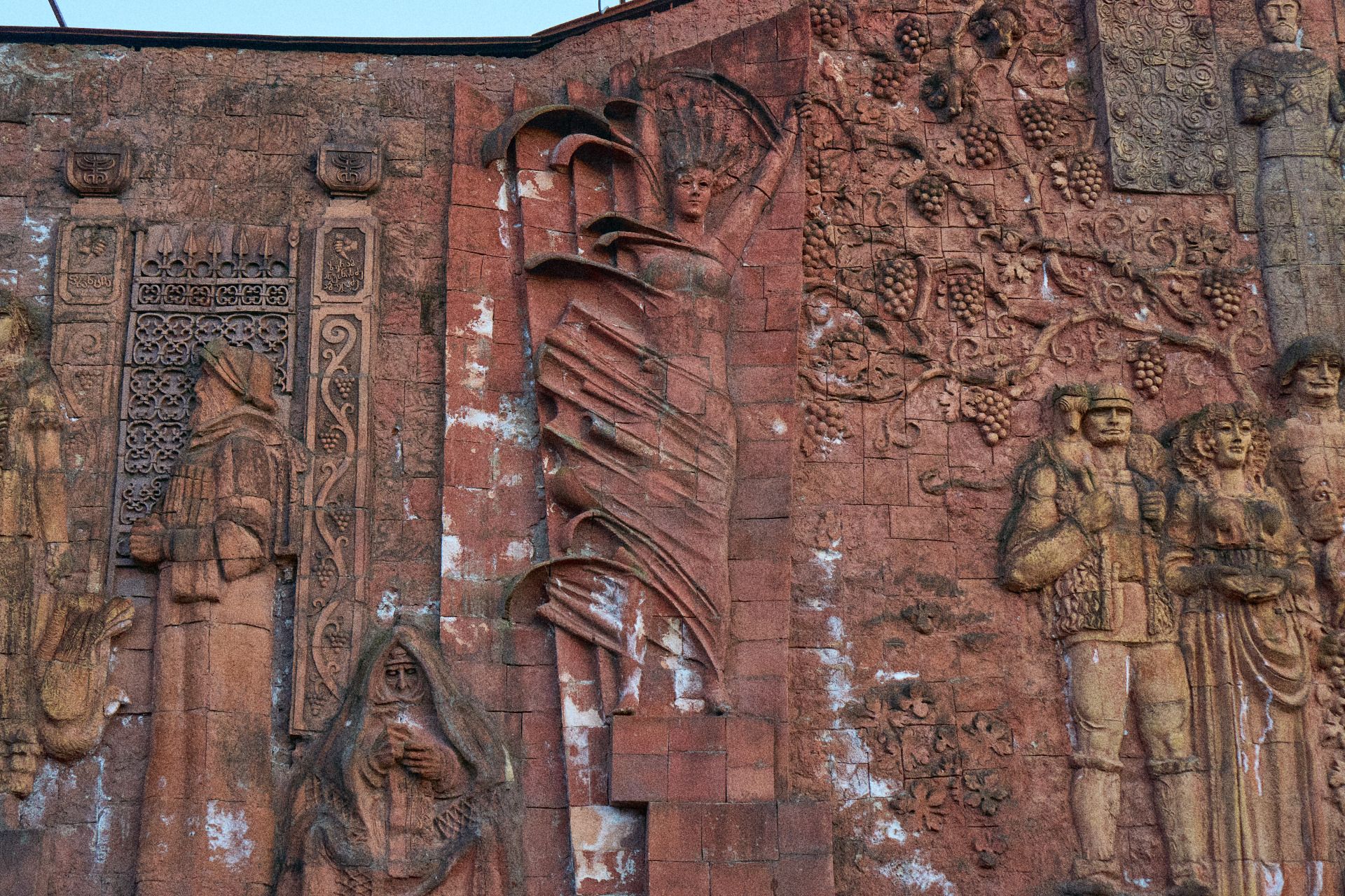 A more depressing feature of the market is a Soviet era (1985) relief that displays many Georgian cultural events and people. This sits at the very entrance of the market and covers the entire side of a building in the centre of Kutaisi. I say it's depressing, but you'll feel that impact of its images when looking deeper into its features. Many faces appear on the side of it, which detail the regular people of Kutaisi, the many faces that came and went throughout the generations. It includes people of history, but also cultural depictions within mythology. At the very bottom of the relief, it displays various aspects of war. Ultimately symbolising the roots of the region, the hardships faced from the Second World War as well as other conflicts. But also how the people have risen up above such hardships and flourished. With the growth of families. The growth of trees that yield fruit. The might of the communist worker that builds and pushes forward with their community. And also the symbols of Christianity which remains strong in the region.