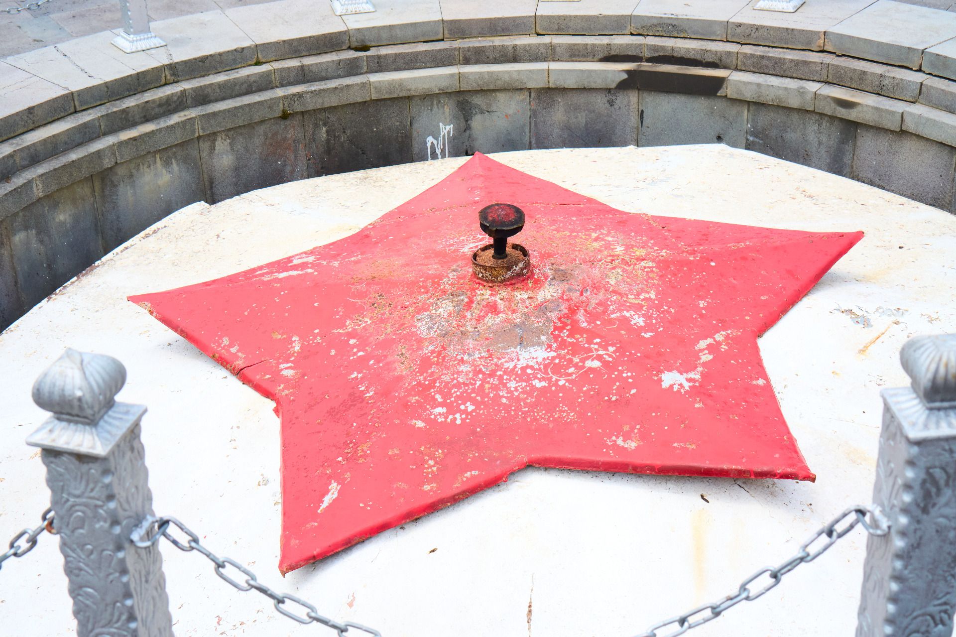 At the bottom of this mountain is an eternal flame within a red star, though the flame was not functioning on this day. I assume it does other times, but I noticed the interesting addition of a more recent development next to the location: a new type of monument. It remains unfinished and undergoing its construction, but I was surprised to see the similarities to its Soviet past. I suspect the eternal flame nearby was turned off for safety reasons pertaining to that new construction taking place, and not something more depressing. I have seen eternal flames in certain regions that are no longer functioning, mostly within Georgia. Where in Armenia even in more remote areas, these monuments are more maintained and appreciated. A little higher up was some traditional Roman-Armenian Christian symbols, a rock with a large cross and Armenian patterns carved out of it. A common sight throughout Armenia, some new, some incredibly old. An overgrown stairway went upward into the mountain. Though it wasn't clear whether it was possible to reach the monument itself.