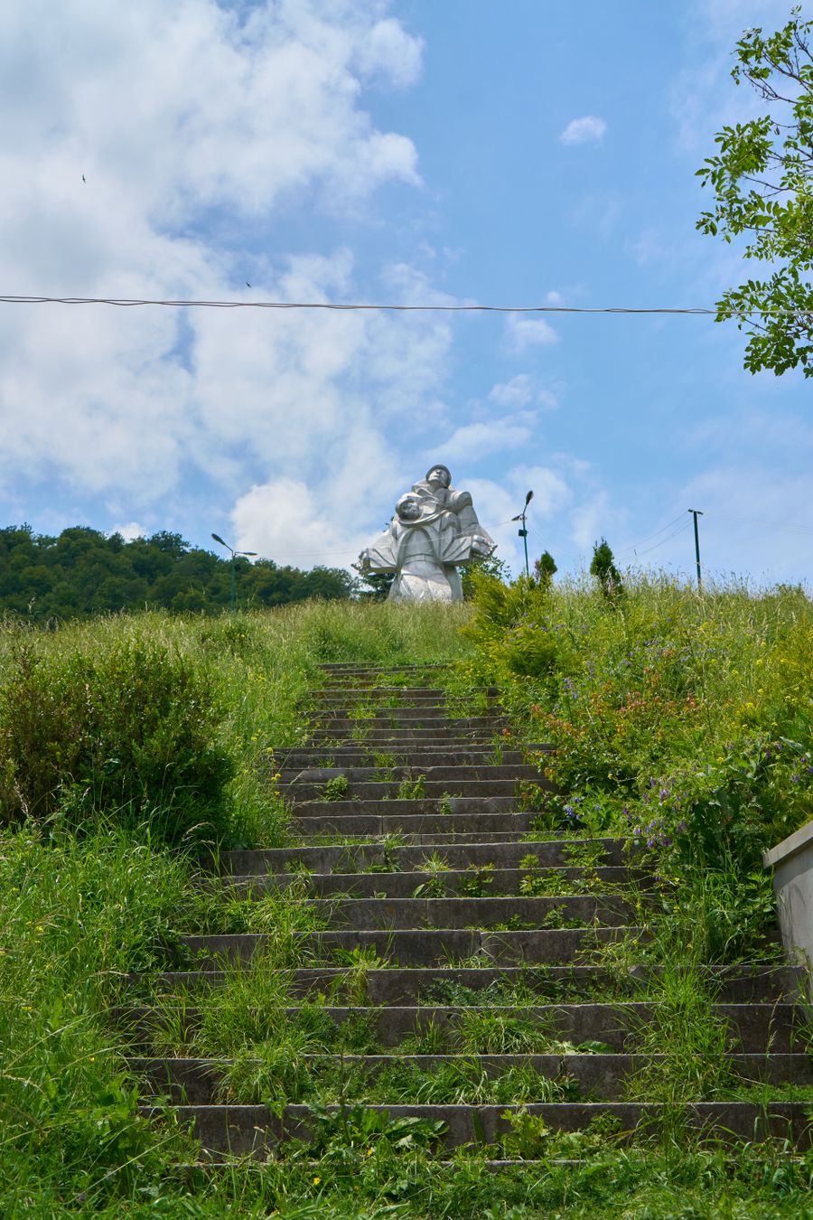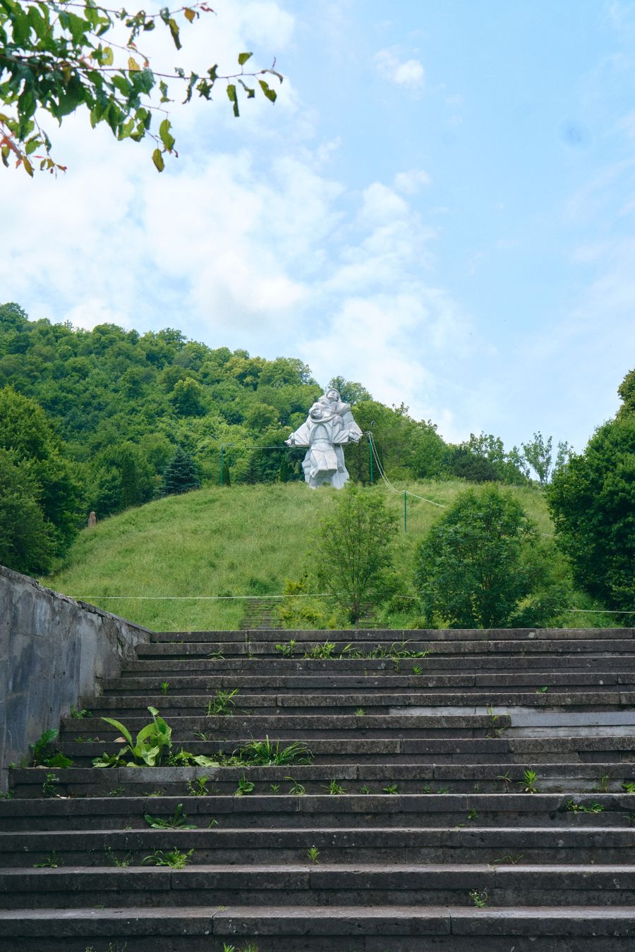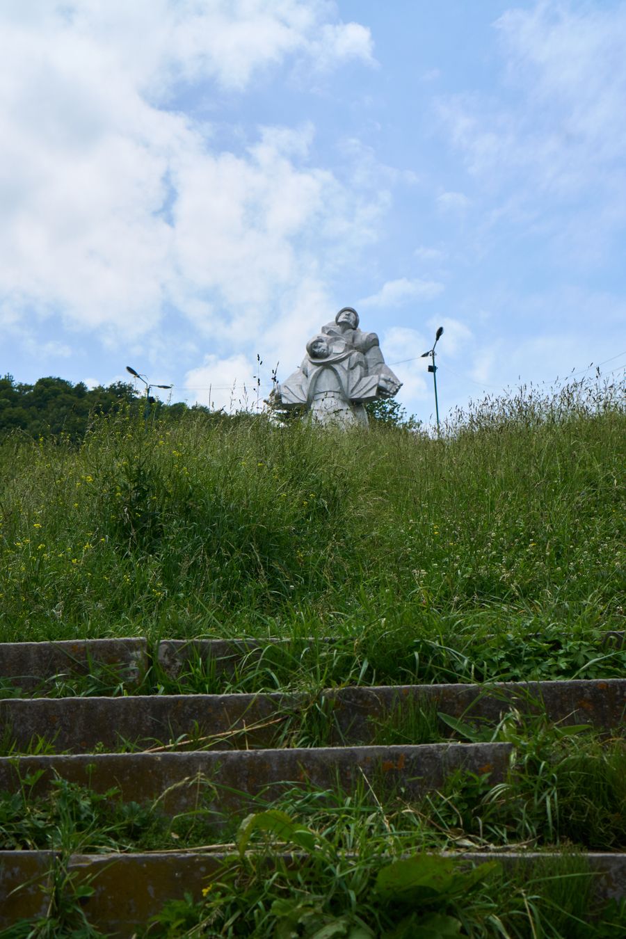While in Dilijan, sipping on a little cappuccino in one of the few cafes in the small town, I roamed through Google Maps in search of unique things nearby to discover. Arriving in the town with little intention to begin with. I saw a Second World War monument that wasn't too far away that seemed like it'd be a good thing to check out. I didn't expect the thing we stumbled into in the end at all. The most powerful monument I've seen, one that really displays the horrors of war and the tragedy regarding the loss of life through it. Monuments of the Soviet era tend to display patriotism and great warriors, strong chiselled men running into battle with little fear. This was the total opposite. Perched up on the top of a mountain, the main monument displayed two soldiers, one holding the other. The one in front falling, injured in battle. Both soldiers depicting a tragic expression of grief.