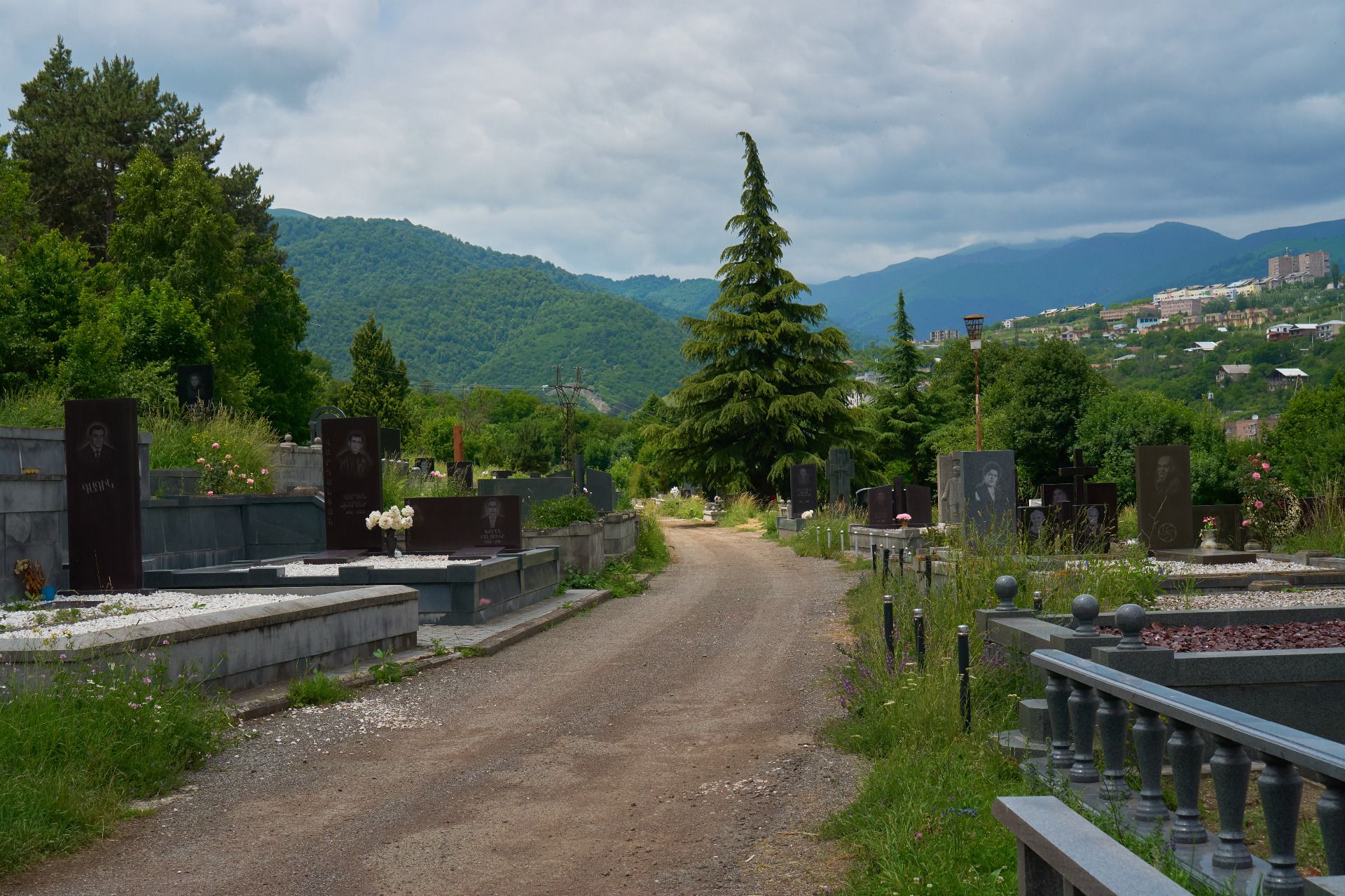 My curiosity got the best of me, and despite wearing shorts I figured I'd try to find a way up. Avoiding the insects and of course potential ticks in the overgrowth. The stairway to my surprise, still relatively overgrown, didn't go straight up the mountain like a cascade, but instead went around it. A steep little walk but not too difficult compared to how it looked. I reached the top and felt the power of the monument even more. Reaching an old graveyard that kept the citizens of Dilijan at rest, some more recent than others. Large prints of the people that lived and died in the area. Many unfortunately at a very young age, and not from war. To the side was a more of the monument, displaying the years of the war and the names of those that had died. Clear differences in the Soviet side of the monument and the more modern cemetery. I walked briefly throughout it and looked at some of the names and faces. The beautiful backdrop of Dilijan's vast forestry and mountains painted a less depressing picture of the location. These people really were at rest here. Far from the noise of cars, far from the development of cities. Resting within the breeze of the trees that flowed down from the mountains above.