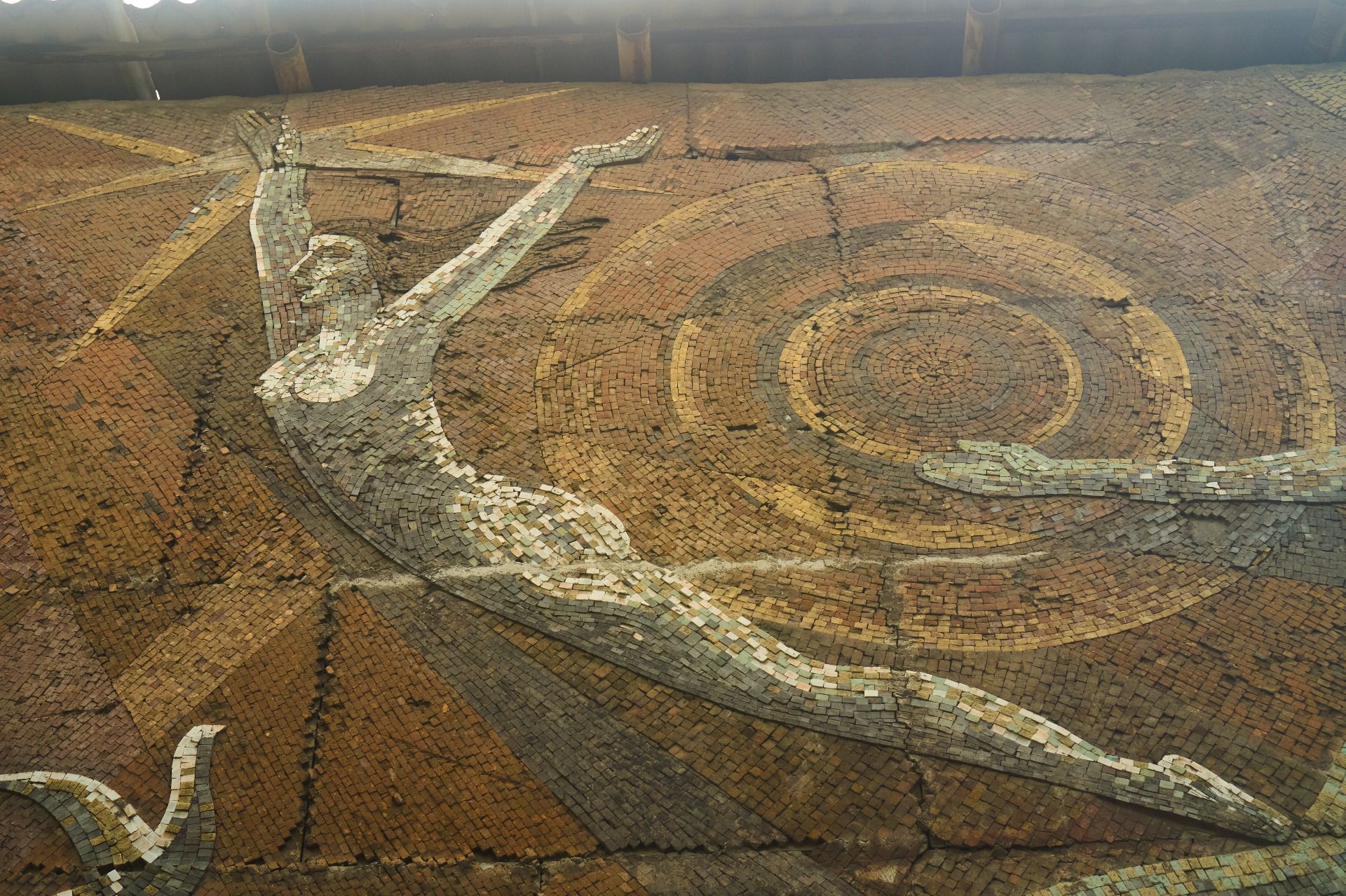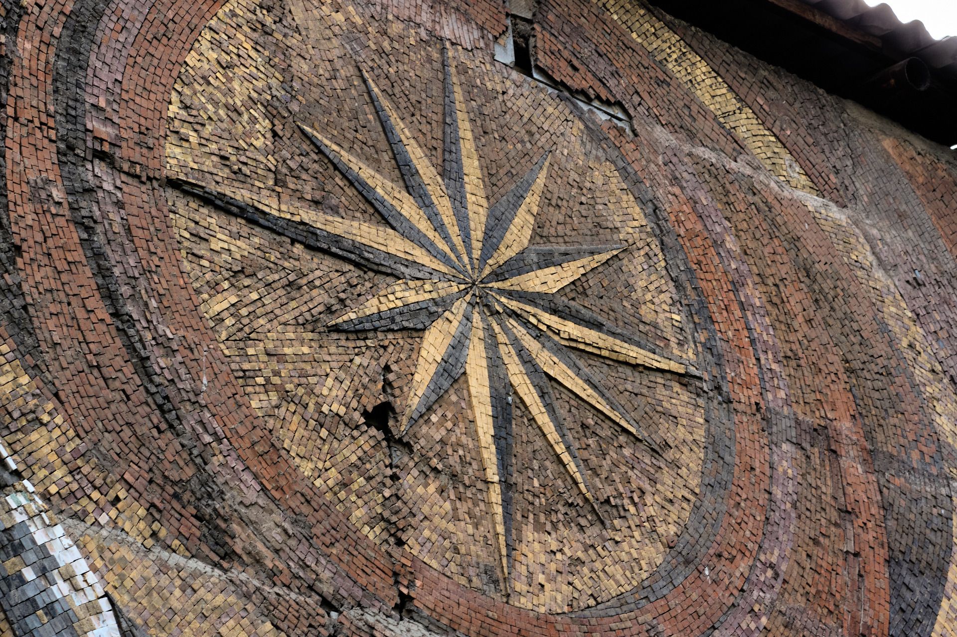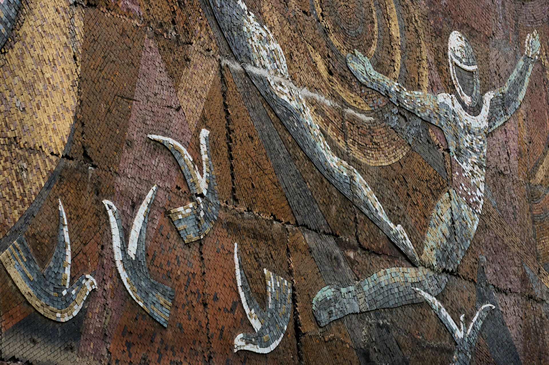 The mosaic itself depicts Cosmonauts floating through space, with some themes of flight seen through the addition of birds flying with them. Saturn is seen with its rings, and I think some of the other imagery symbolises other features within deep space: the sun and its rays, the galaxy and its shape, the many starts that fill the night sky. Men and women together reaching up into the Heavens. Within the centre, one Cosmonaut looking as if he's coming right through the middle, about to jump through the mosaic and into the real world. An incredibly beautiful design, and found within such an odd space. Though many at the time would've taken appreciation of it. The workers finding their morale boosted knowing their work efforts went to propelling the Soviet people forward as they came and went from their difficult factory jobs.