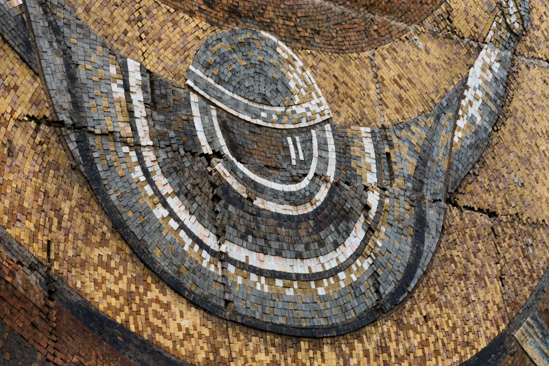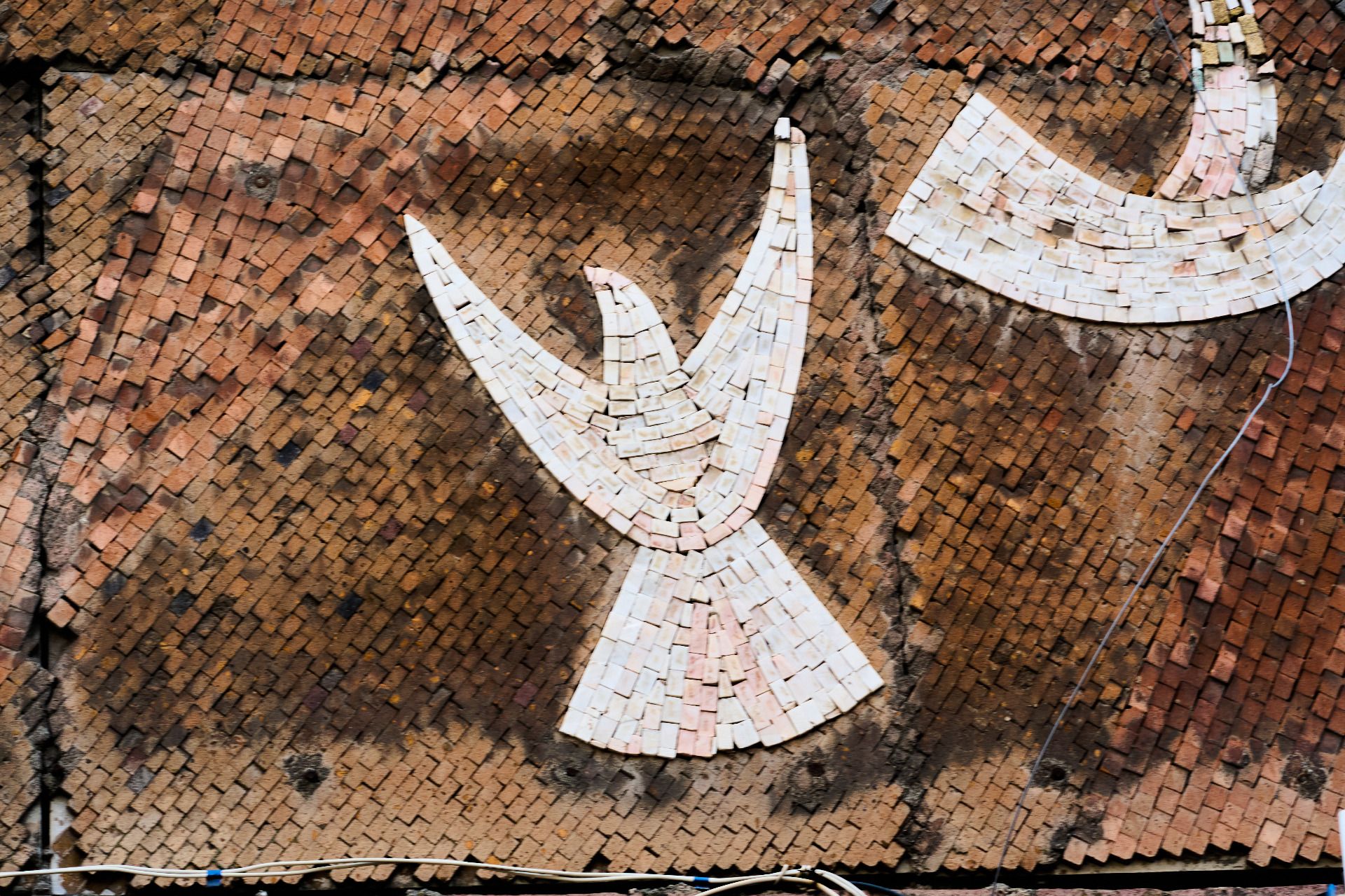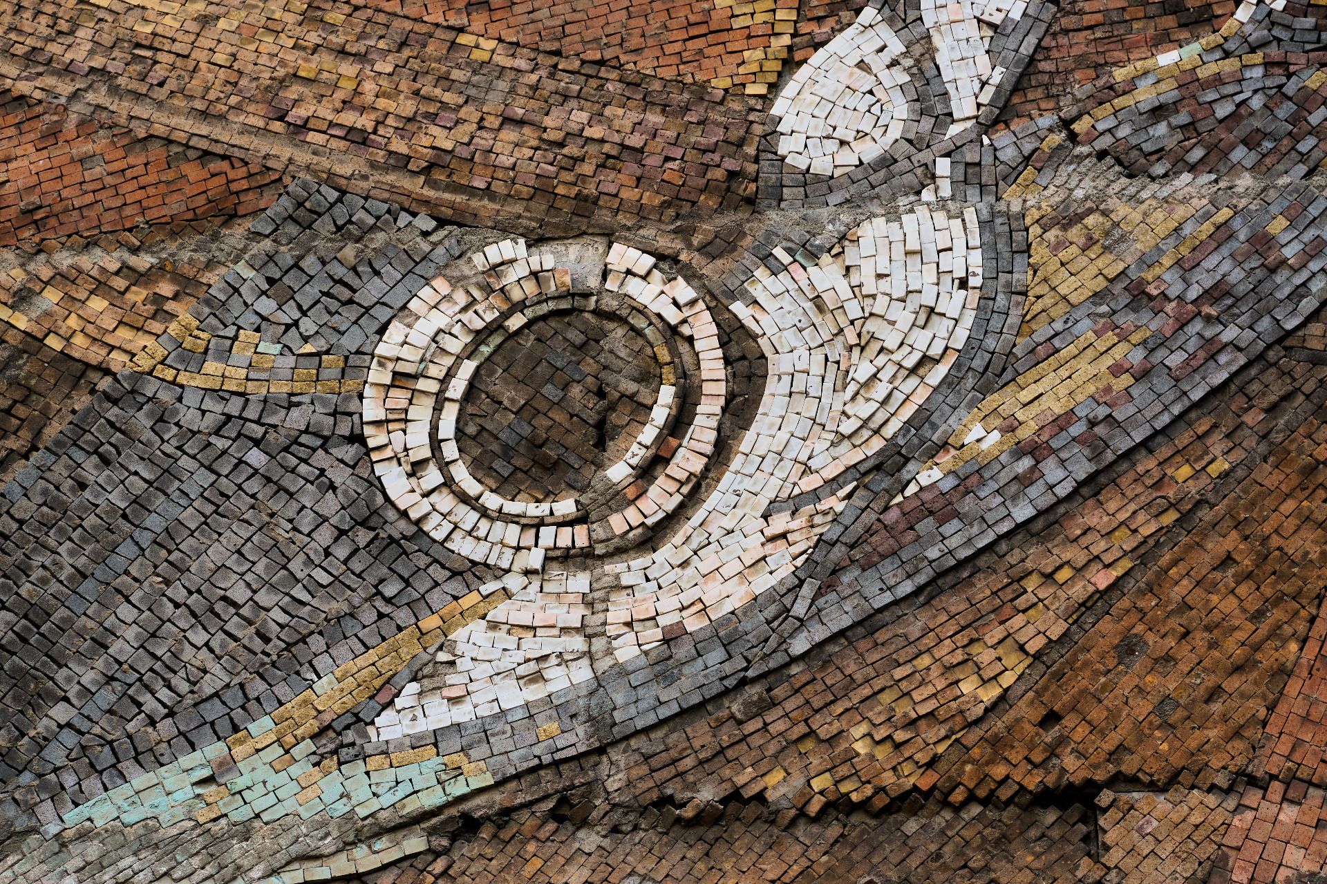 The mosaic itself depicts Cosmonauts floating through space, with some themes of flight seen through the addition of birds flying with them. Saturn is seen with its rings, and I think some of the other imagery symbolises other features within deep space: the sun and its rays, the galaxy and its shape, the many starts that fill the night sky. Men and women together reaching up into the Heavens. Within the centre, one Cosmonaut looking as if he's coming right through the middle, about to jump through the mosaic and into the real world. An incredibly beautiful design, and found within such an odd space. Though many at the time would've taken appreciation of it. The workers finding their morale boosted knowing their work efforts went to propelling the Soviet people forward as they came and went from their difficult factory jobs.