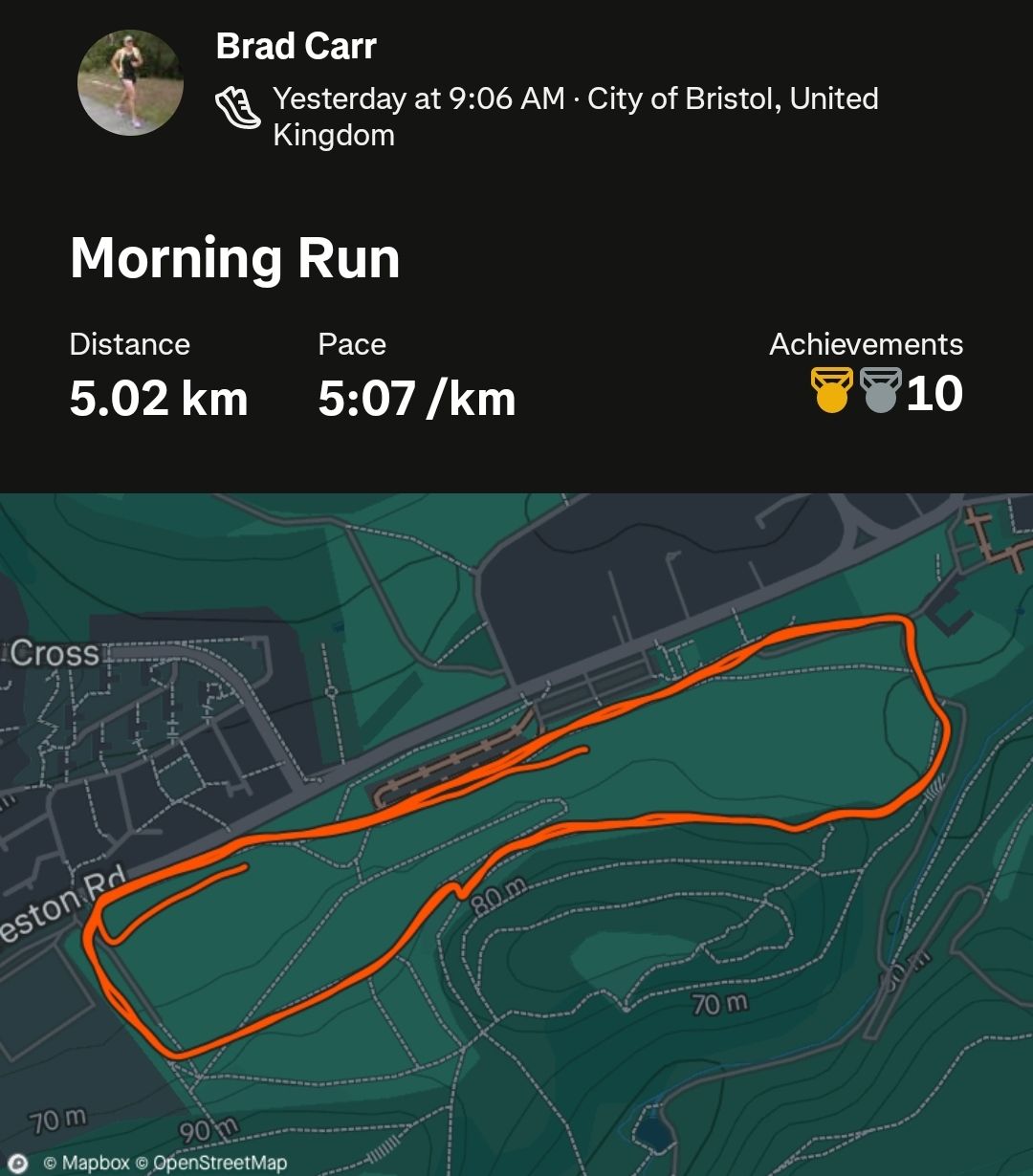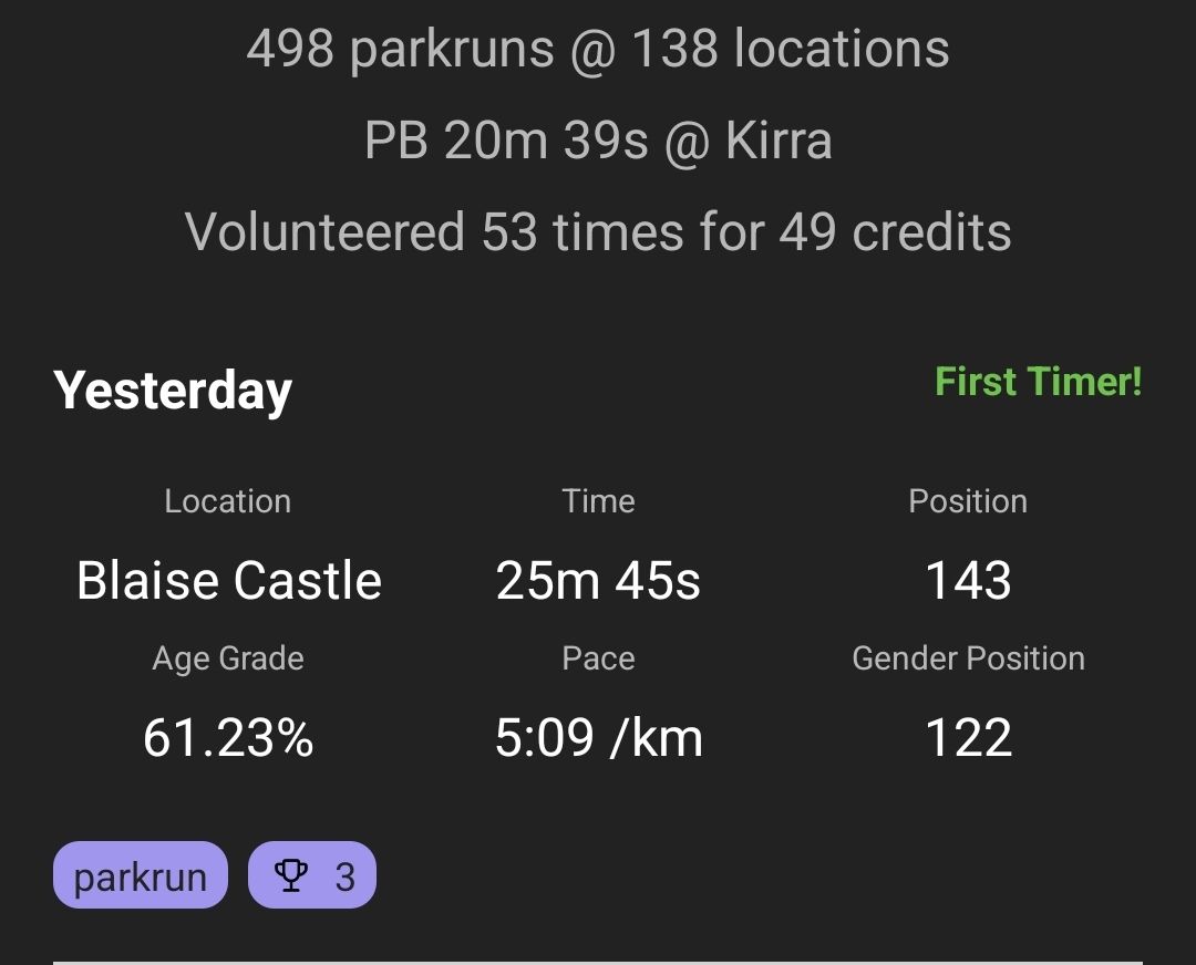 Our first English parkrun and our seventh parkrun country. We were staying nearby in Portishead just outside of Bristol. We arrived early enough and I thought I had everything sorted but we needed to pay for parking. I could not believe the machine would only take coins or you have to down load an app. The parking app would not set up because I needed a local phone number and we were travelling with a data esim. Oh the last minute first world problems. I could have just moved the car to so nearby street but luckily for us. Another parkrunner saw us struggling of offered to pay. I accepted and offered to pay for coffee after with my card. The world can still be a nice place. For me parkrun just seems to bring the best out in people.This place had great facilities and parking. It was a pretty big parkrun and the cafe was full after the event but a great way to meet a few of the locals.The course was pretty much like this most of the way, a now well worn path by all the weekly parkrunners.All the travelling must be taking it out of me I was working so hard for a 25:45 minute parkrun that or I just must be getting old.Ha the 3:58 pace was just the finishing sprint to the end.The Castle or folly as one local described it. I suppose it was more just a tower but still interesting enough for a Australian tourist. None of parkruns have one back home.