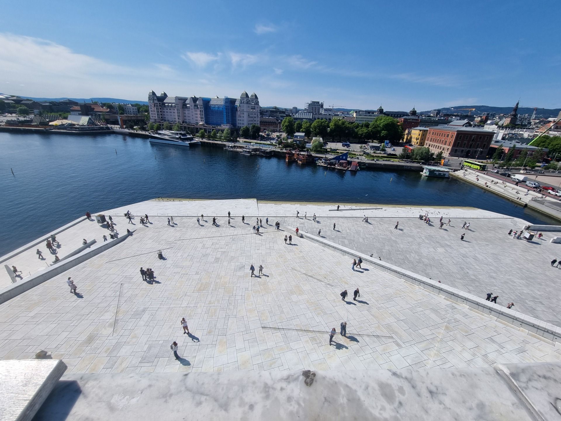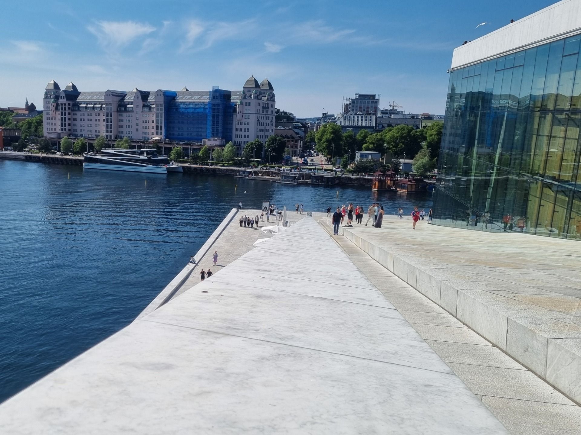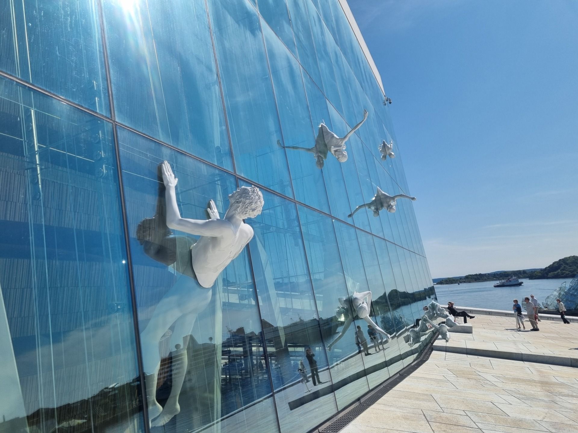 We have seen the Oslo Opera house on many you tube clips. It was even more impressive in real life. The Italian white marble from Carrara was so bright on a very sunny day. It sort of rose like an ice burg out of the bay. They reckon it gets covered in ice and snow in winter, it would be fun to ski or slide down. It reminds me a bit of the Sydney Opera House back home. The shape is completely different but in a prominent position right on the water makes it very similar. I like the look of the Sydney Opera house better, maybe I am a little bias but I loved the fact that you could easily walk to the top of this one in Oslo and get a great view all over the city. We did not go inside but I could have easily enjoyed walking to the viewing points on it's roof line every day we were there. It was a pretty busy place with international tourists from many different countries photographing the sculptures on the mirrored glass walls.I would not want to get too close to that water edges as it looks green and slippery A great looking day but still a bit cold for us to get in the water.The sculptures must have be stuck or glued onto the windows, I could not really get close enough to tell, as the area was roped off with a security guard.Nice to see a bit of wildlife enjoying the surrounds as well.