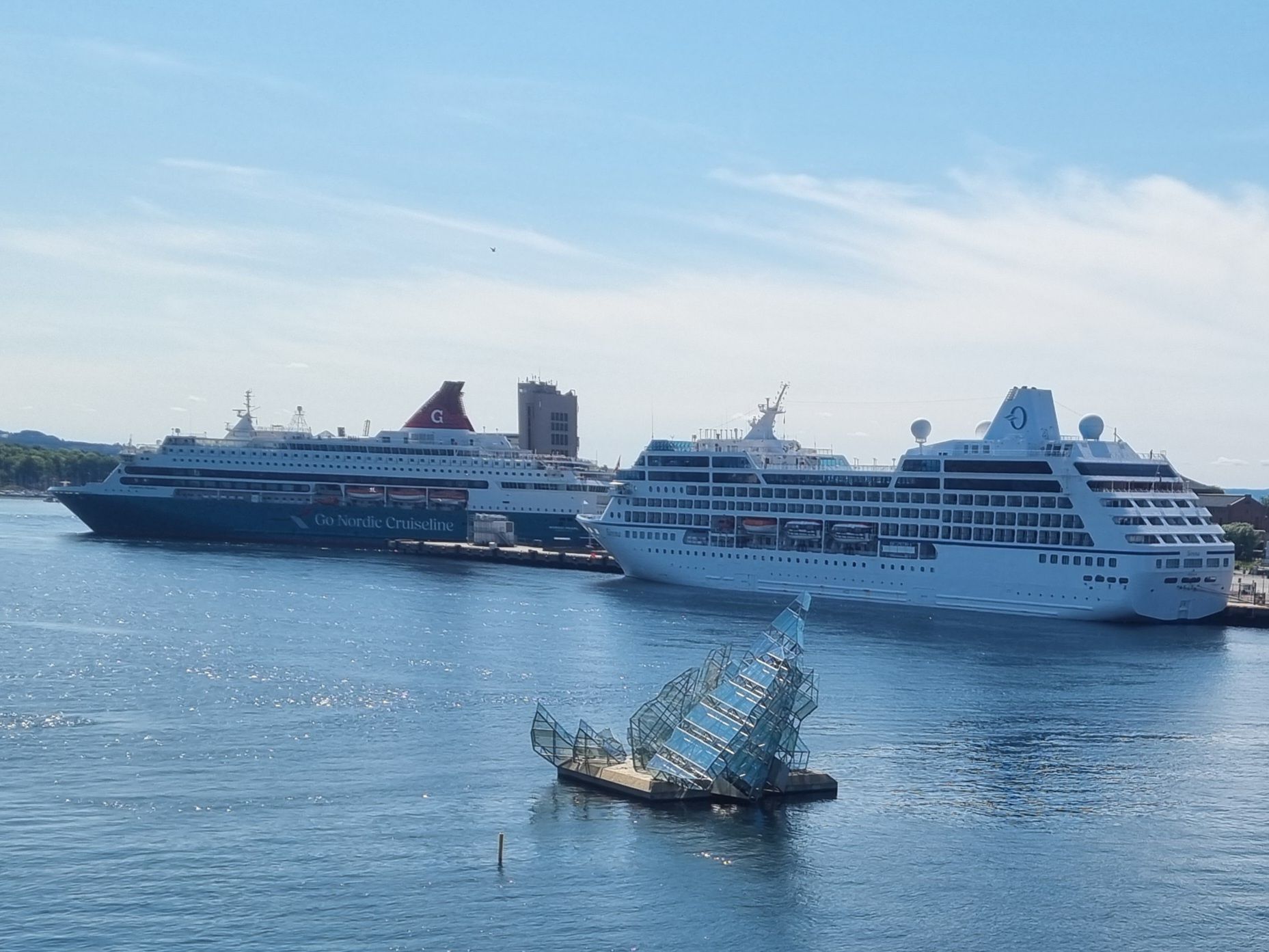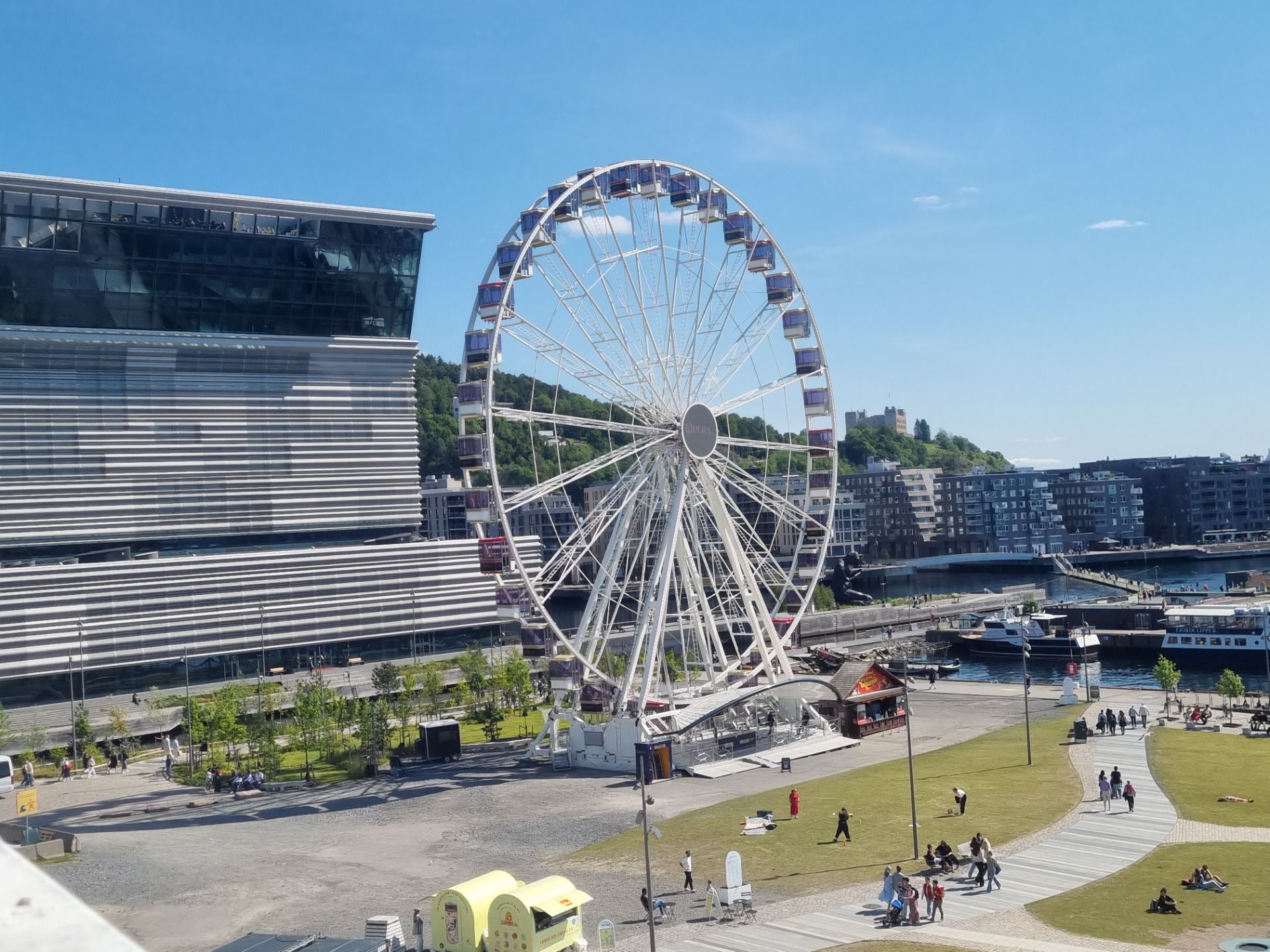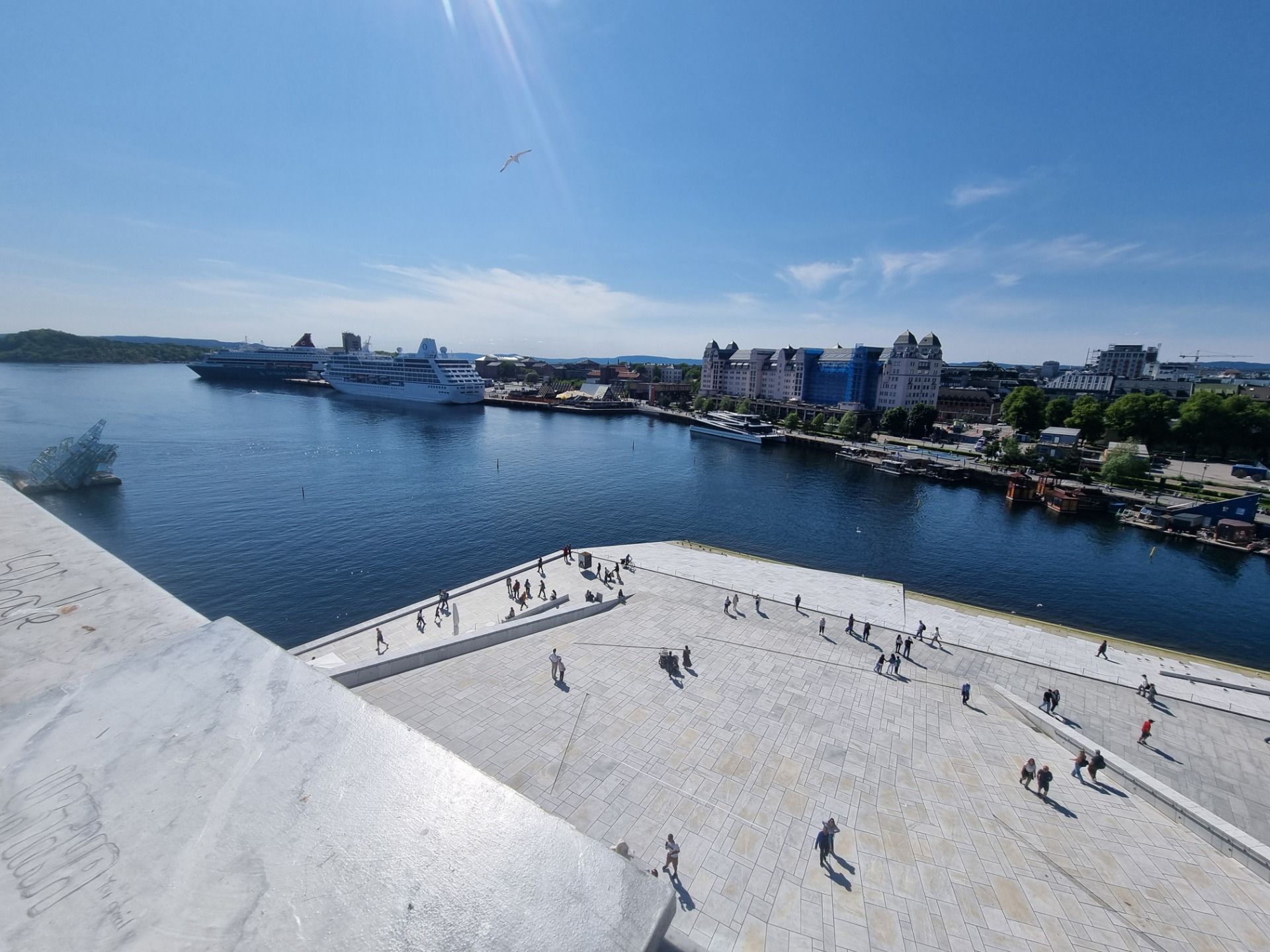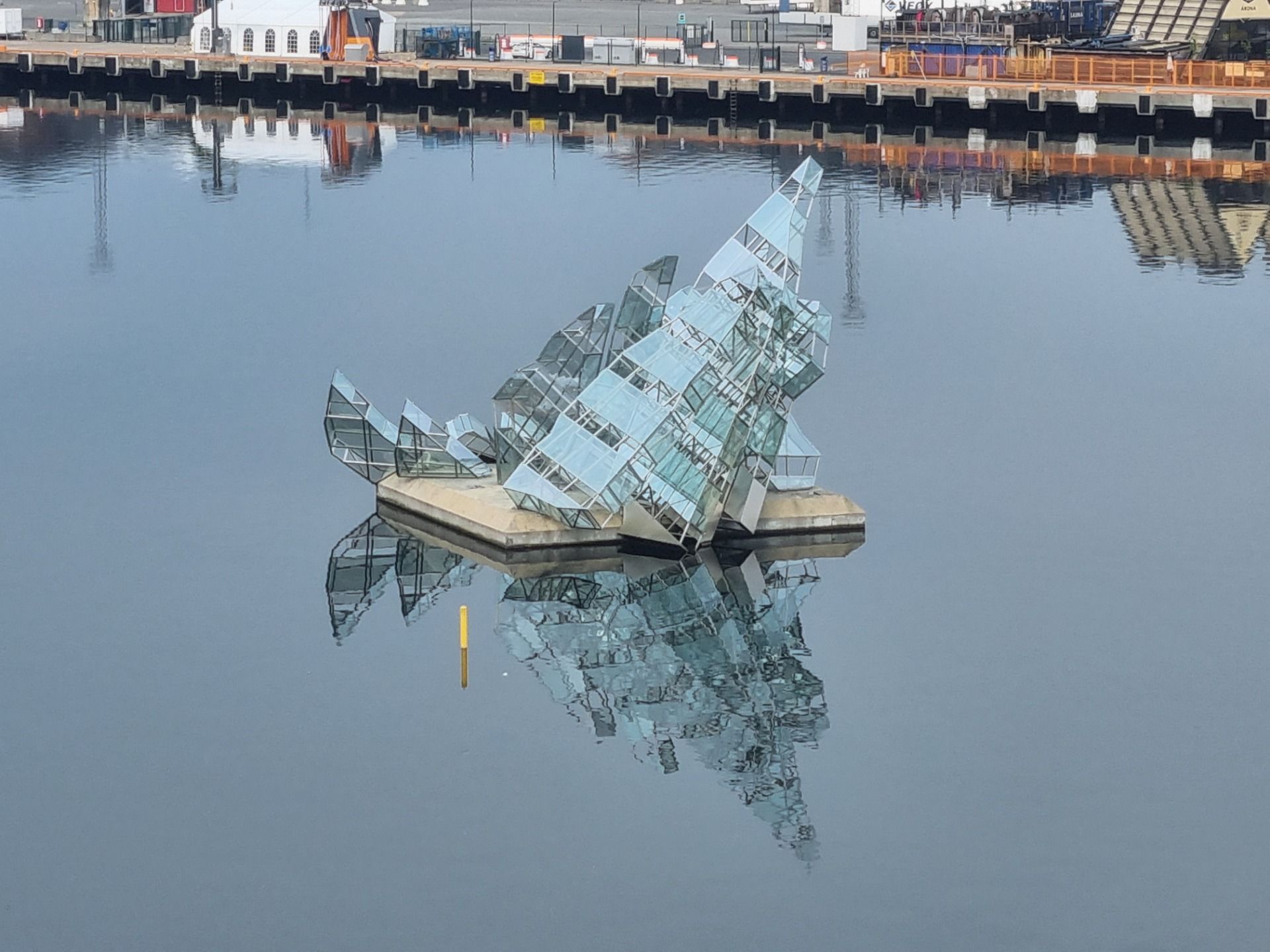 We have seen the Oslo Opera house on many you tube clips. It was even more impressive in real life. The Italian white marble from Carrara was so bright on a very sunny day. It sort of rose like an ice burg out of the bay. They reckon it gets covered in ice and snow in winter, it would be fun to ski or slide down. It reminds me a bit of the Sydney Opera House back home. The shape is completely different but in a prominent position right on the water makes it very similar. I like the look of the Sydney Opera house better, maybe I am a little bias but I loved the fact that you could easily walk to the top of this one in Oslo and get a great view all over the city. We did not go inside but I could have easily enjoyed walking to the viewing points on it's roof line every day we were there. It was a pretty busy place with international tourists from many different countries photographing the sculptures on the mirrored glass walls.I would not want to get too close to that water edges as it looks green and slippery A great looking day but still a bit cold for us to get in the water.The sculptures must have be stuck or glued onto the windows, I could not really get close enough to tell, as the area was roped off with a security guard.Nice to see a bit of wildlife enjoying the surrounds as well.