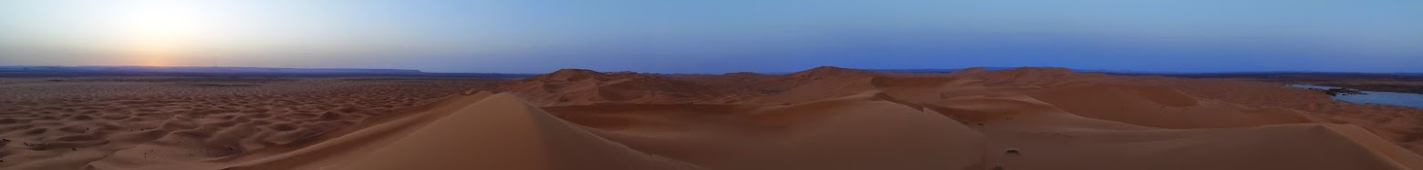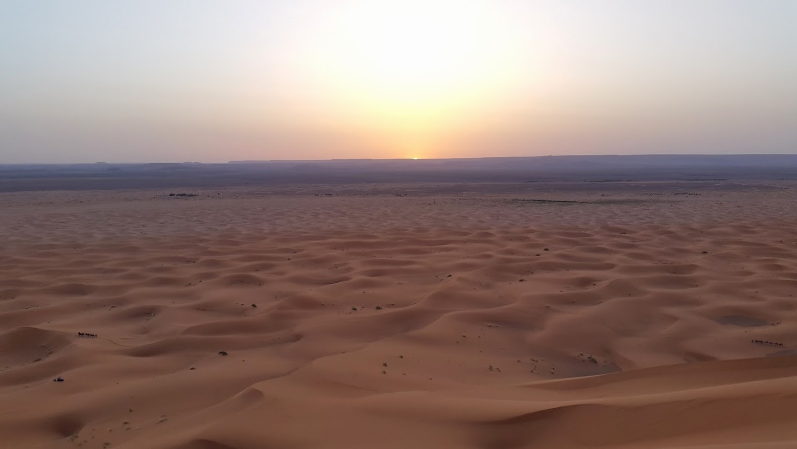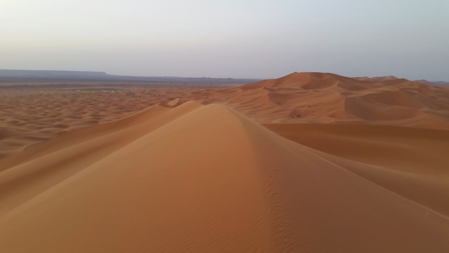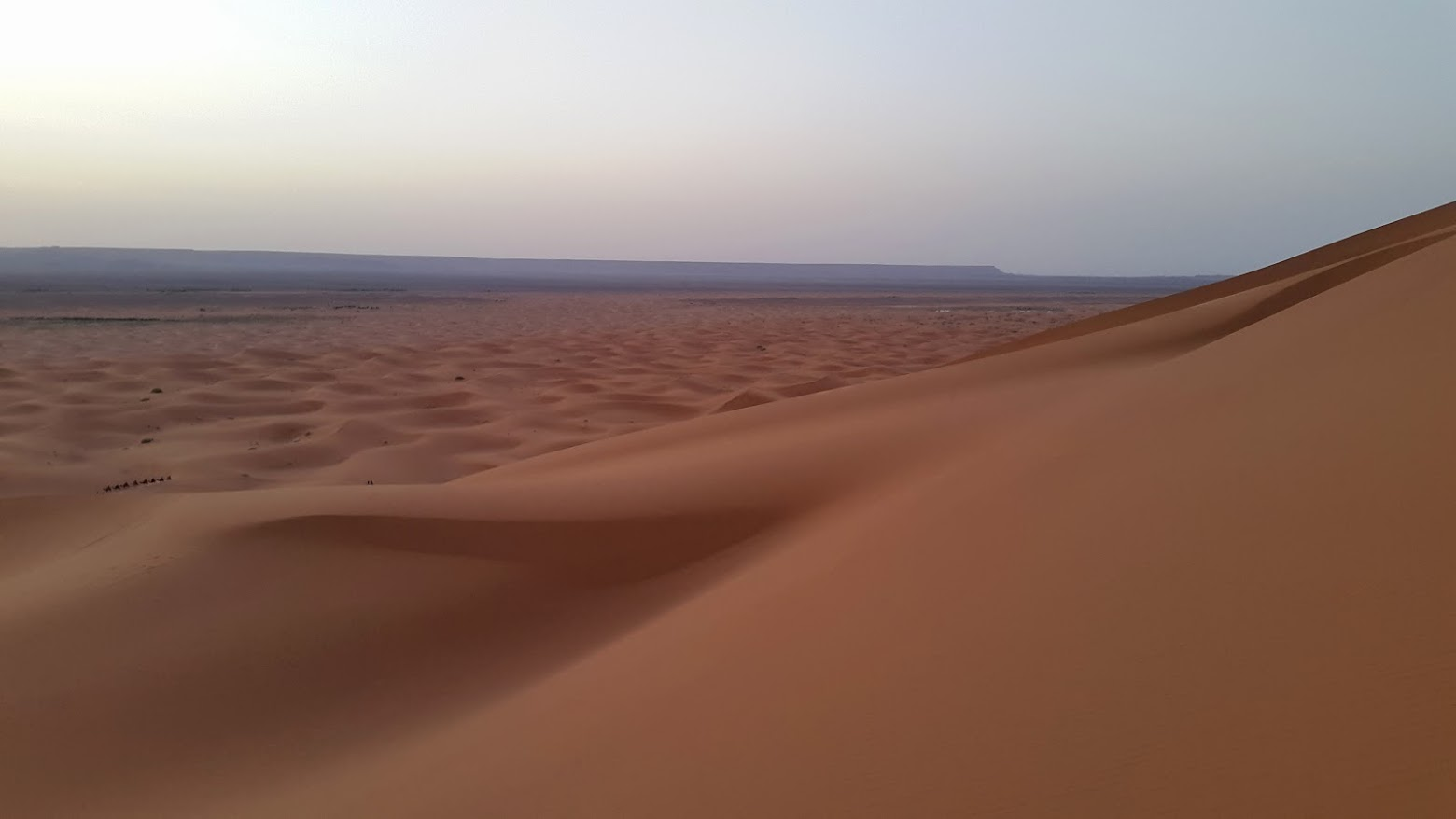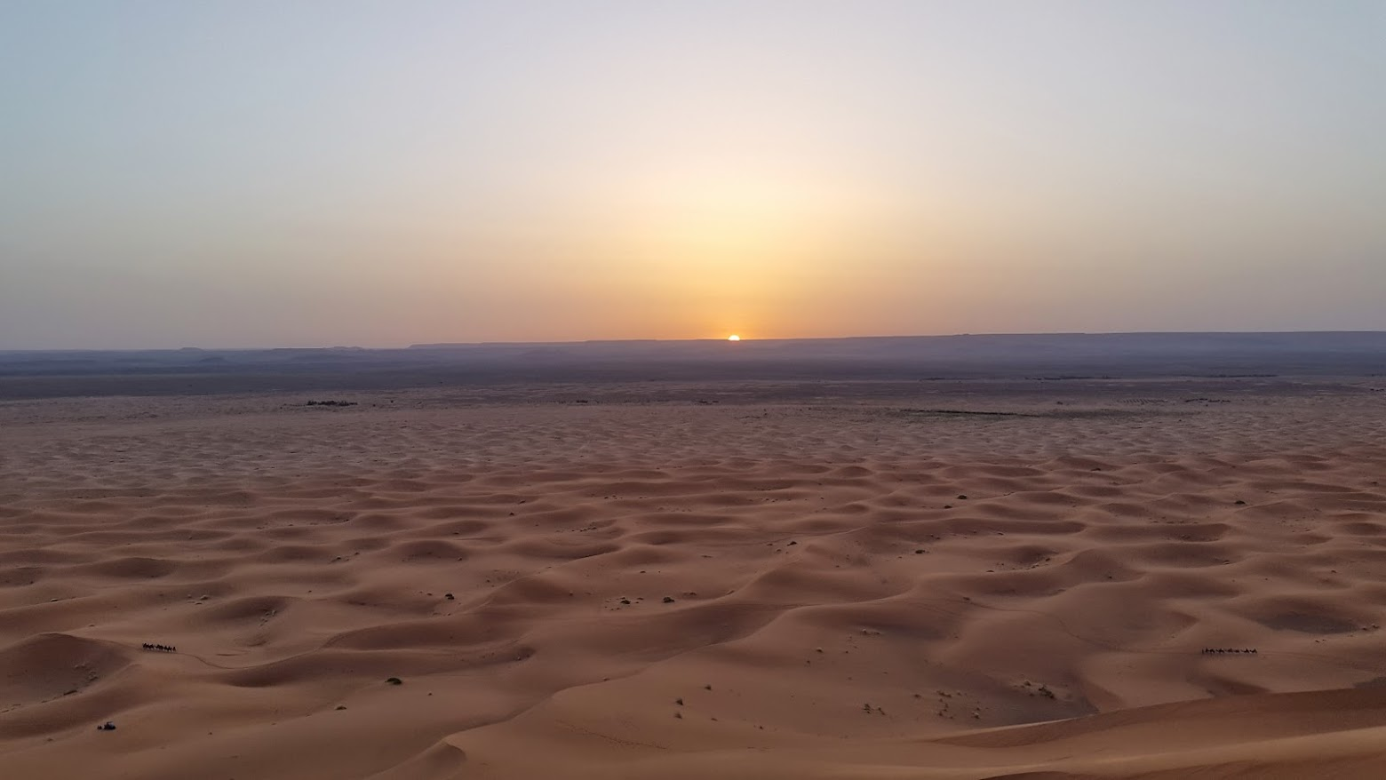 We leave the car and we climb a sand dune in order to have the best view possible to the sunrise. Climbing a sand dune is a thing - you make two steps up and it brings you one step down. As soon as I manage to make it to the top the happiness and excitement are beyond words and expressions. Minutes before sunrise we see convoys of camels bringing tourists for the same reason. From far they look like ants on a perfectly synchronised parade in this sea of sand - that's how Sahara looked to me: A sea of sand with paused waves.