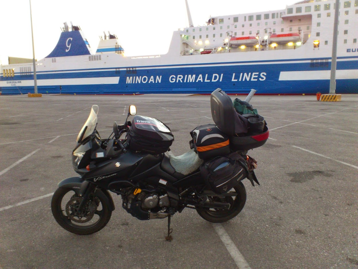 On a hot late August day I have just rode all the way from the South East end of Attiki region up to the port of Patra (Greece) in order to take the ferry up to Trieste (Italy). Here's my loaded trusty donkey waiting to enter that long ferry in the back.
