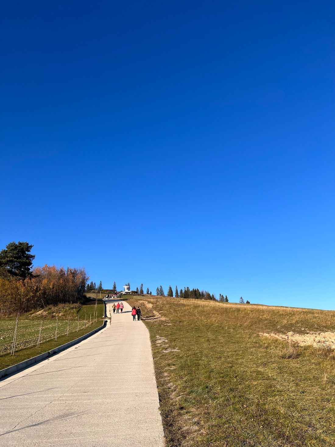Na szczyt wzgórza wiedzie kilkusetmetrowa trasa, niezbyt długa ale o dość sporym nachyleniu, więc można się trochę "zmachać". W tak piękny i słoneczny dzień odrobina wysiłku jak najbardziej wskazana na dotlenienie mózgu i poprawę krążenia.