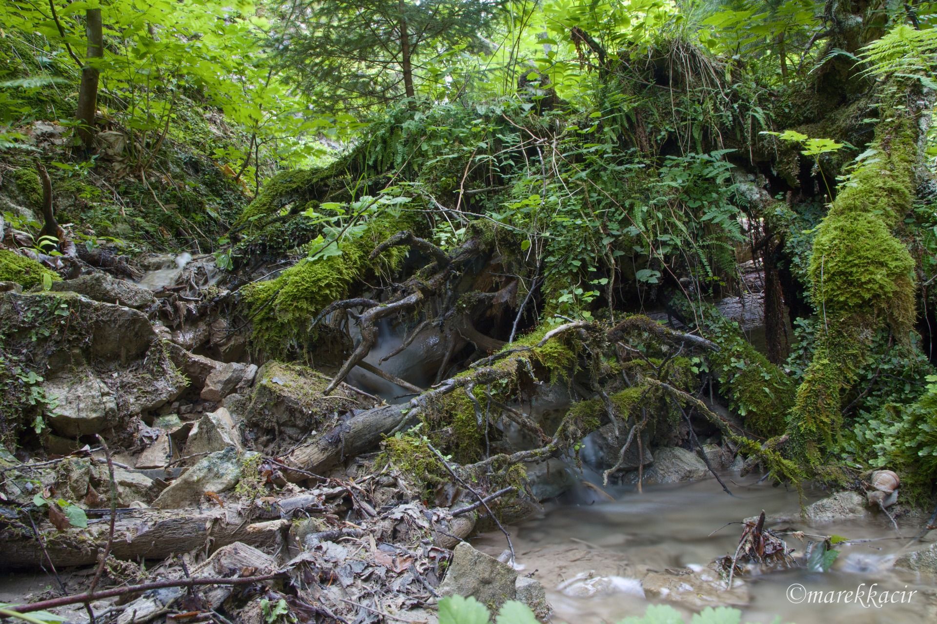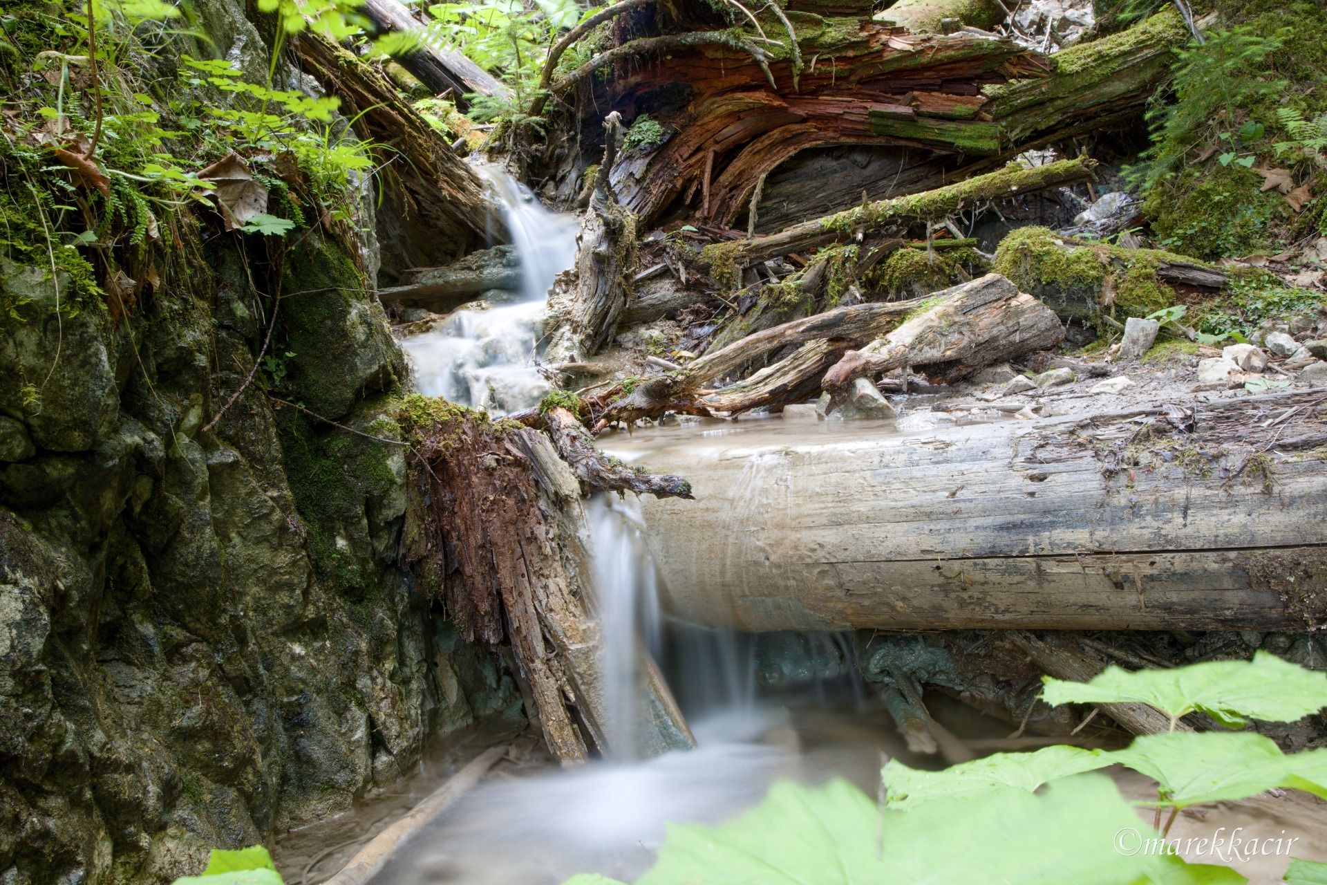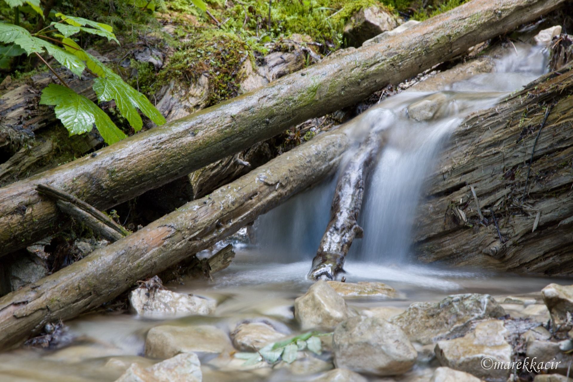 I stop at a small waterfall, which was created by a fallen tree. In the photo, I try to capture running water using a longer exposure.