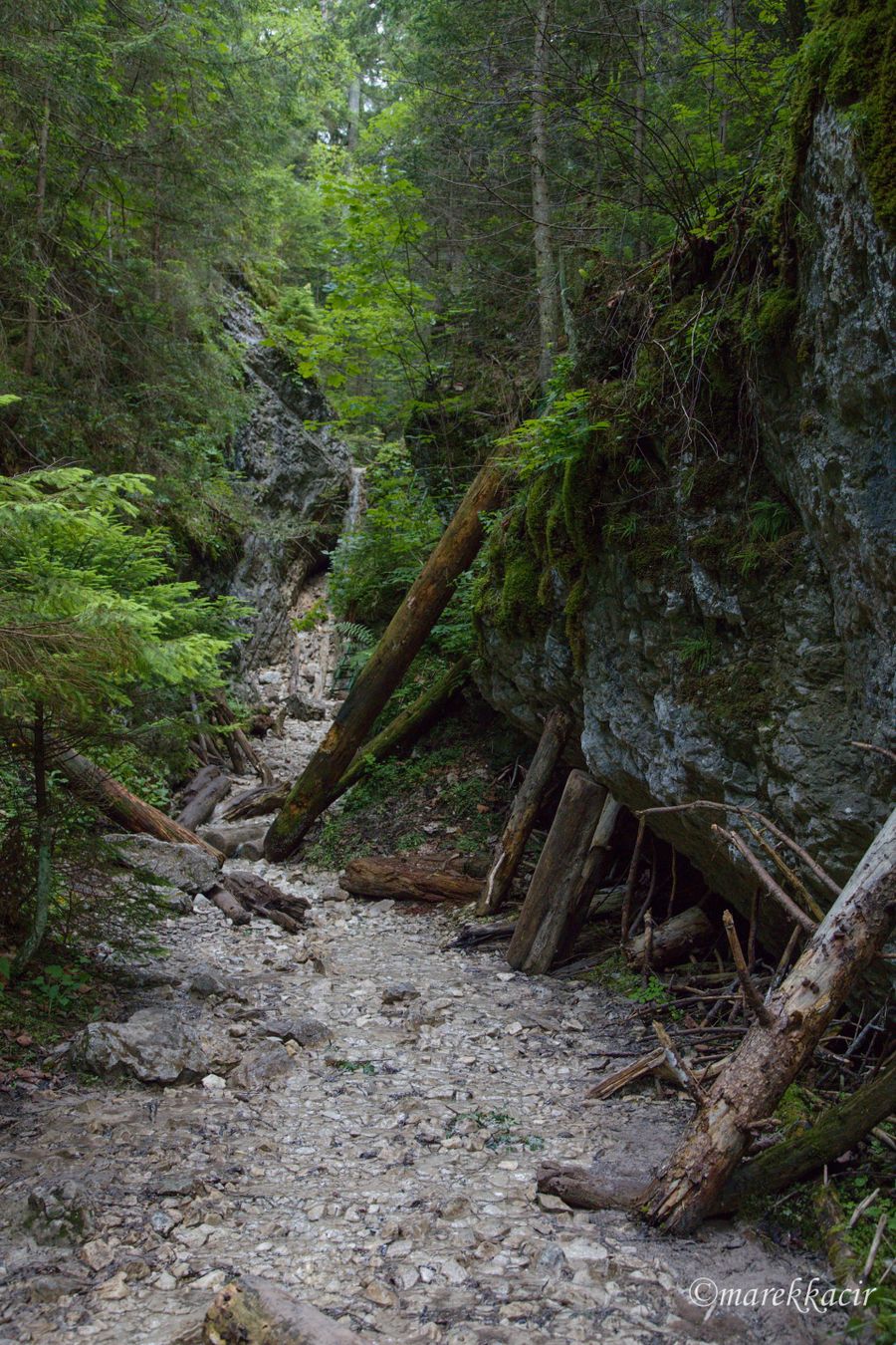 Fallen trees and narrow gorge passages created by water. This is the Monastery Gorge.