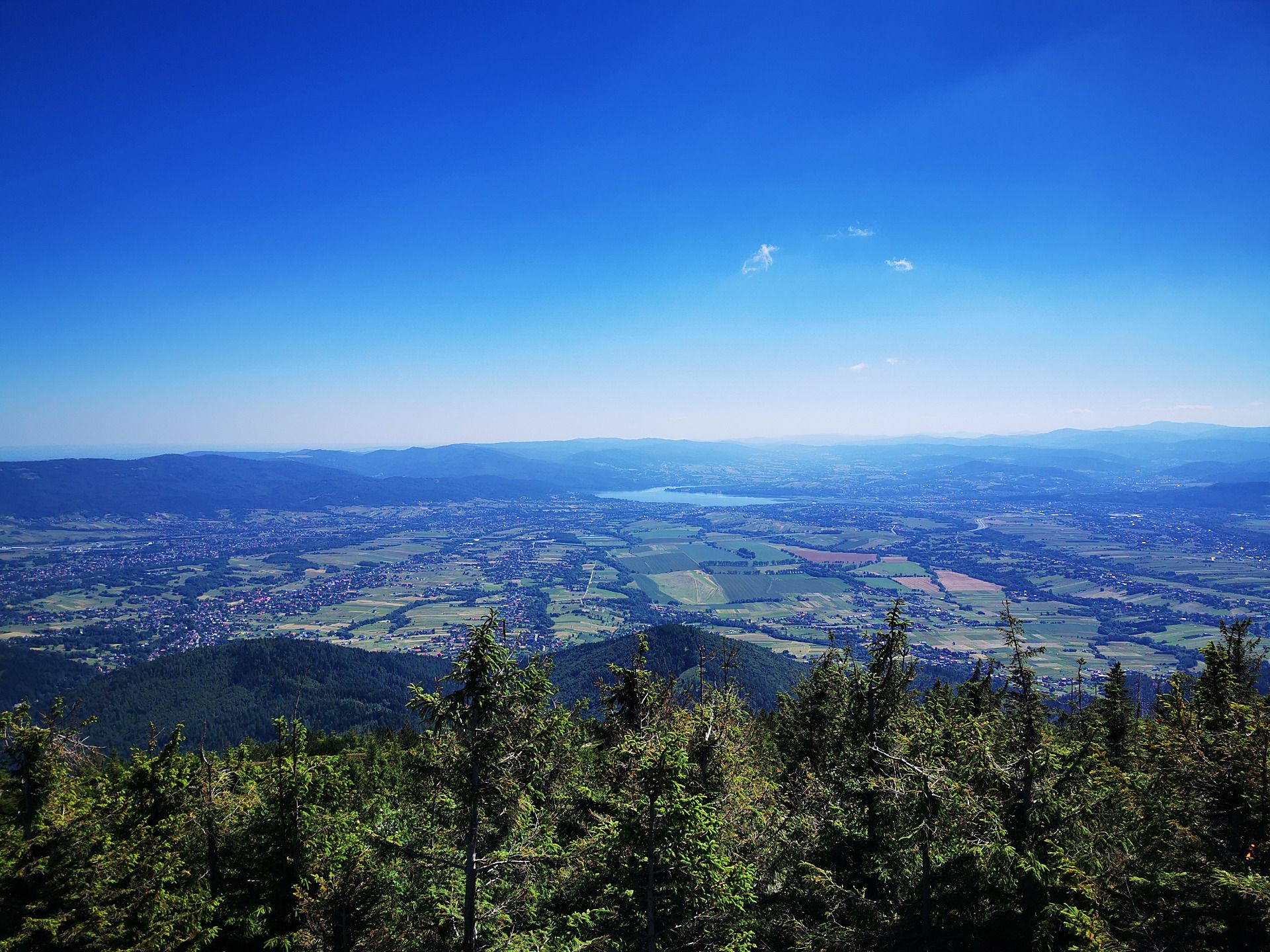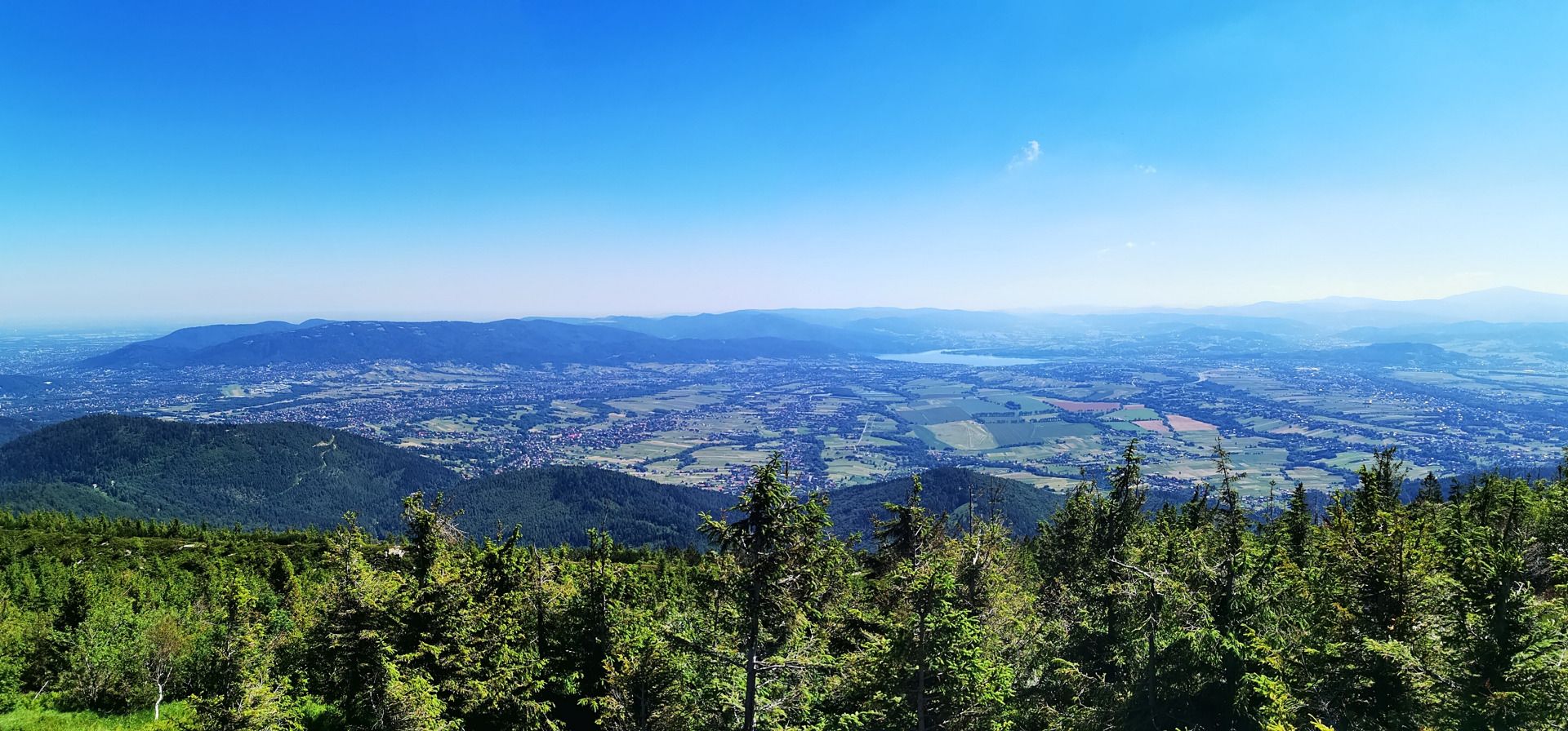 Patrząc na wschód ze szczytu Skrzycznego (1252 m n.p.m.), roztacza się przed nami piękna panorama na całą Żywiecczyznę, z Jeziorem Żywieckim w centralnym punkcie, po lewej widoczne jest pasmo górskie Beskidu Małego.