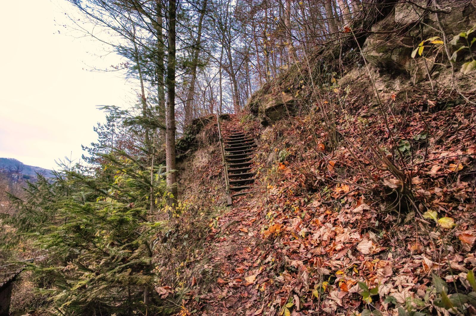 Then you have to get up a narrow, steep and winding trail that also includes this iron stairway. Now, in autumn, the ground is covered with leaves as well. So I would highly recommend wearing hiking boots and using hiking sticks!