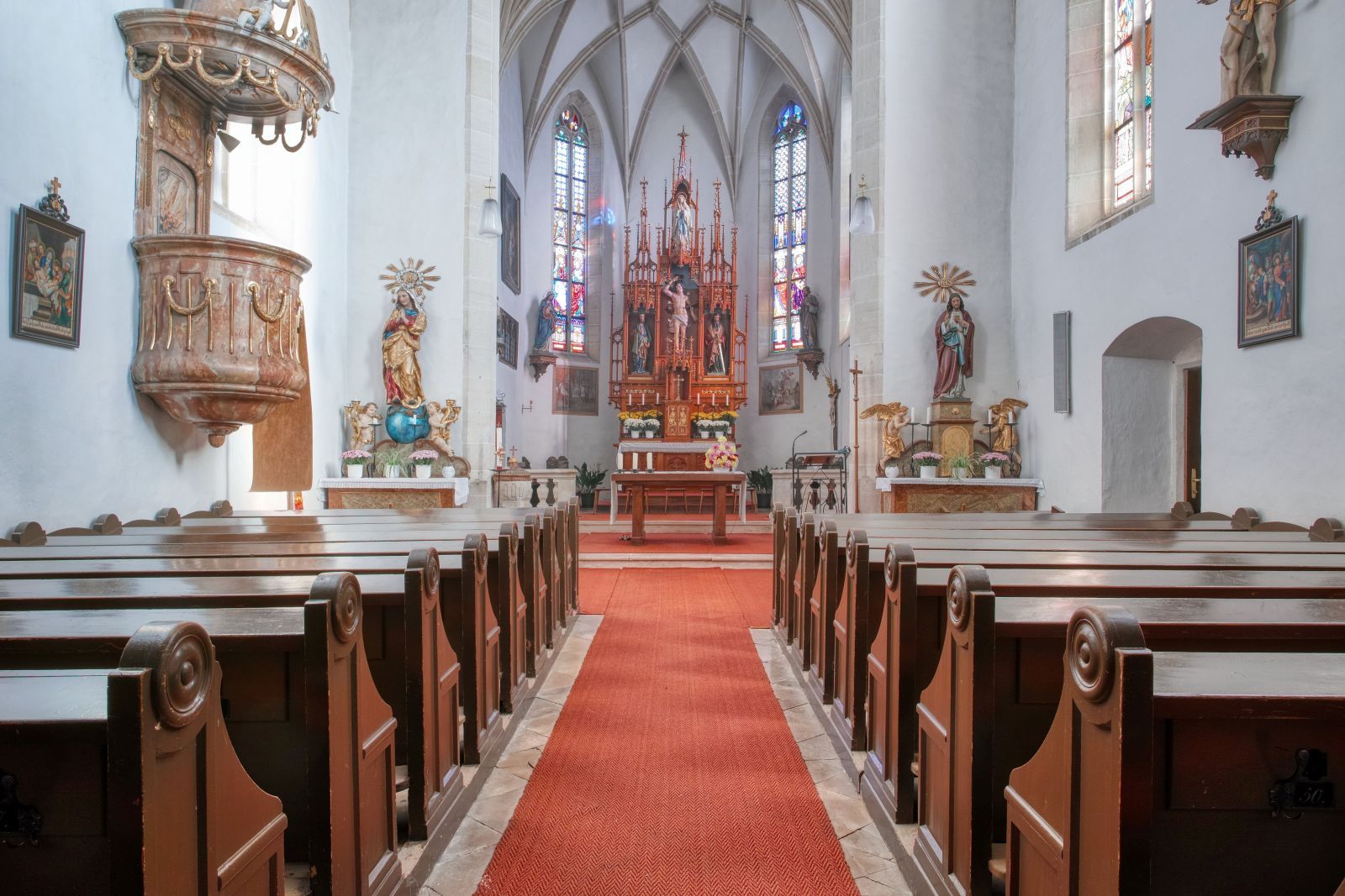 The church is sacrified to Holy Sebastian. The church itself is gothic, but the altar is neogothic and only a little bit more than 100 years old.