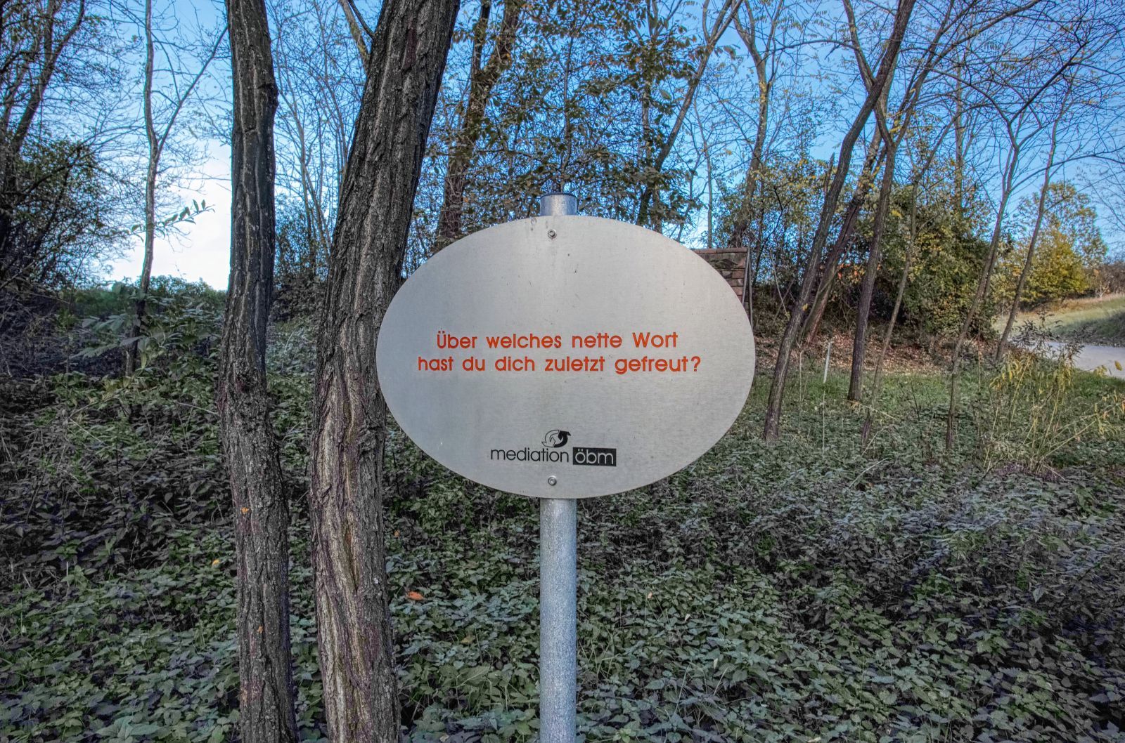 On the left side of the street you can enter the "Weg des guten Gesprächs" ("Way of good talk"). This is a small meditation area in a small piece of woodland. Various signs ask things you should think and meditate about. This sign for example asks you what has been the last nice word that made you happy.